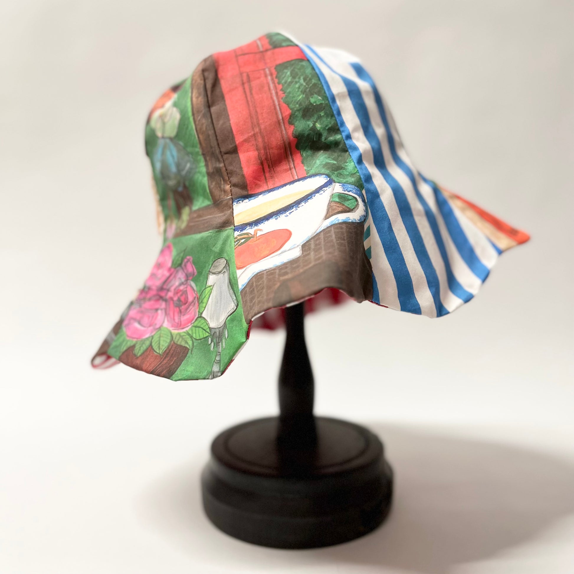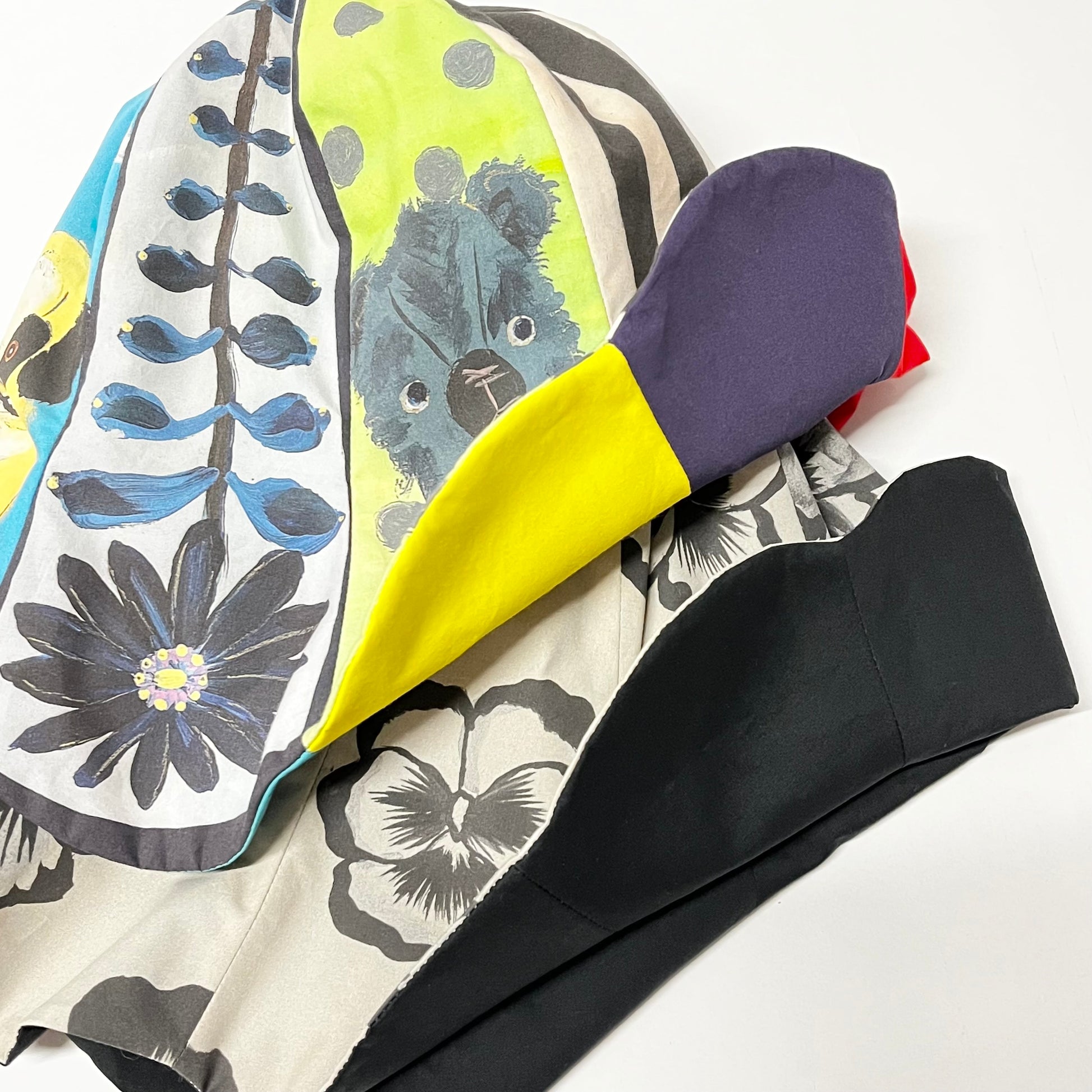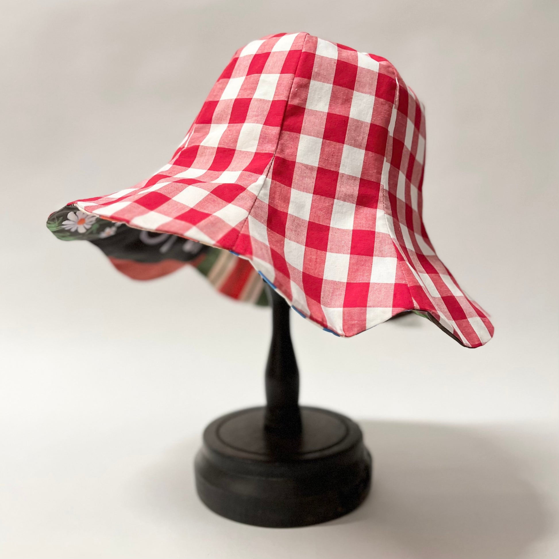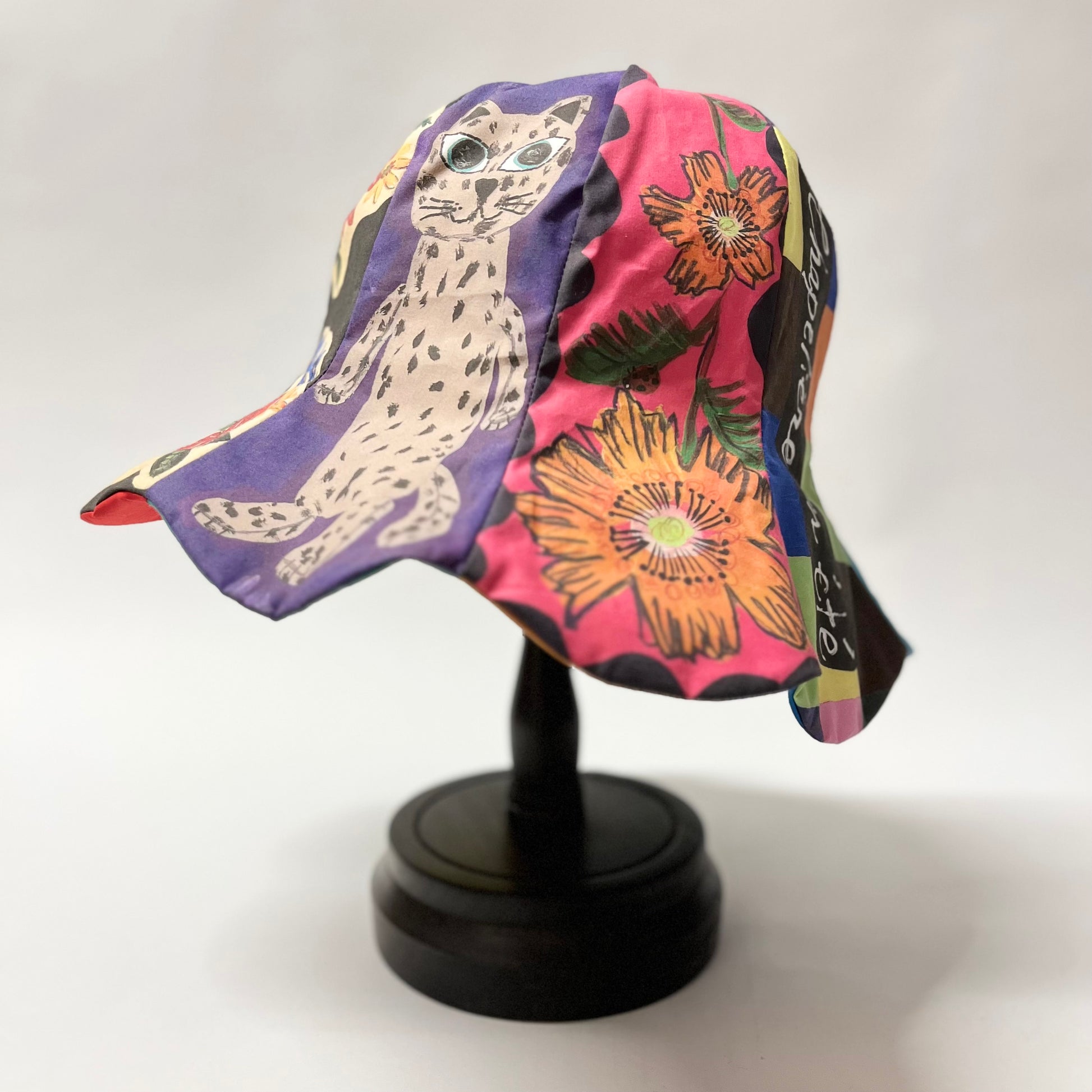 オリジナルプリント生地を使用して仕立てたチューリップハット。