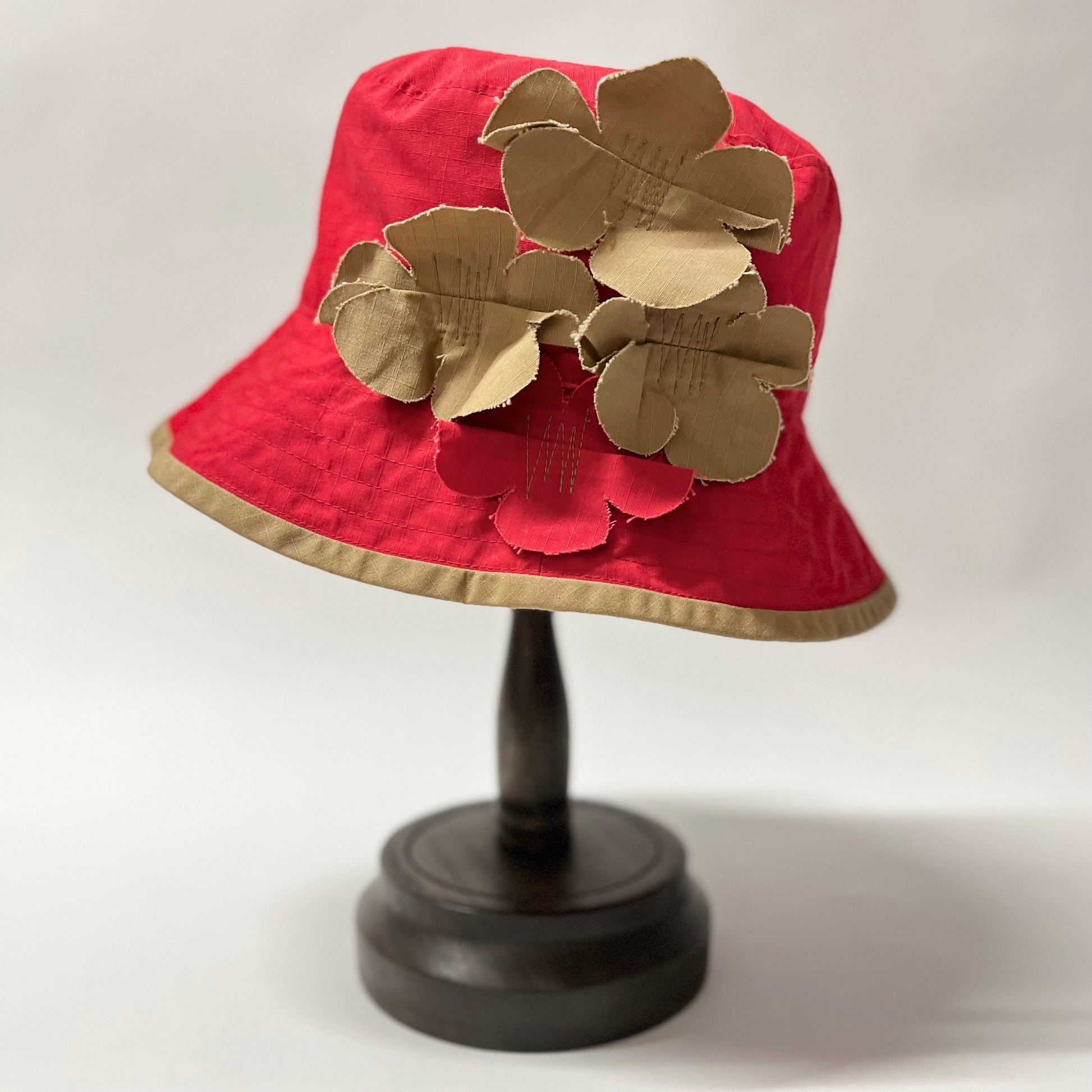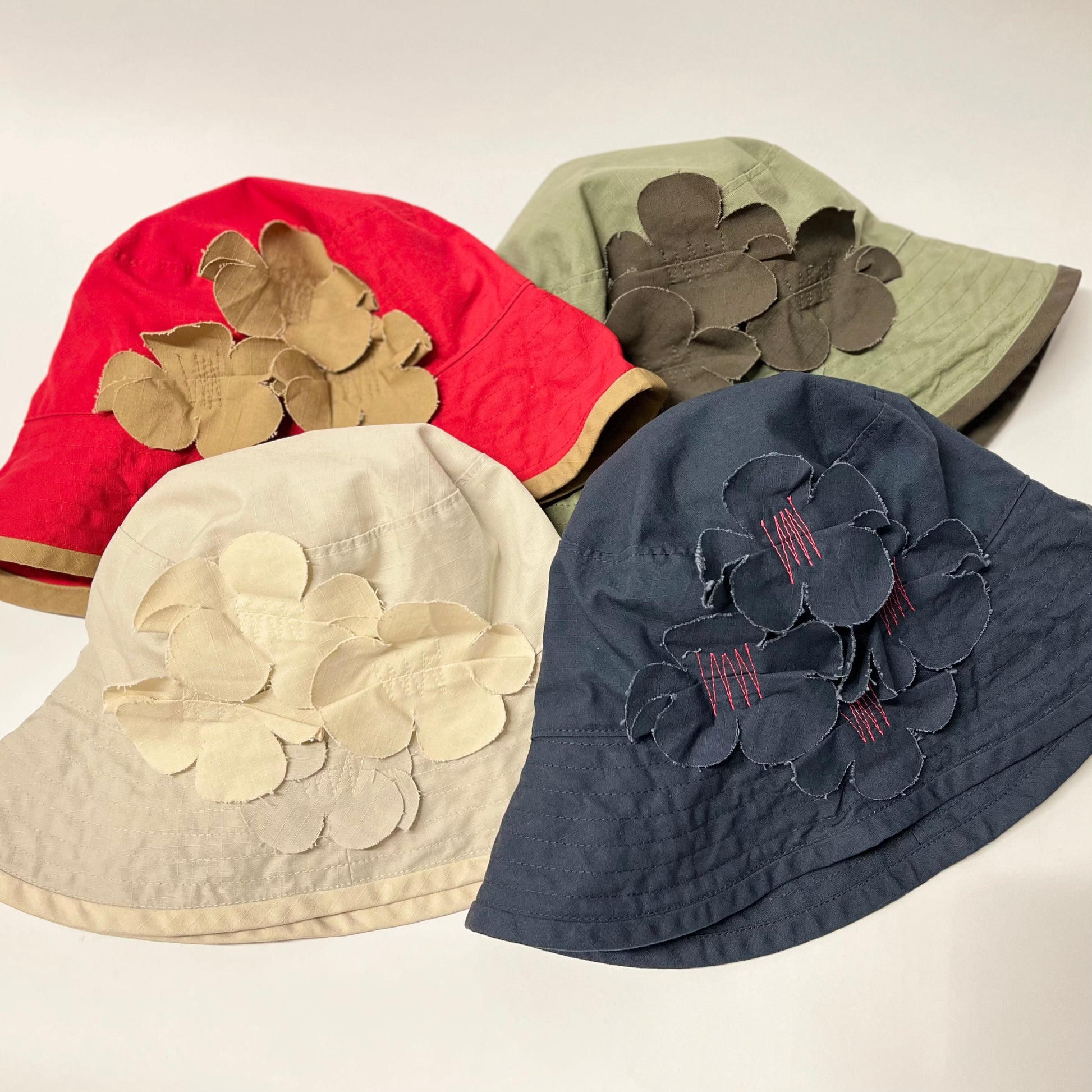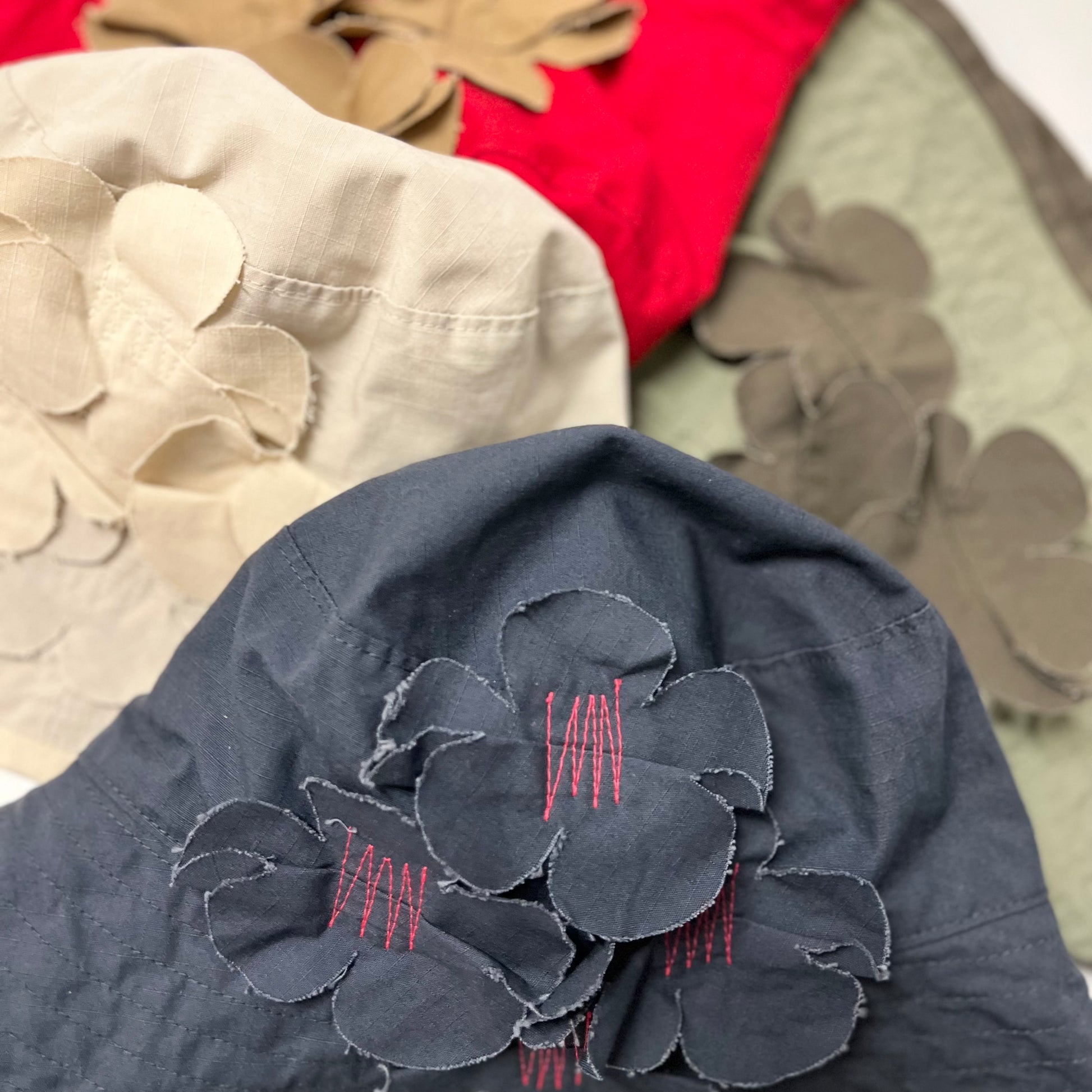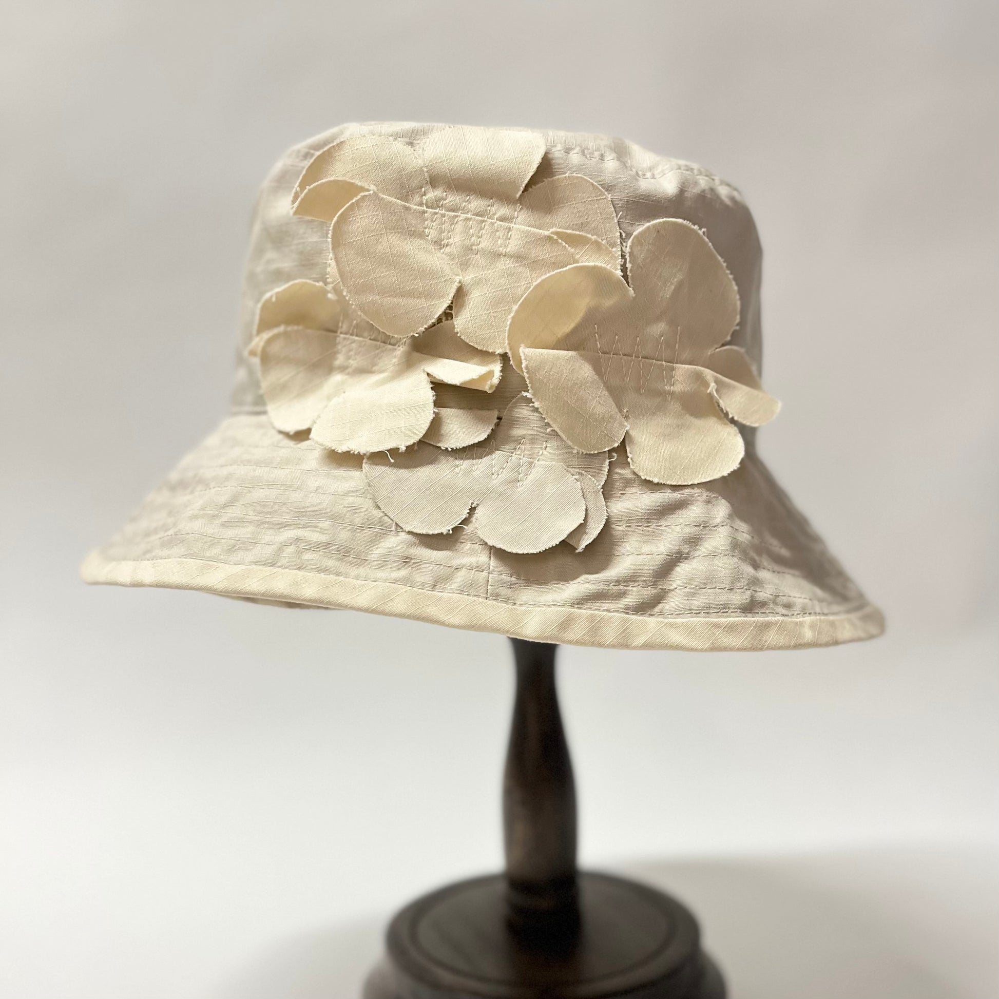 リップストップ生地で作った帽子に共生地の花弁をミシンステッチでとめつけたこのクロシェは、洗い加工を施すことでしわを気にせずにお楽しみいただけます。ブリムは上げても下げてもお好みで被っていただけます。軽やかでありながら、しっかりとした素材感が春の日差しにぴったりな帽子です。