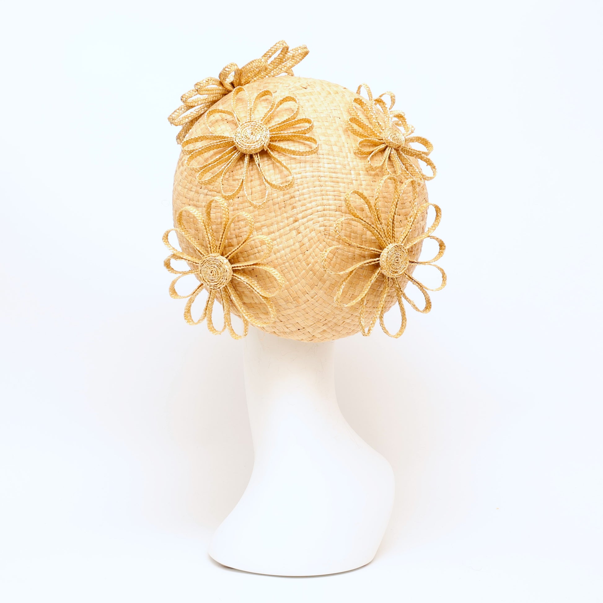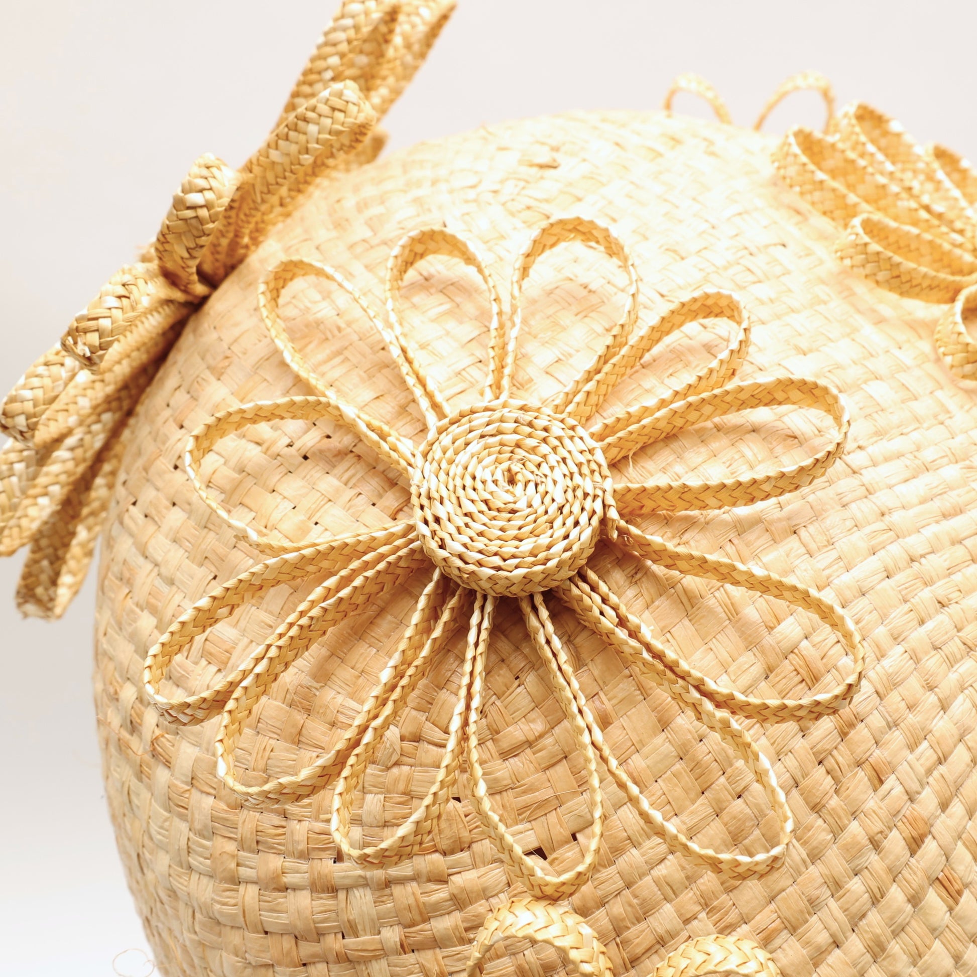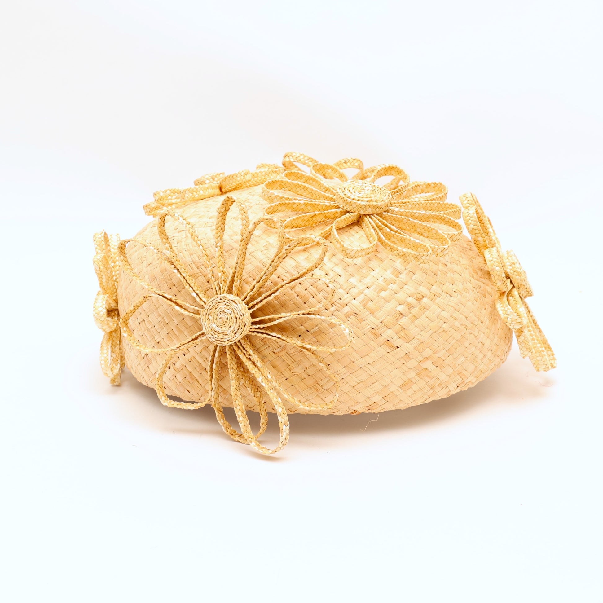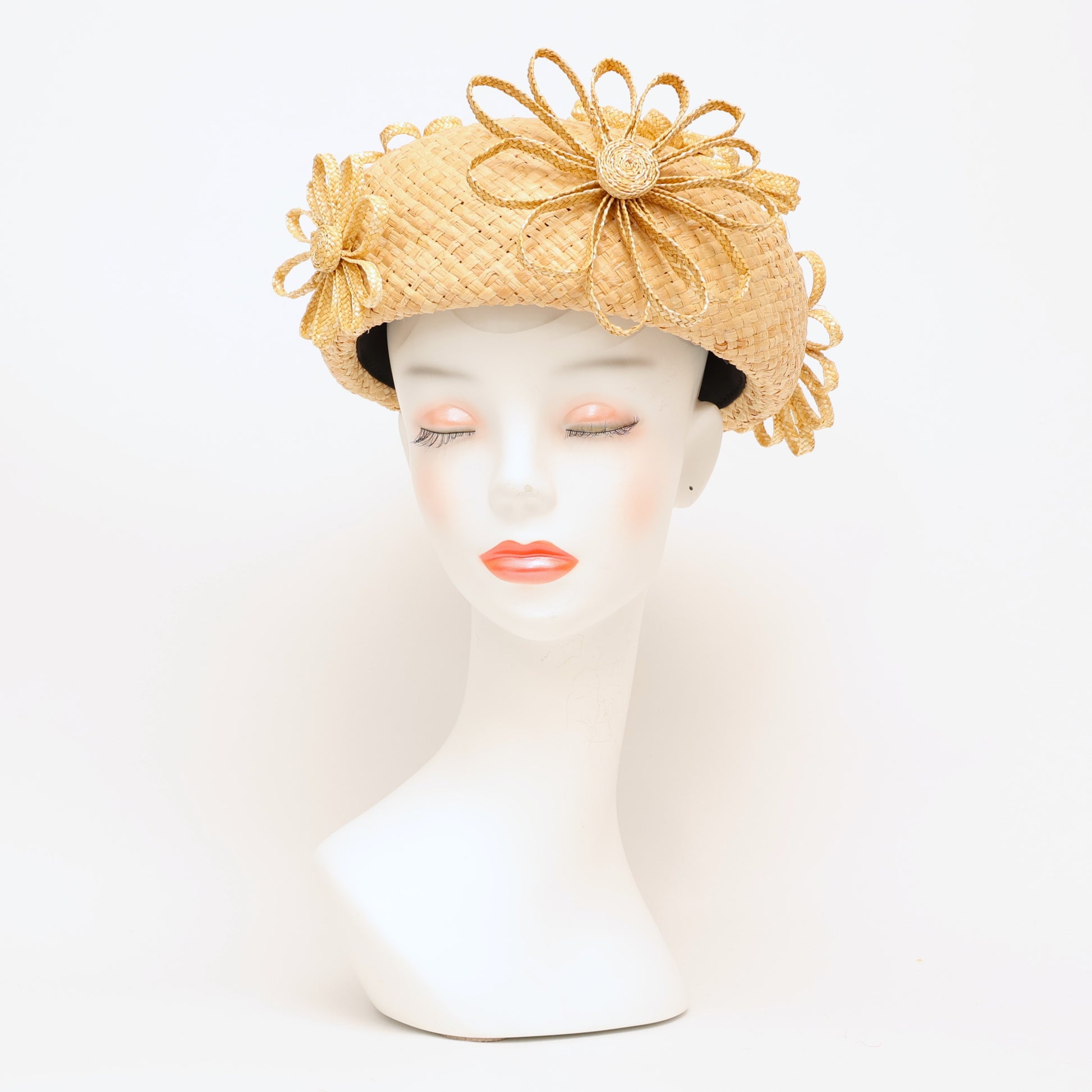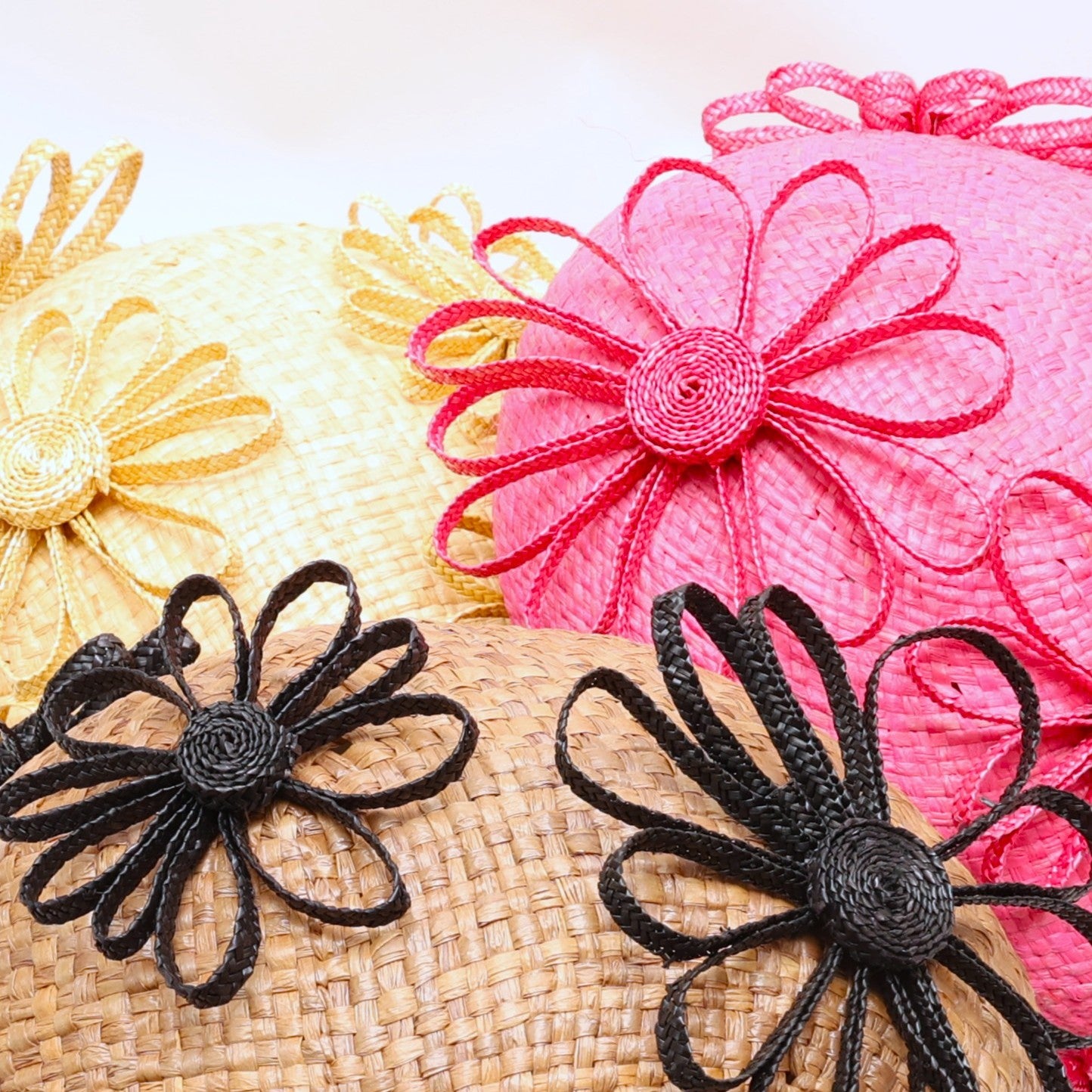細麦で繊細な花モチーフを制作し、それを贅沢にラフィア素材のトークハットにあしらいました。ナチュラルな風合いと華やかさが調和したデザインで、季節感を存分に楽しめるトークベレーに仕上げています。