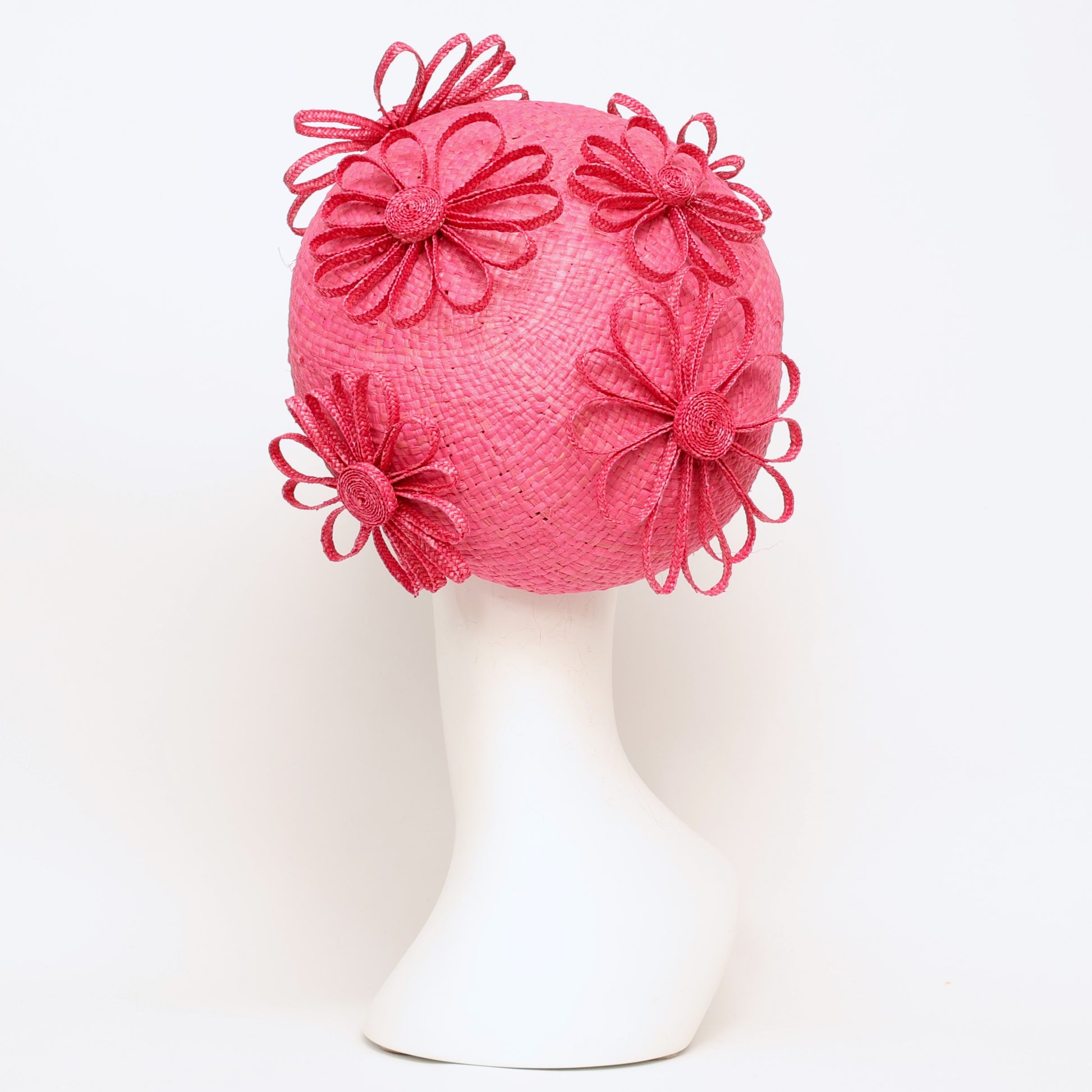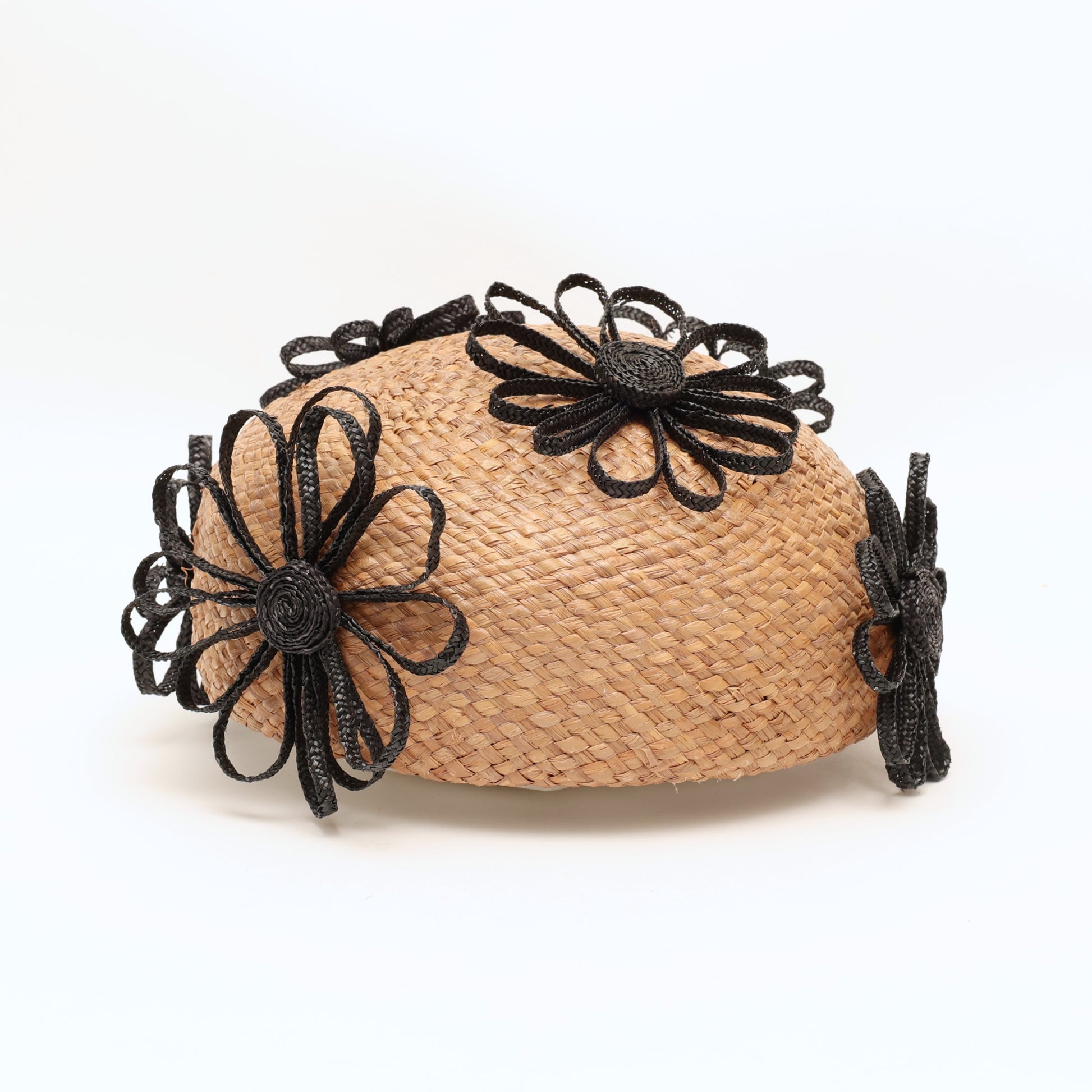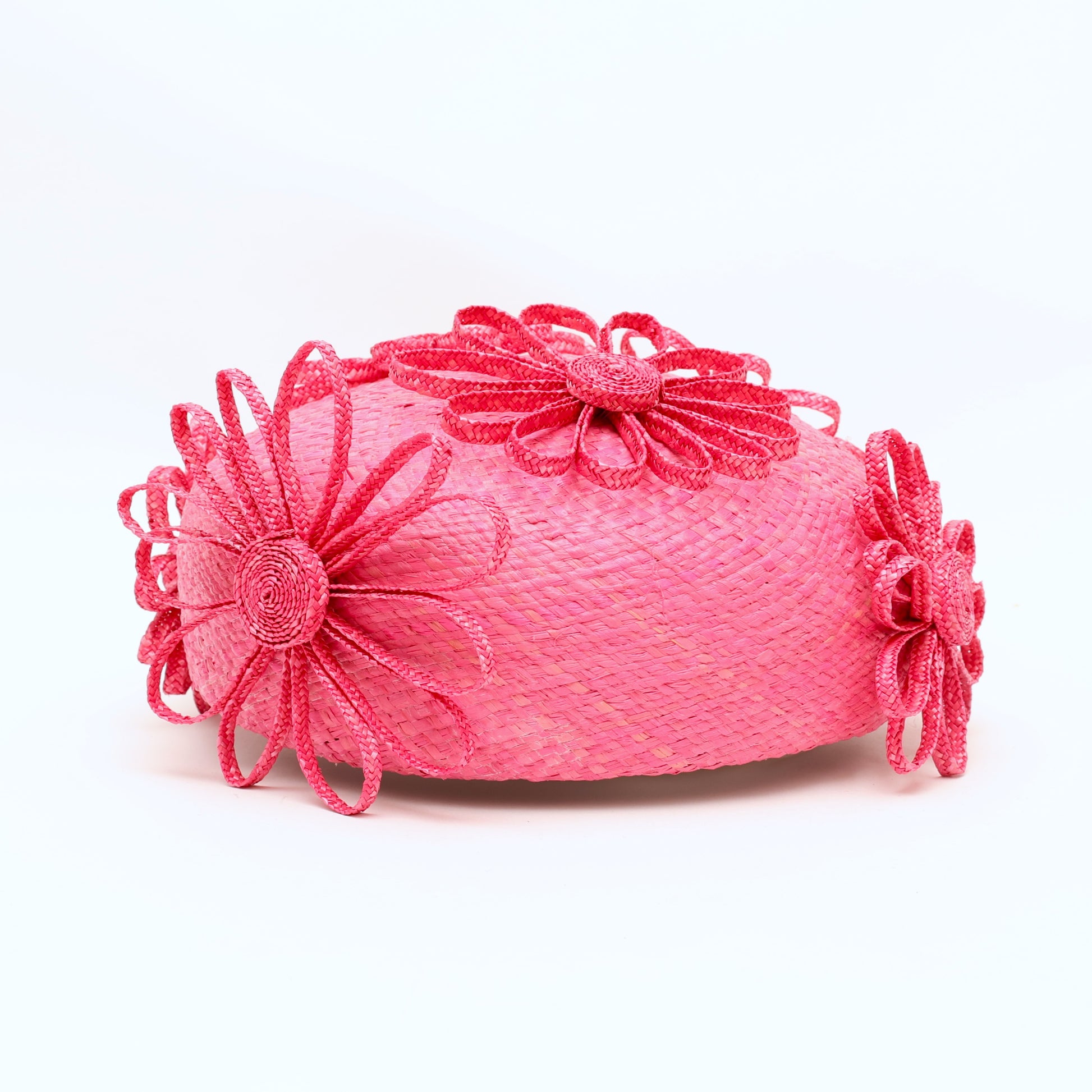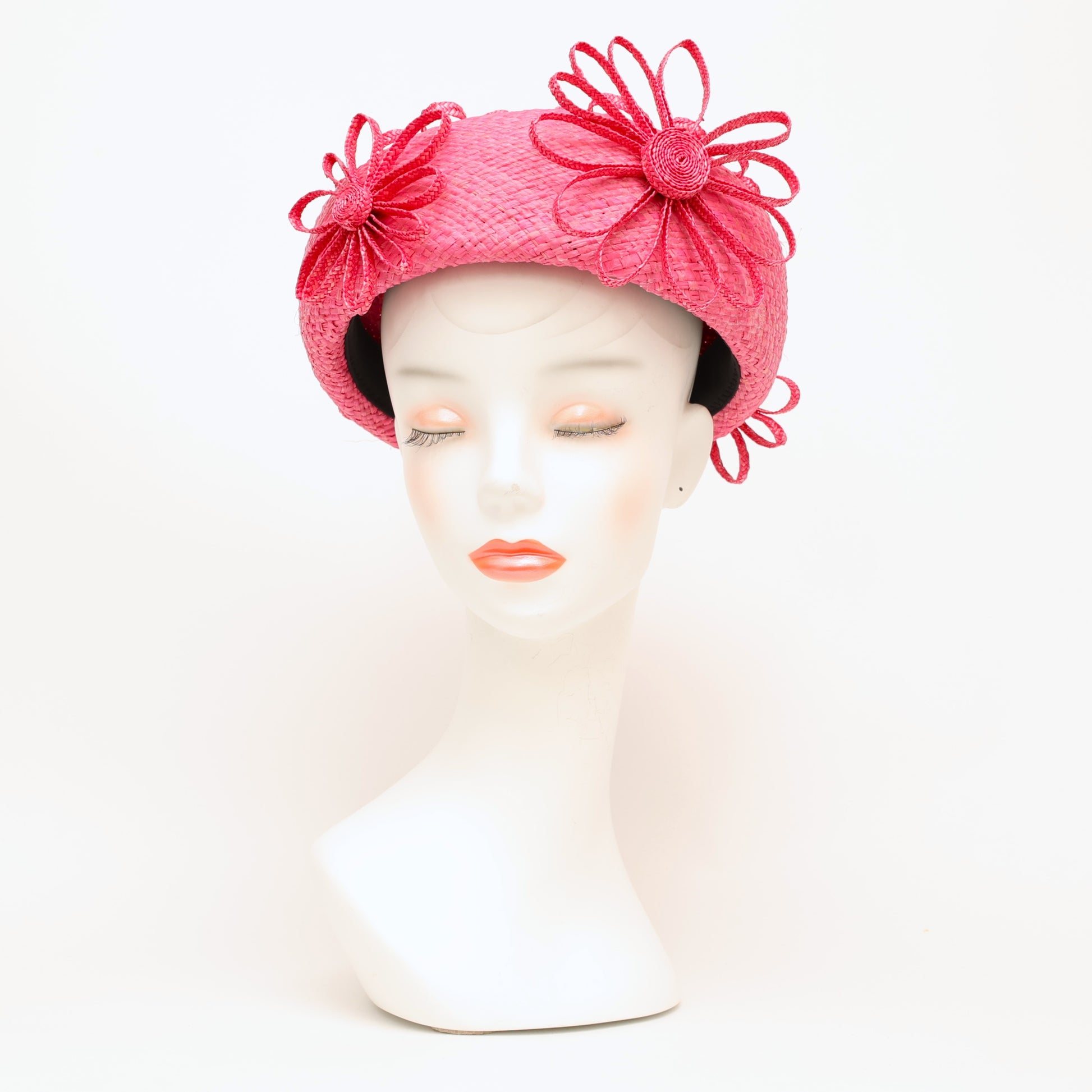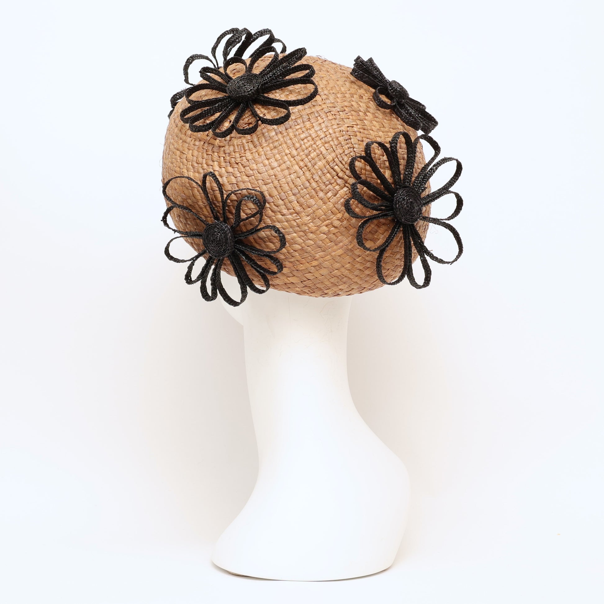 細麦で繊細な花モチーフを制作し、それを贅沢にラフィア素材のトークハットにあしらいました。ナチュラルな風合いと華やかさが調和したデザインで、季節感を存分に楽しめるトークベレーに仕上げています。
