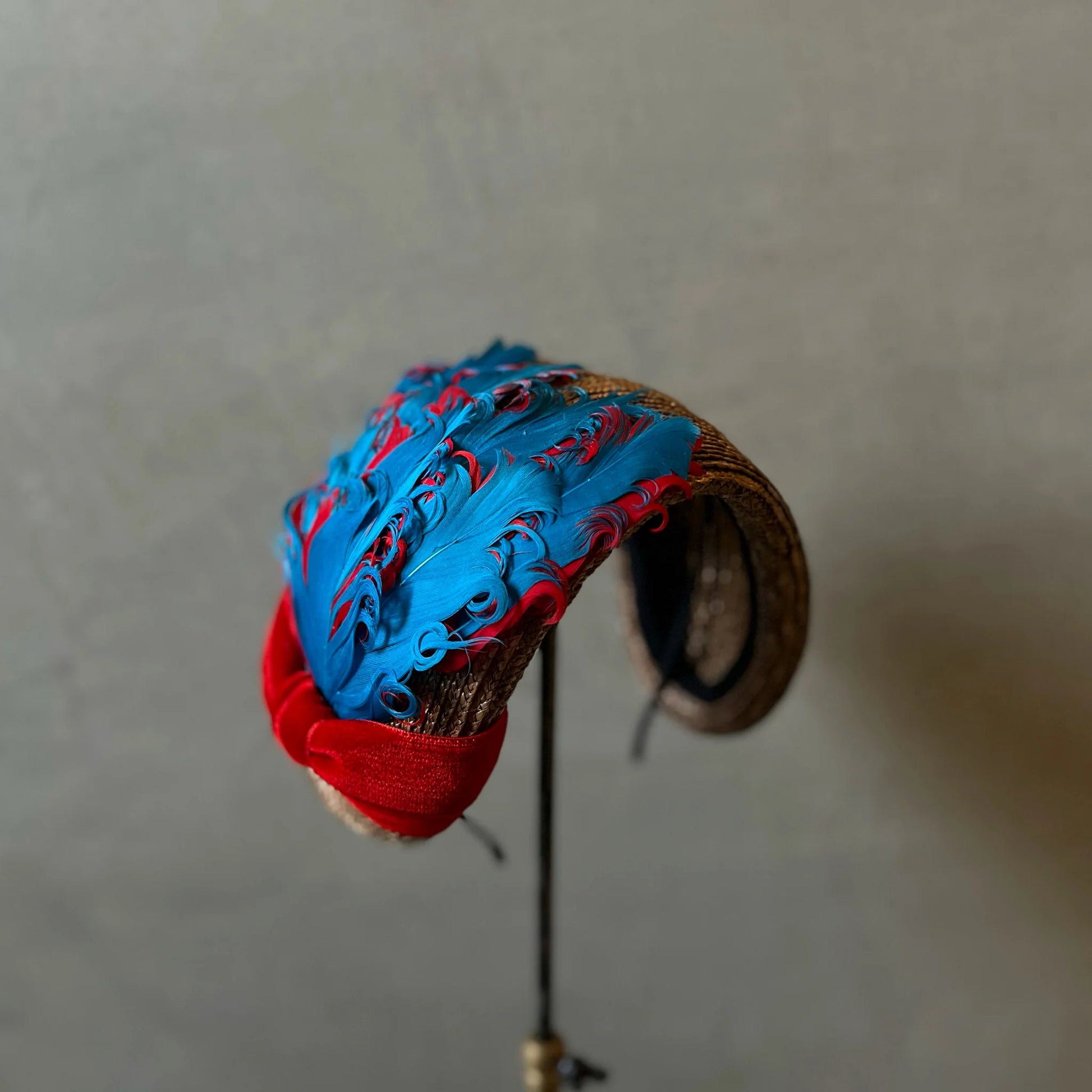 アンティークゴールドに染めた麦のアリスバンドに豪華な羽根をあしらったデザイン。