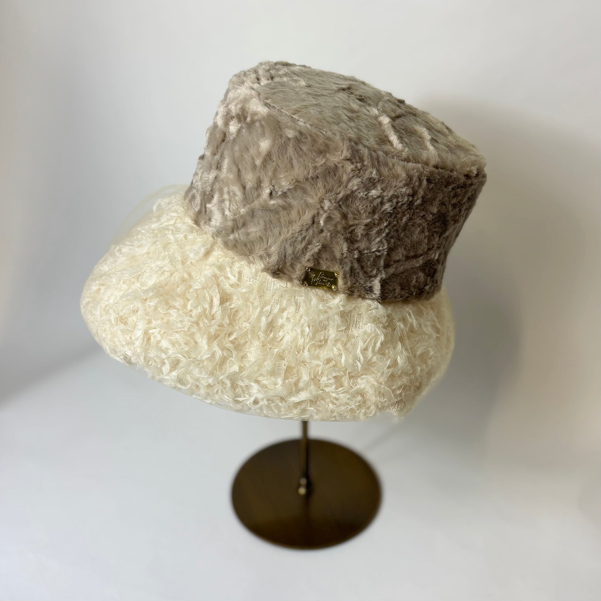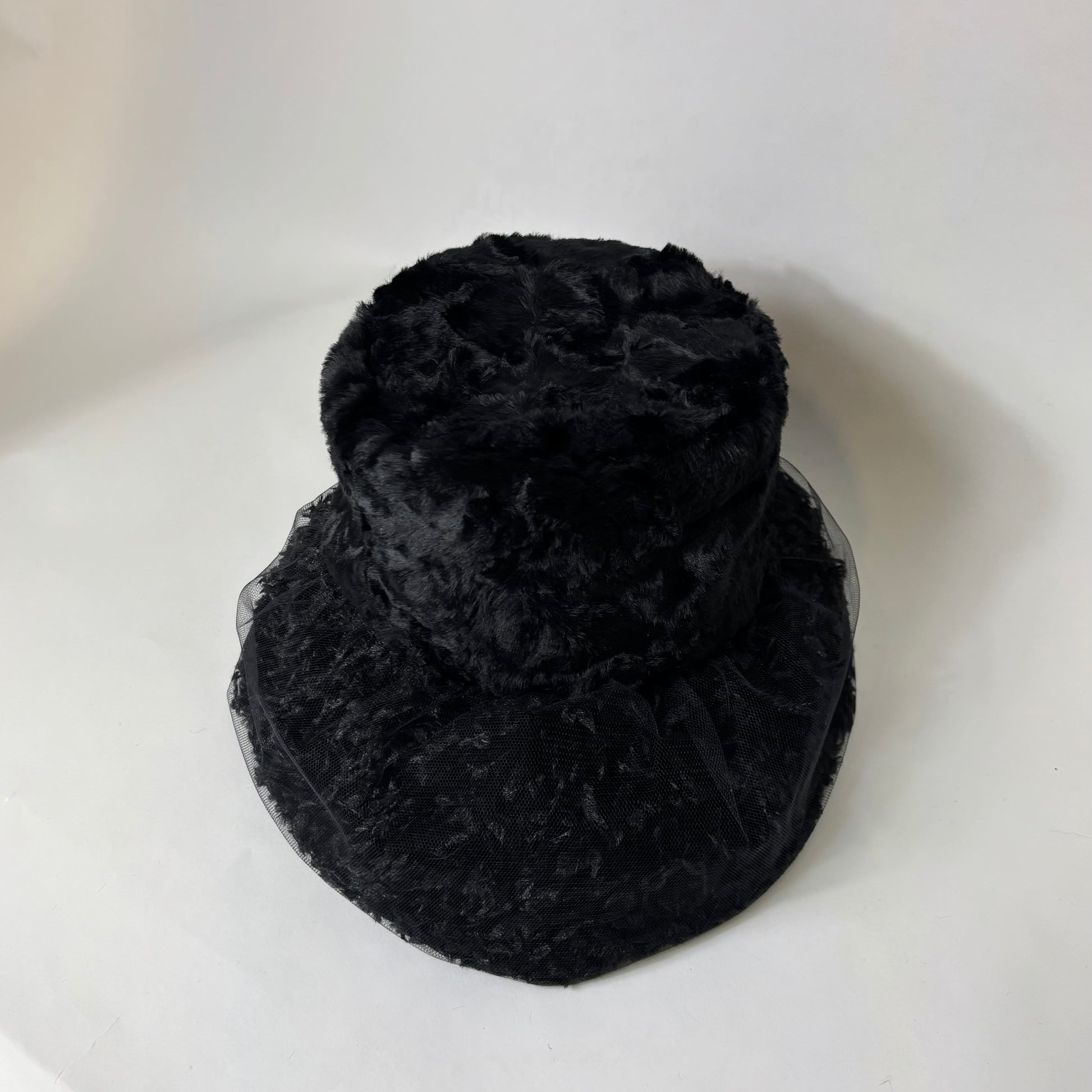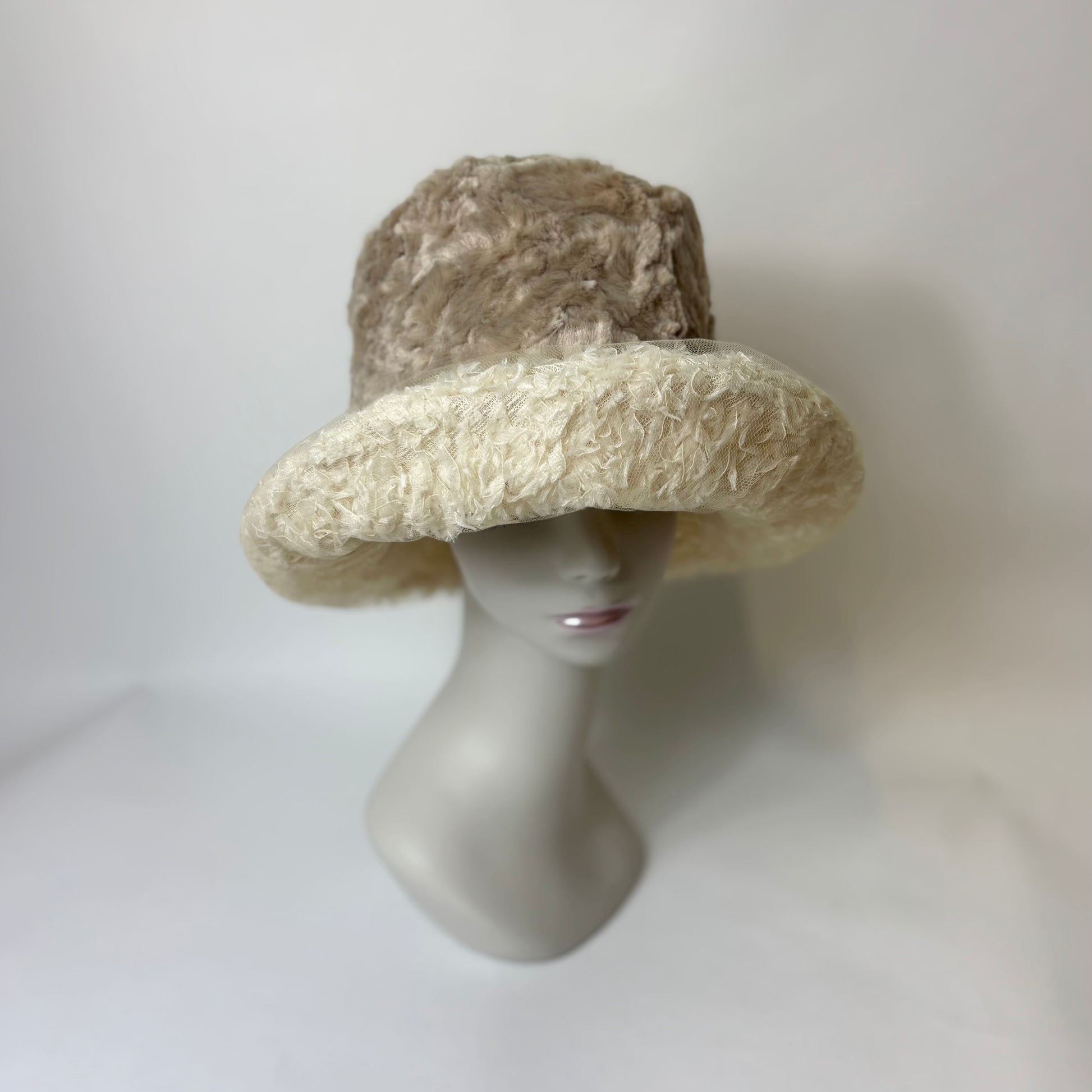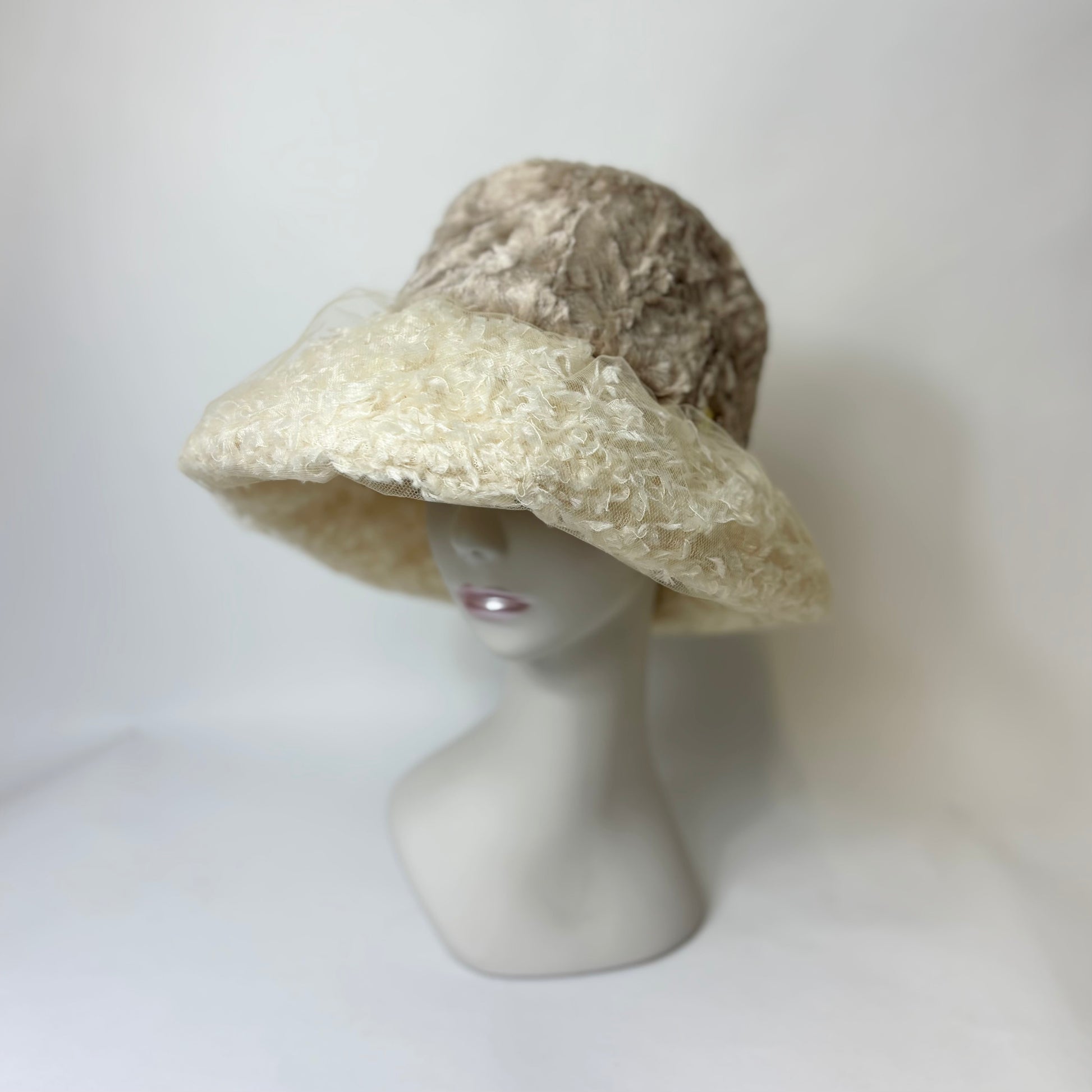 羽根にそっと重ねたチュールが、霧がかったような静かな美しさを添えるブリムが印象的な帽子です。