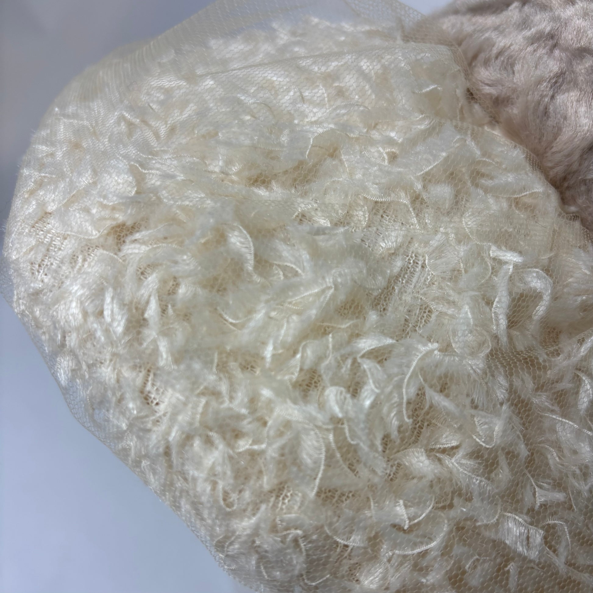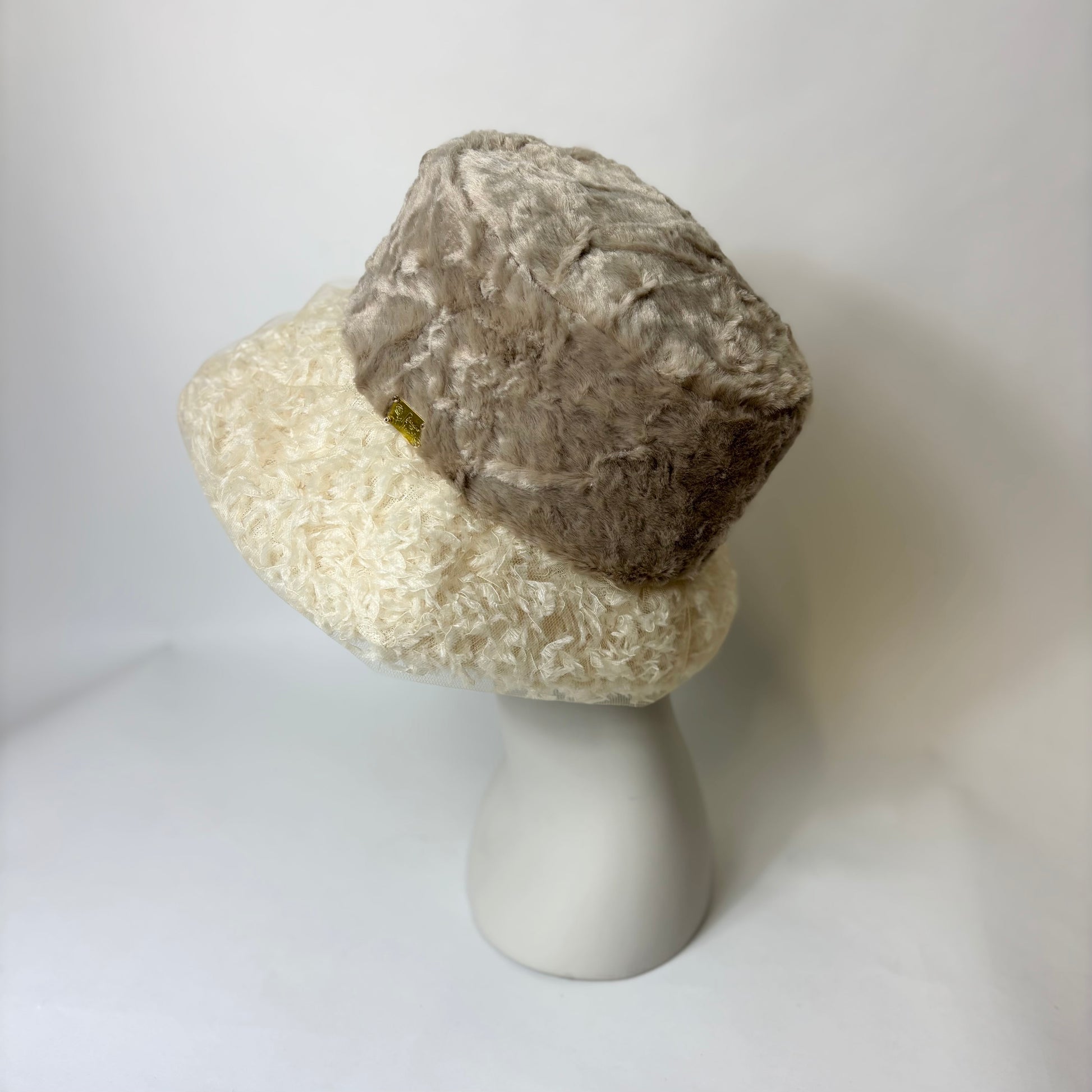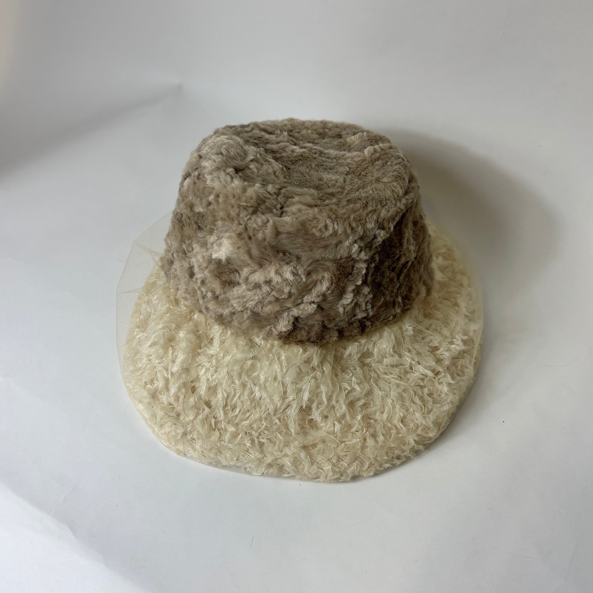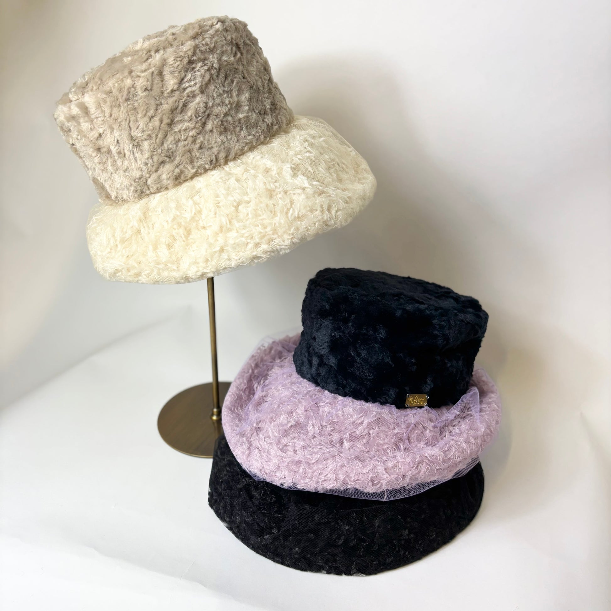 羽根にそっと重ねたチュールが、霧がかったような静かな美しさを添えるブリムが印象的な帽子です。