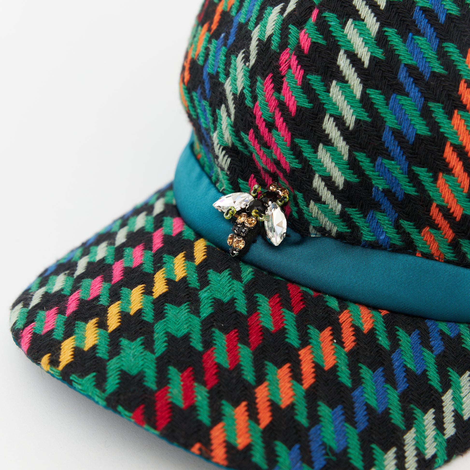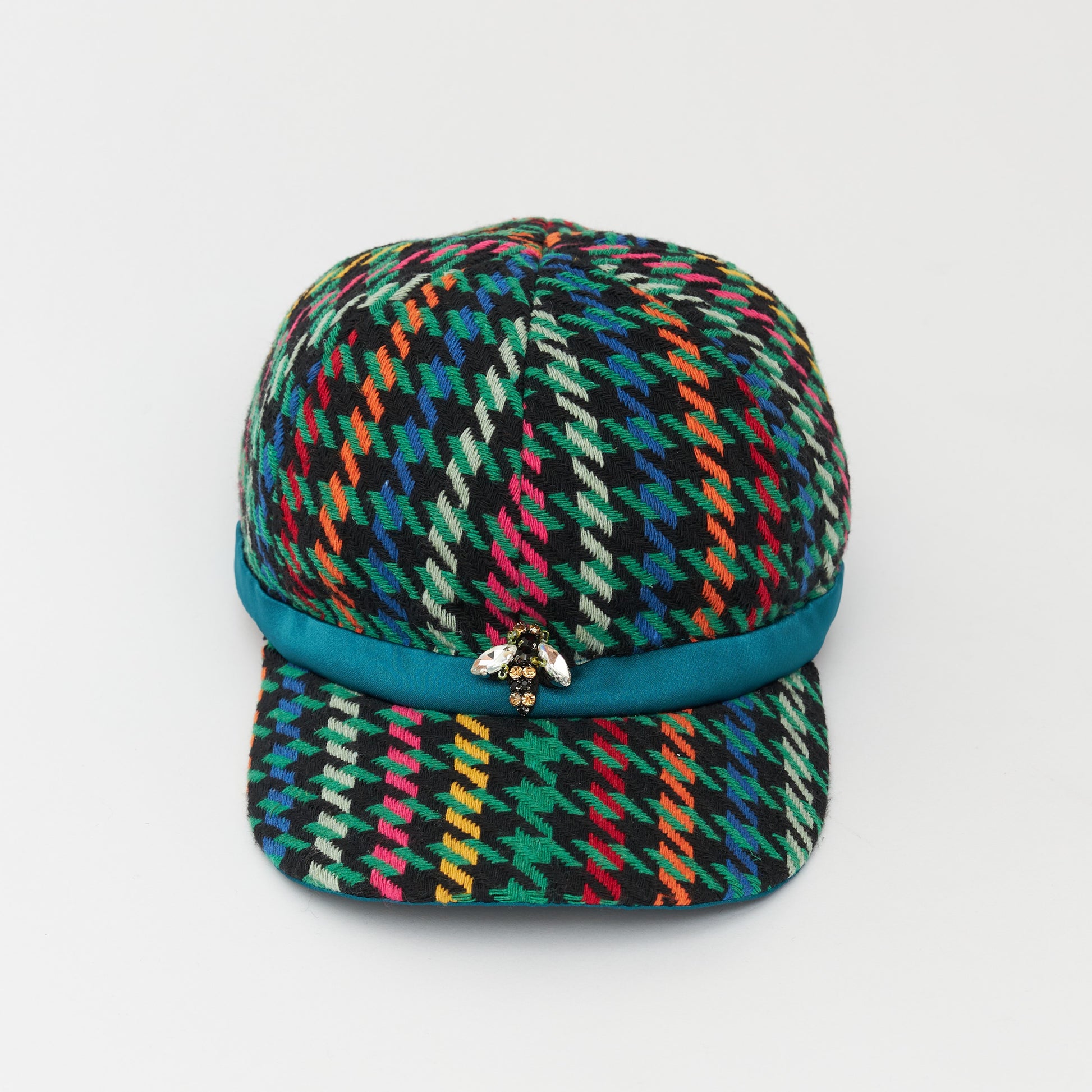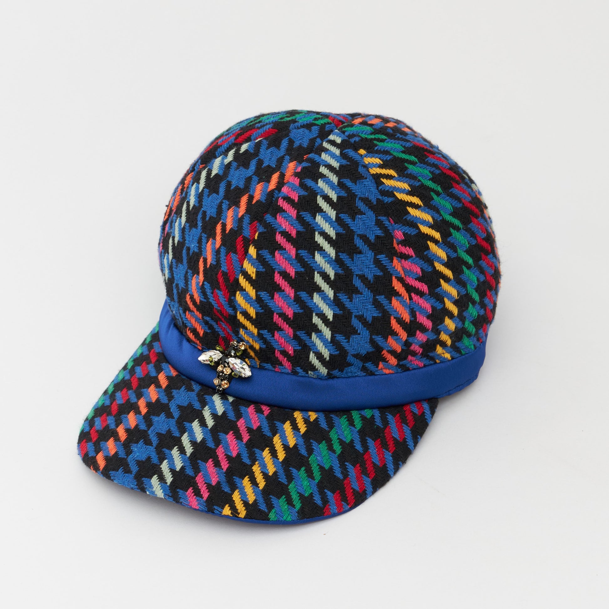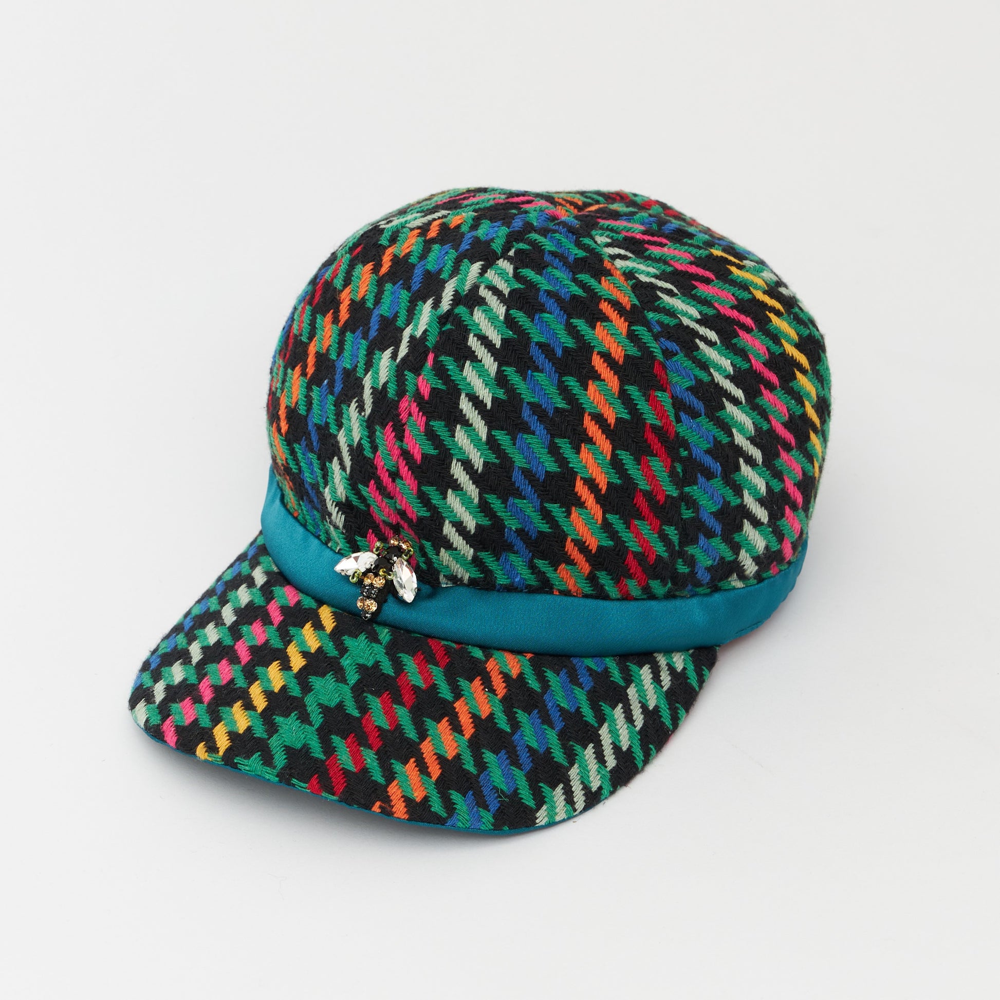 めずらしい杉綾柄の生地を使いキャップを製作しました。だいたんな柄ながらベーシックなフォルムで日常的に使いやすい帽子です。どの年代でもかぶれるようなデザインにしました。モチーフの蜂は幸運の象徴です。