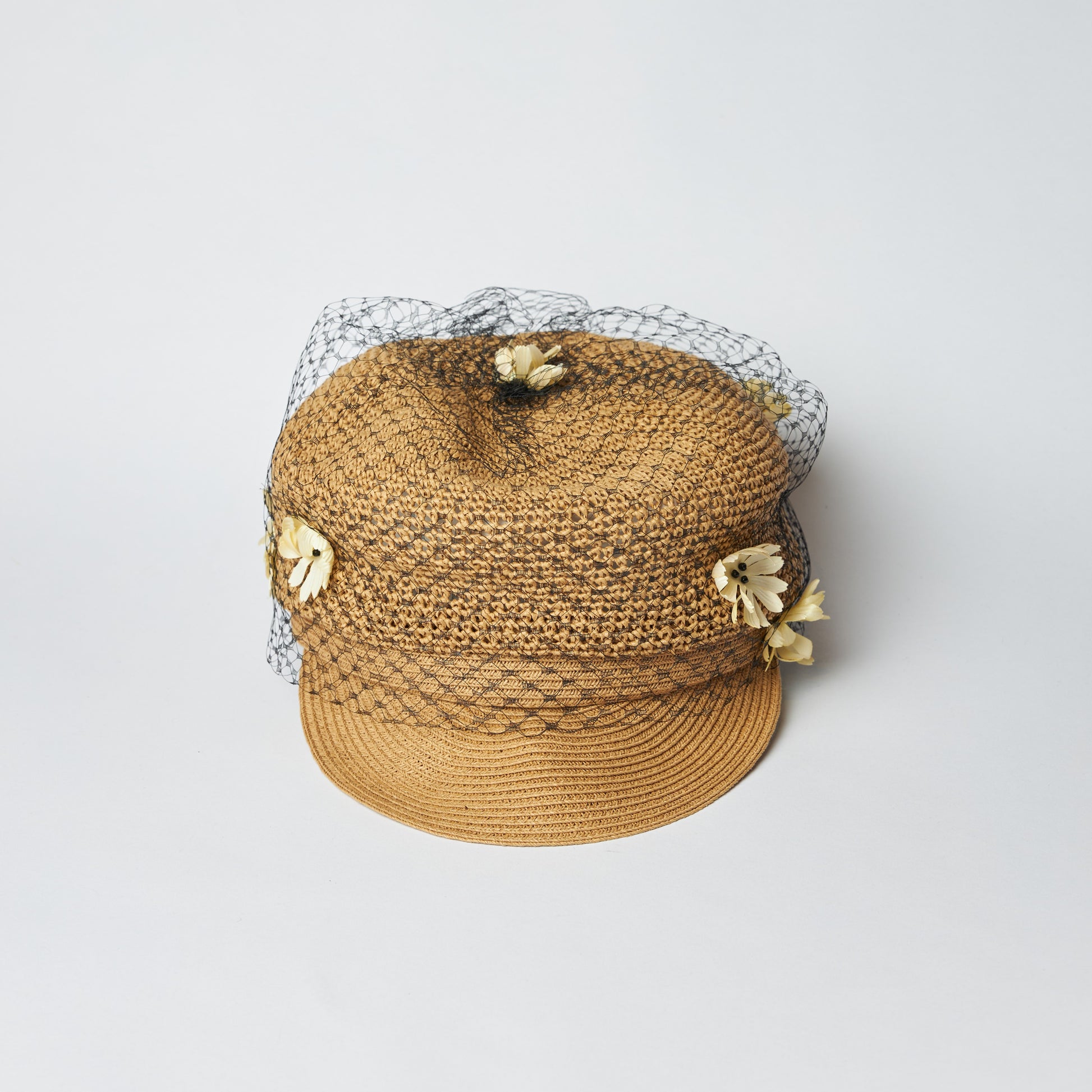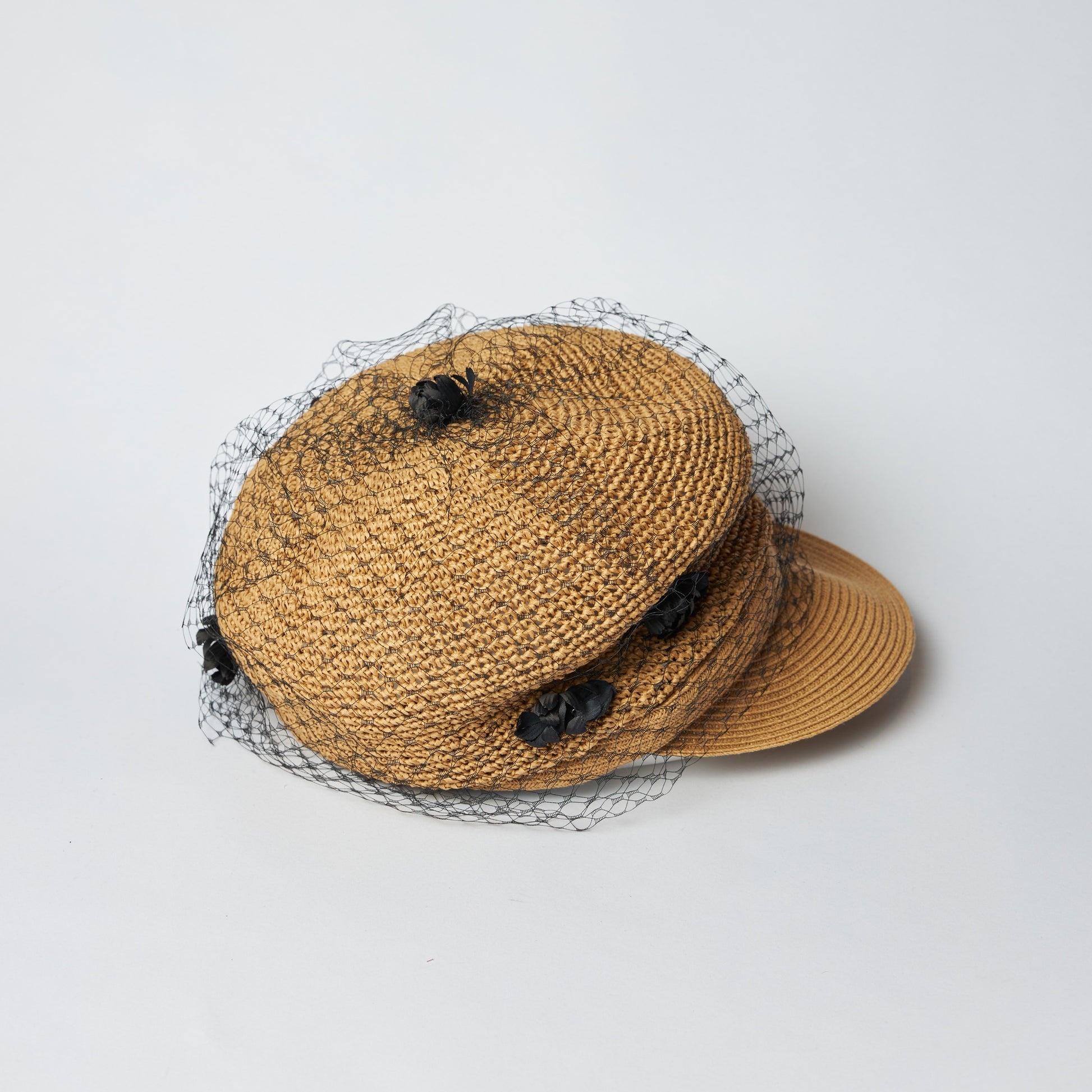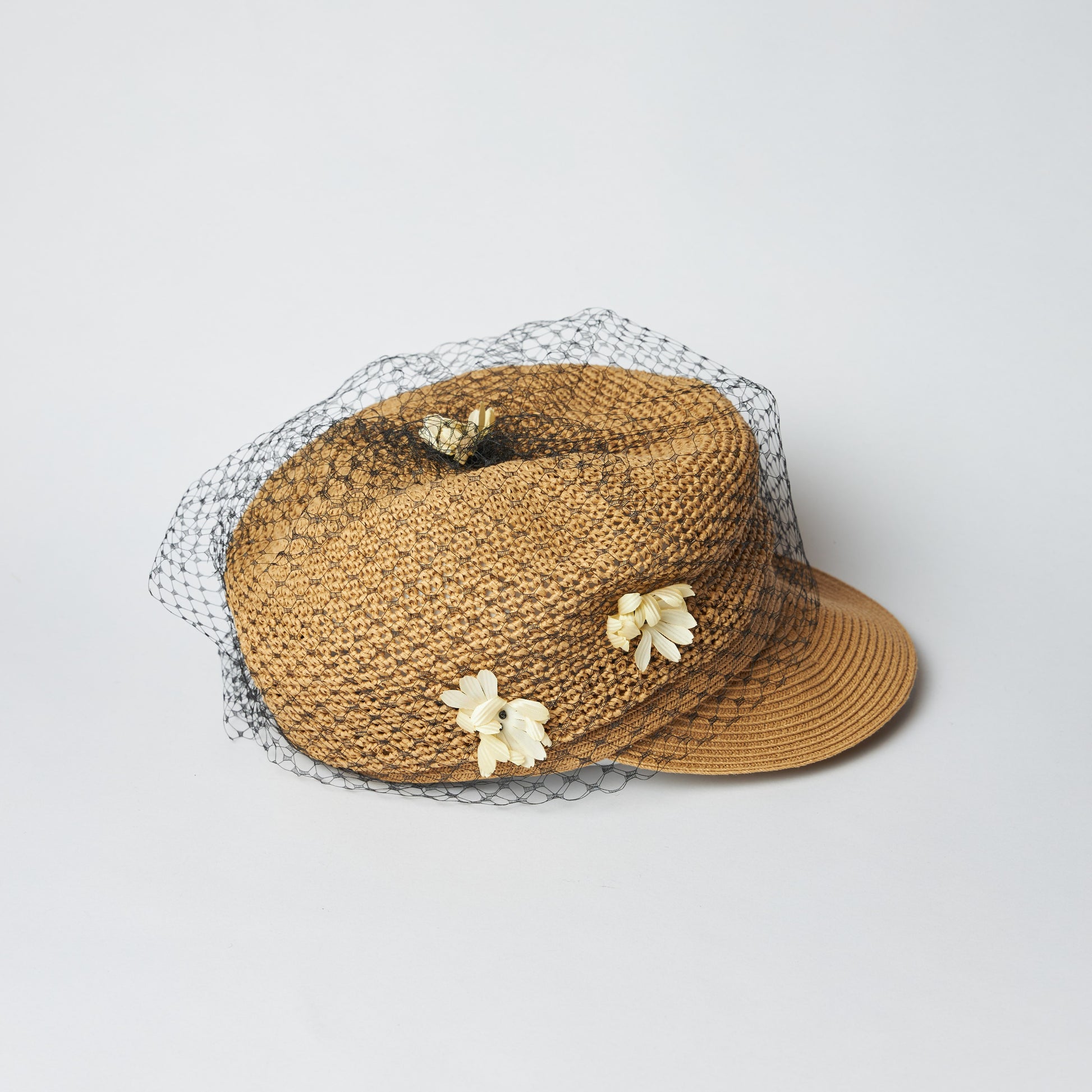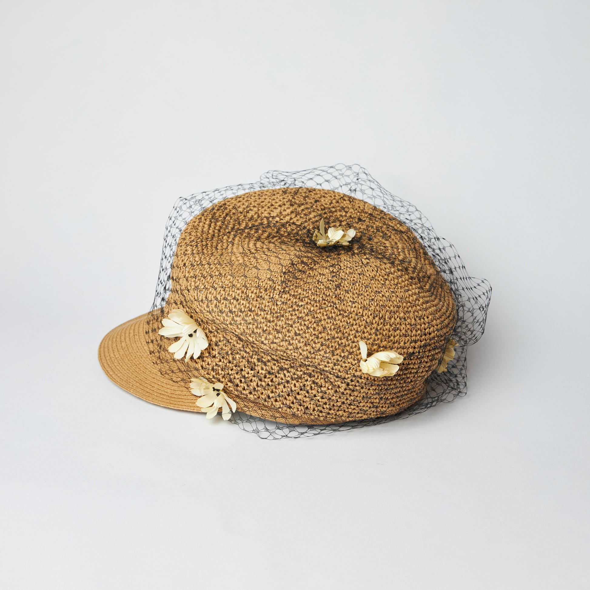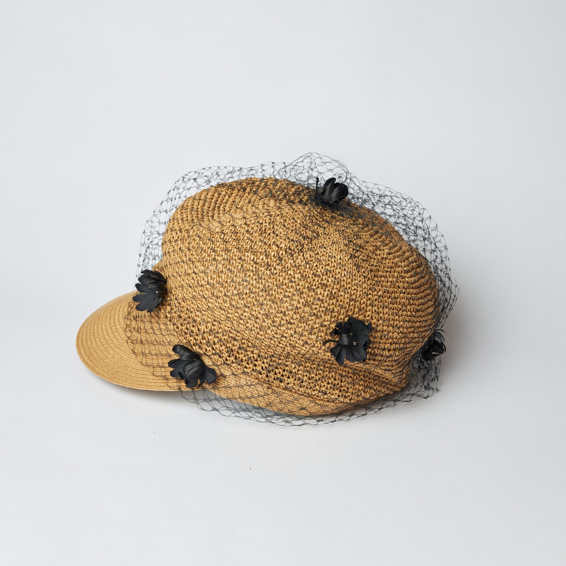 定番のペーパーこまあみキャスケットに、飾りの造花にはコテ入れをし、自然な花の風合いにしました。
