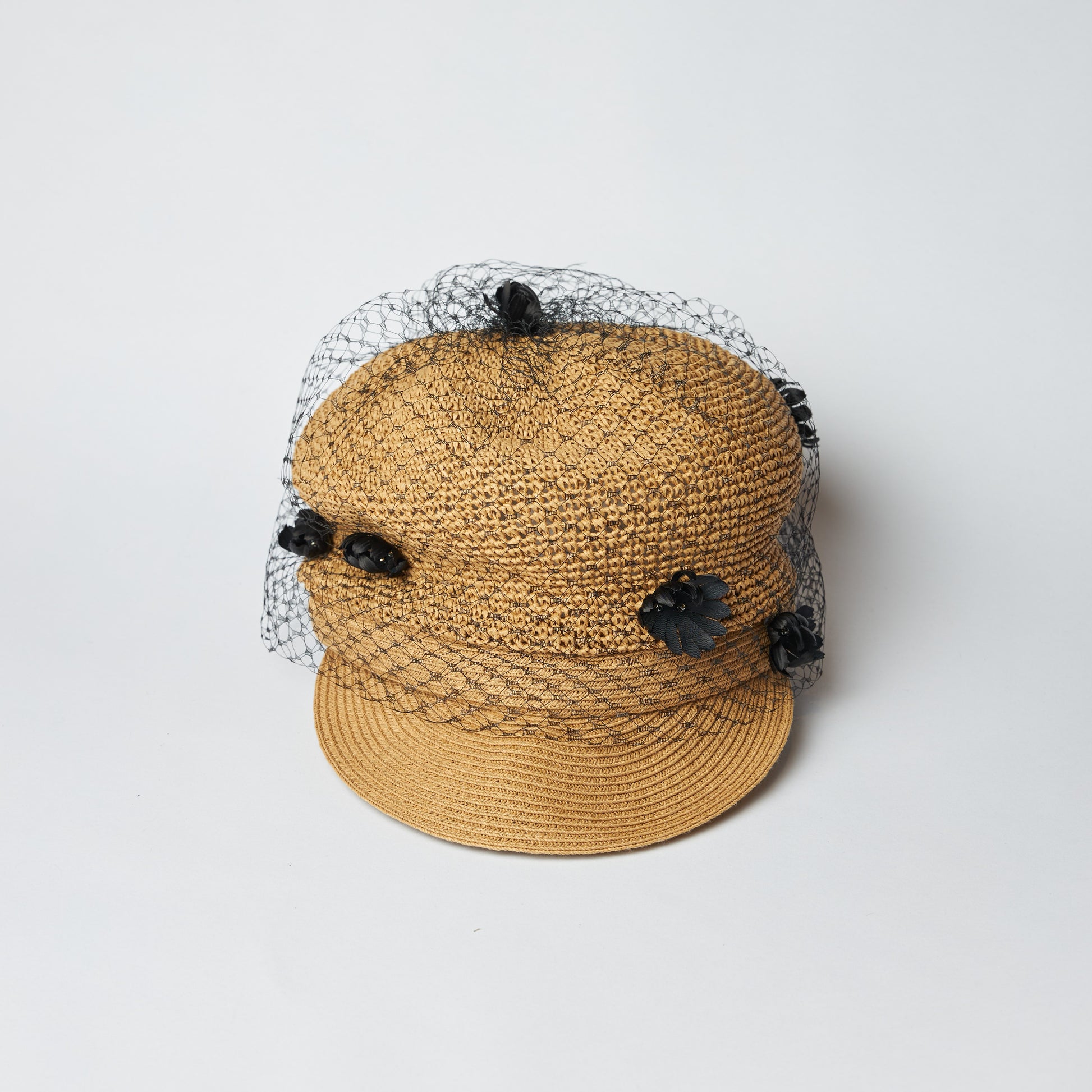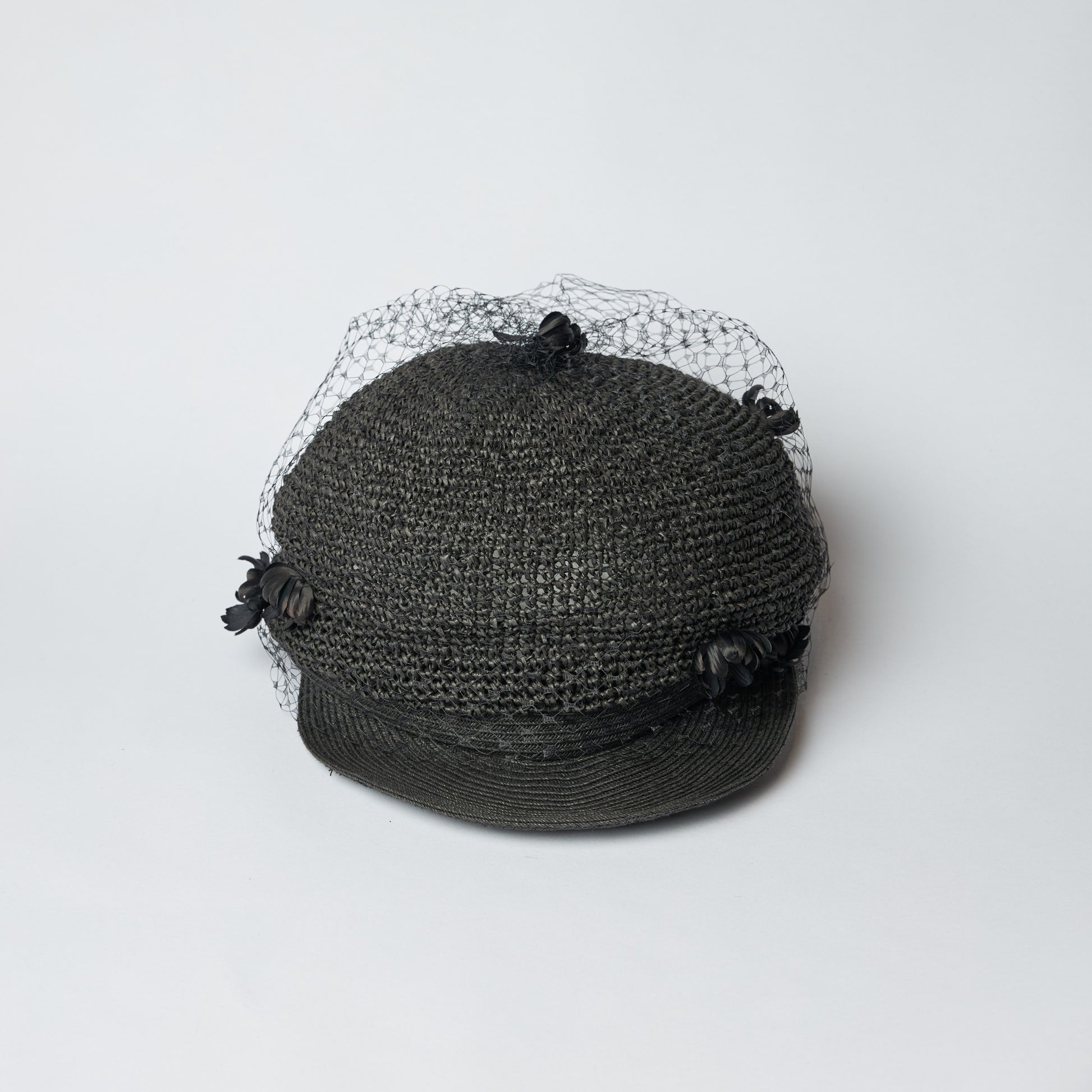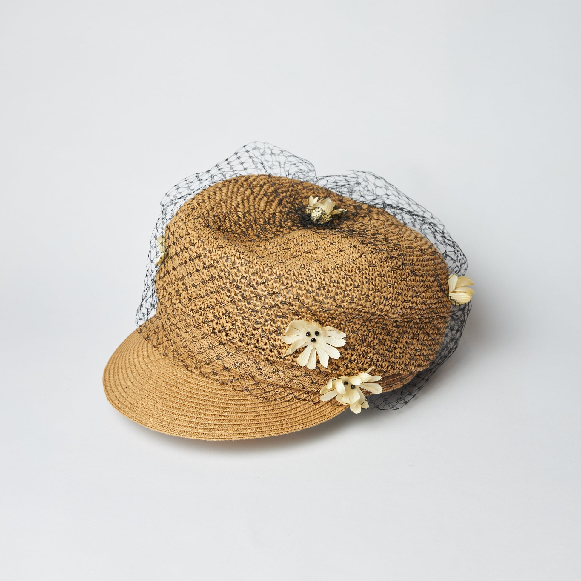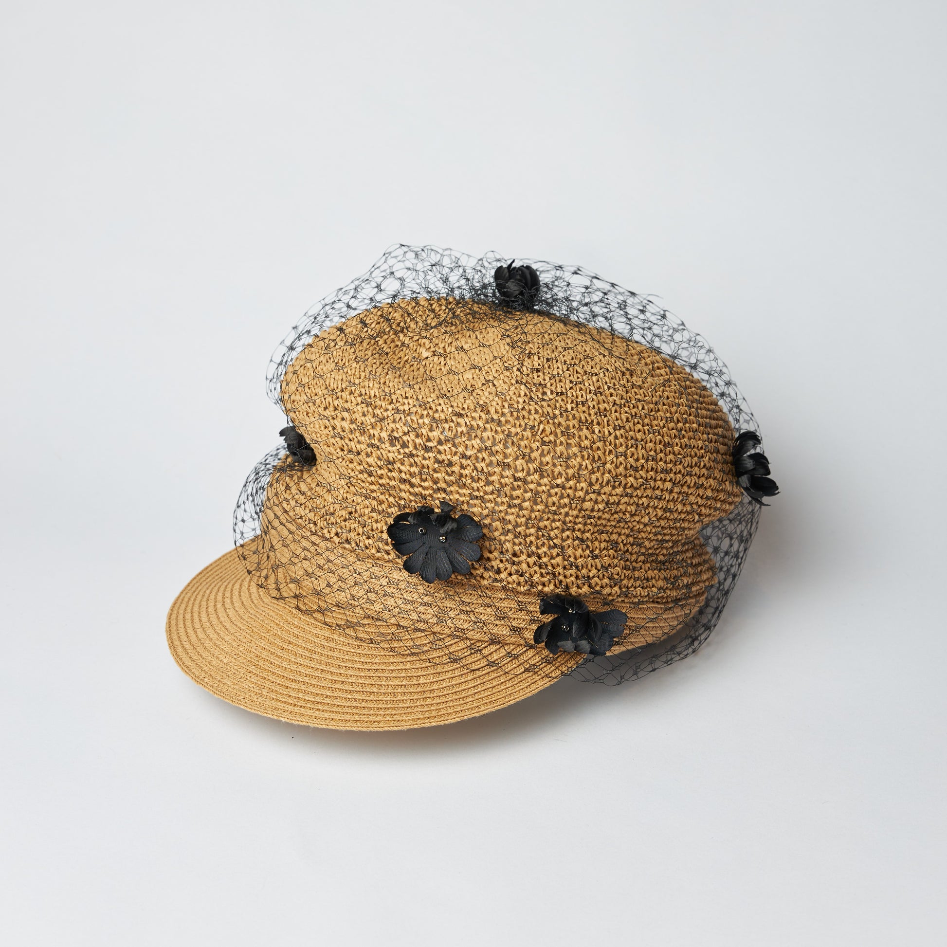 定番のペーパーこまあみキャスケットに、飾りの造花にはコテ入れをし、自然な花の風合いにしました。
