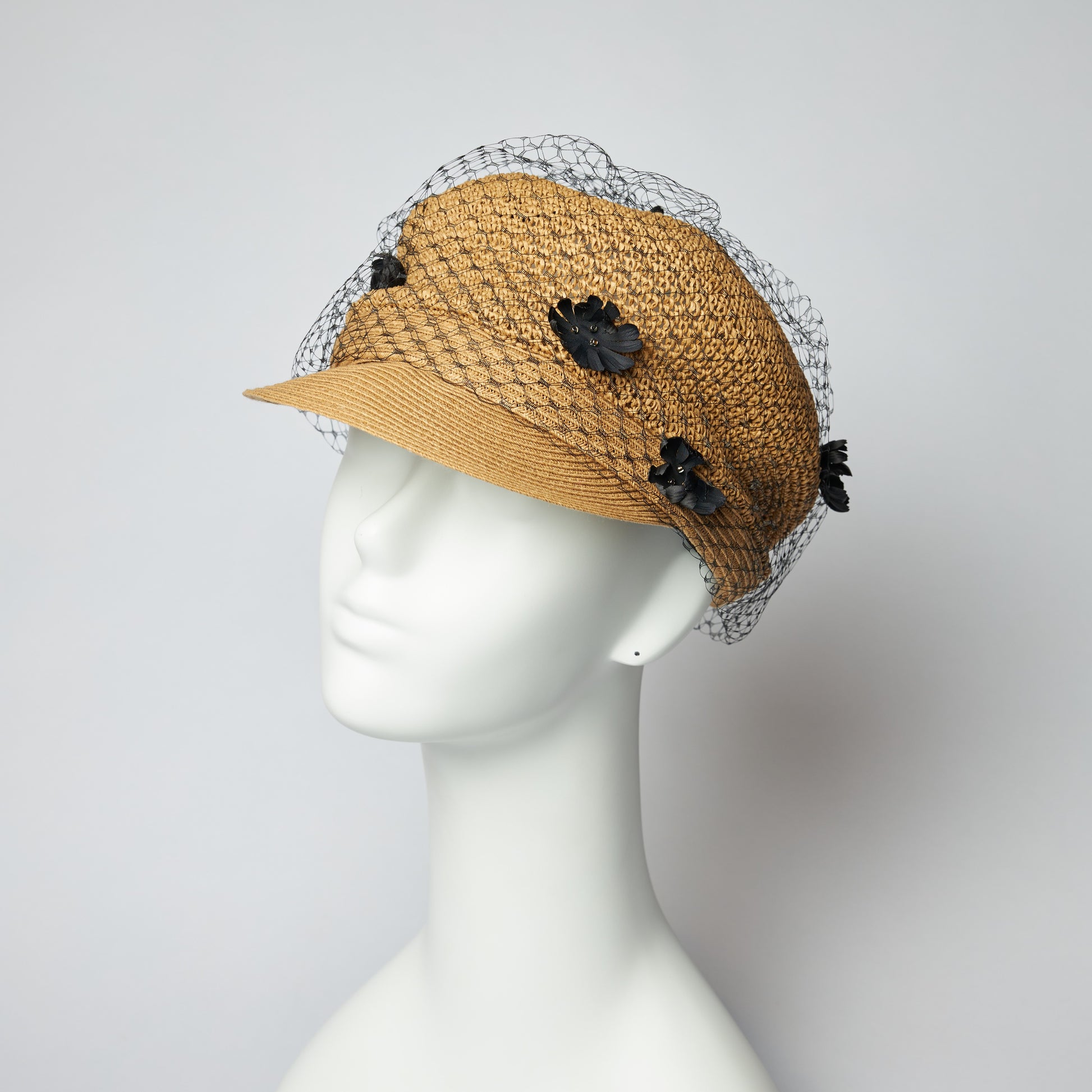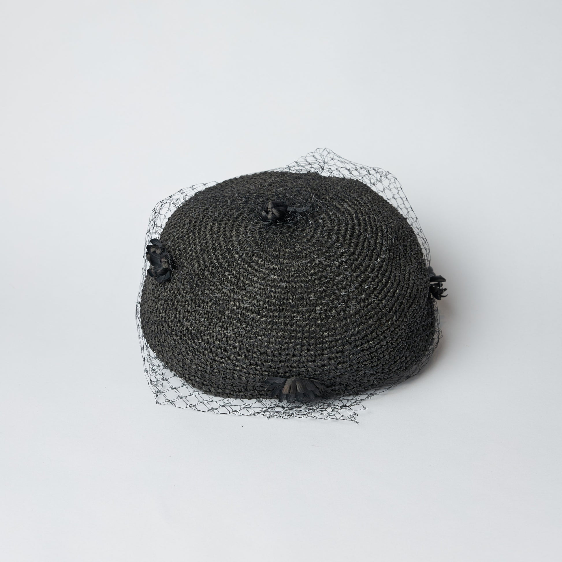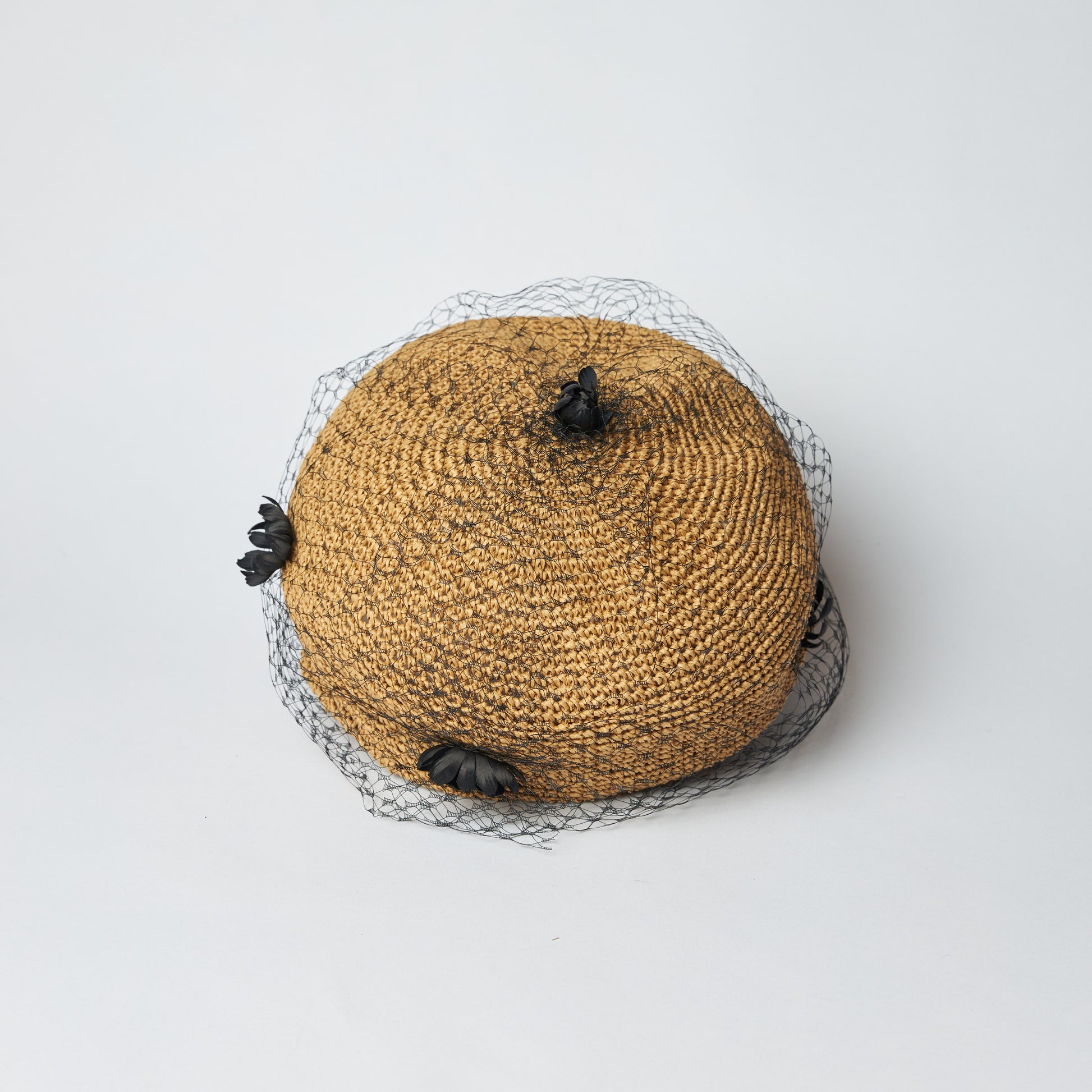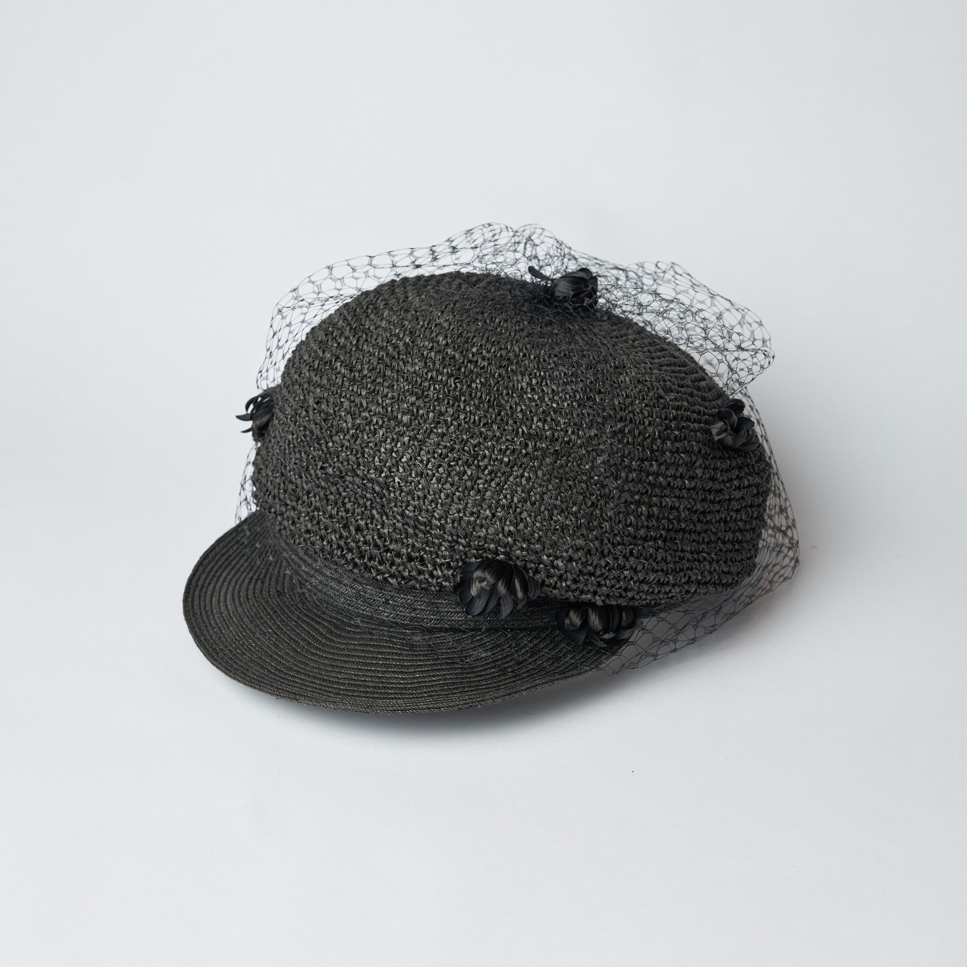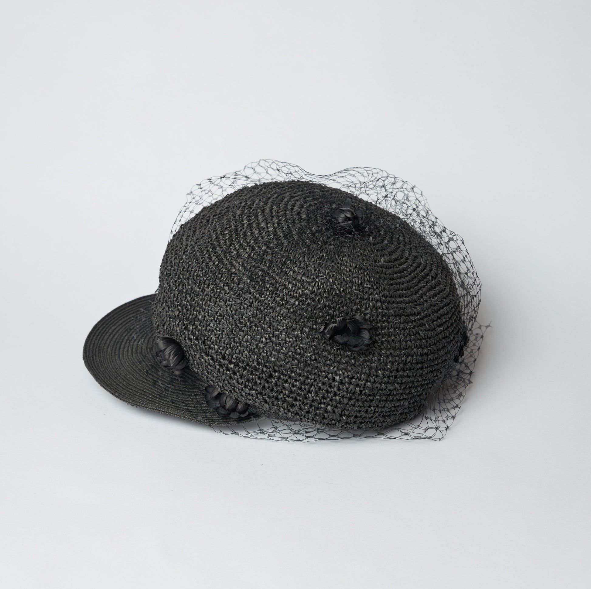 定番のペーパーこまあみキャスケットに、飾りの造花にはコテ入れをし、自然な花の風合いにしました。