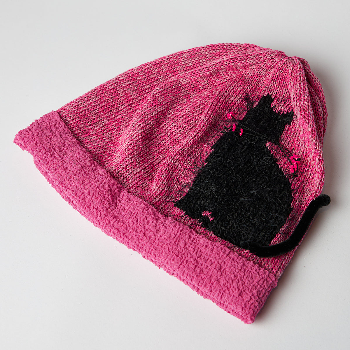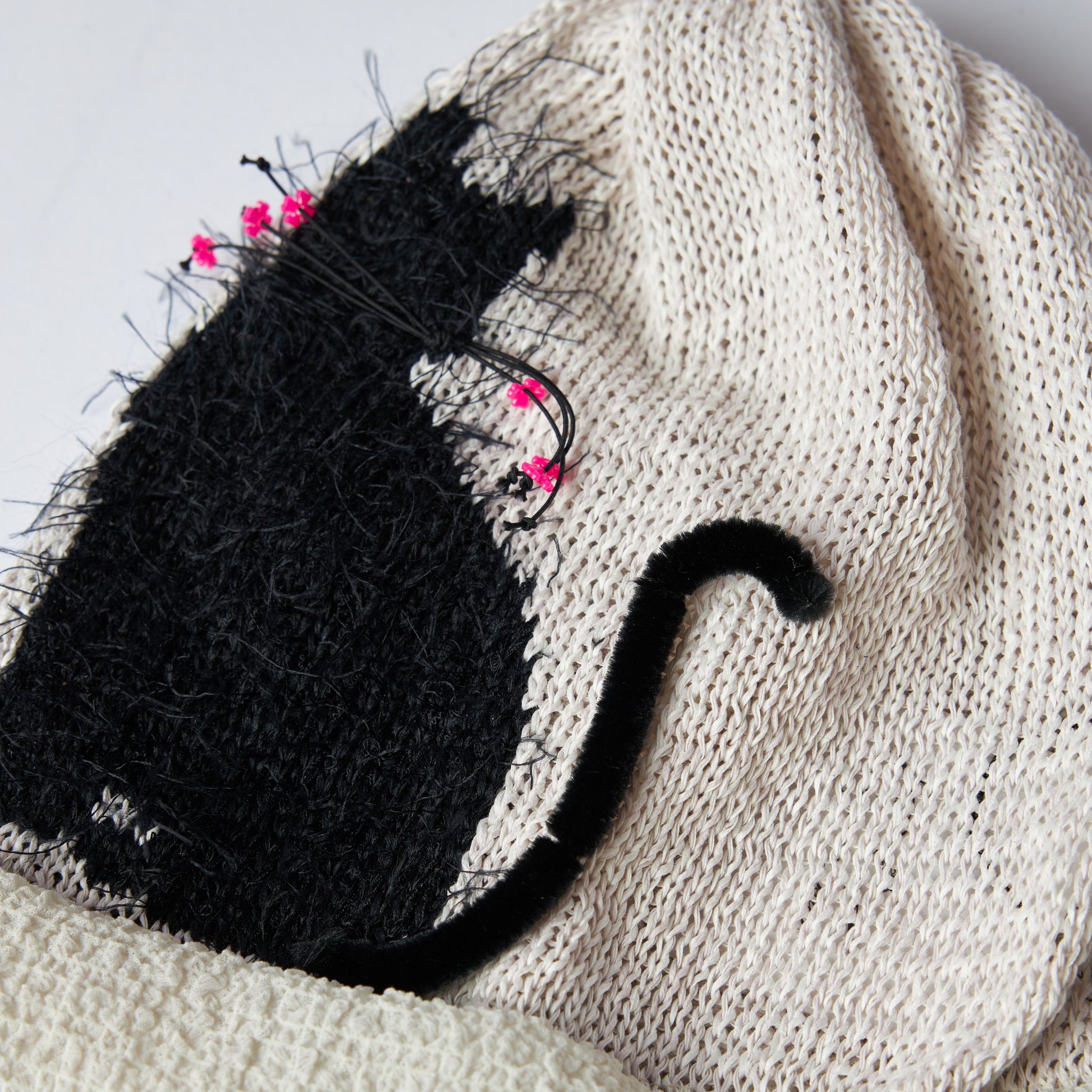 毛足のある糸でネコのシルエット柄を編み込んだギマ糸ベースのニットキャップを作りました。