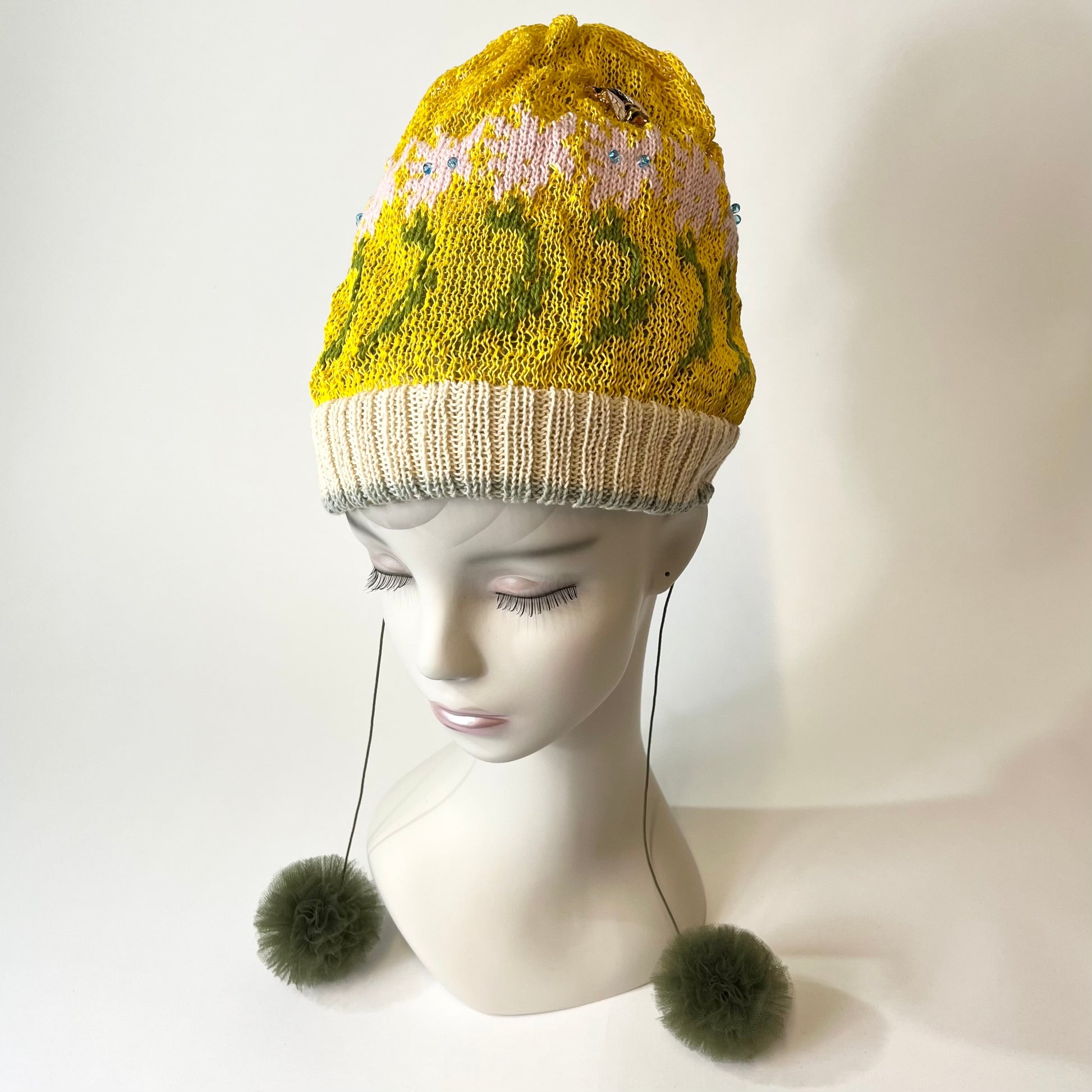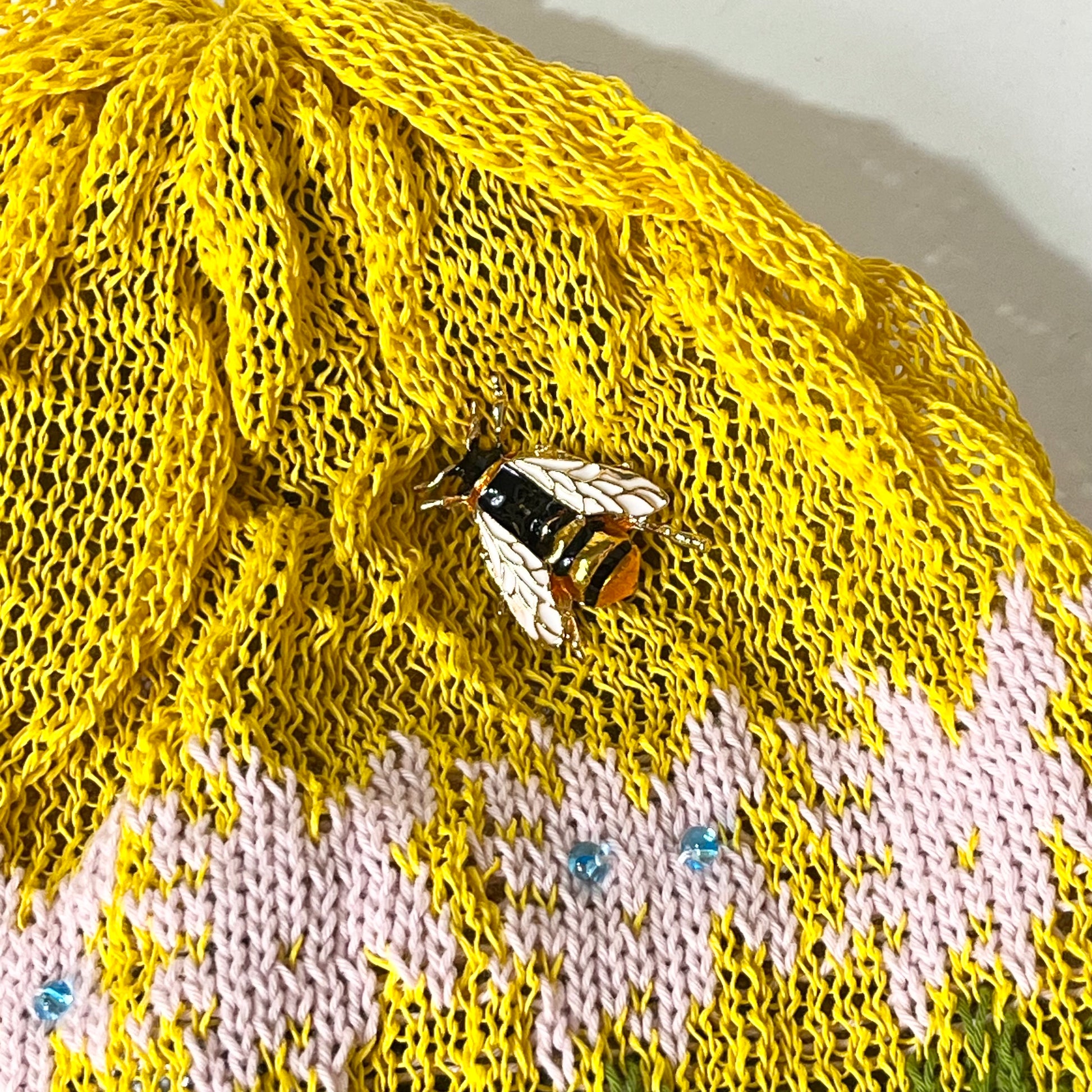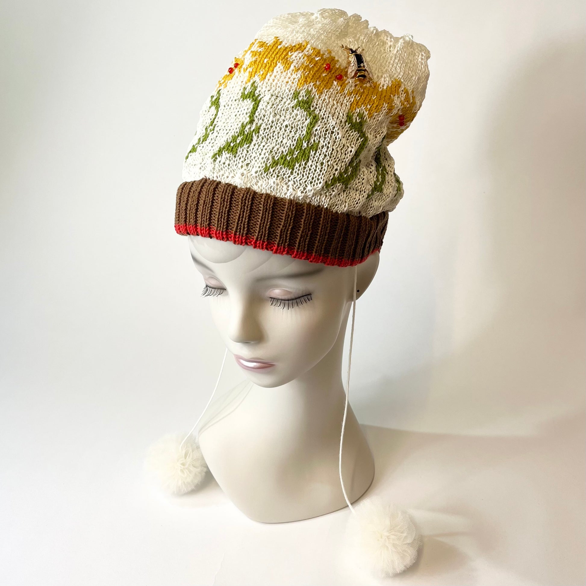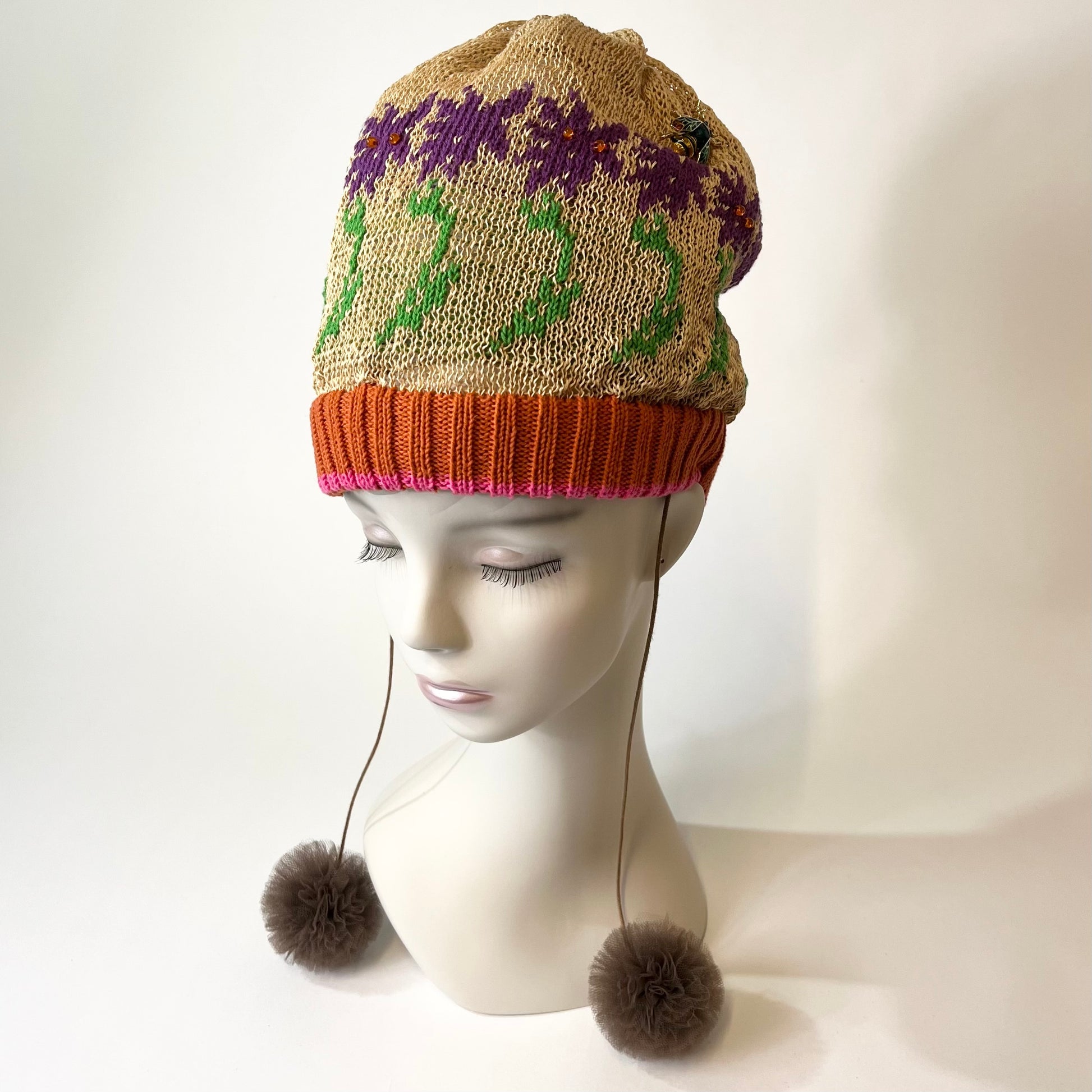 ギマ糸花編込み。春先に明るく楽しい花の合唱体をかぶりハチも楽しそうに花のまわりを飛び廻っています。下に下がったポンポンをあそびでよりたのしくさっそうと、、、