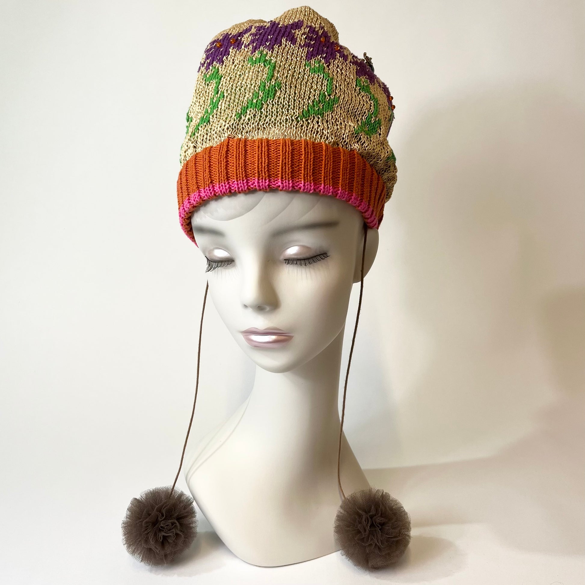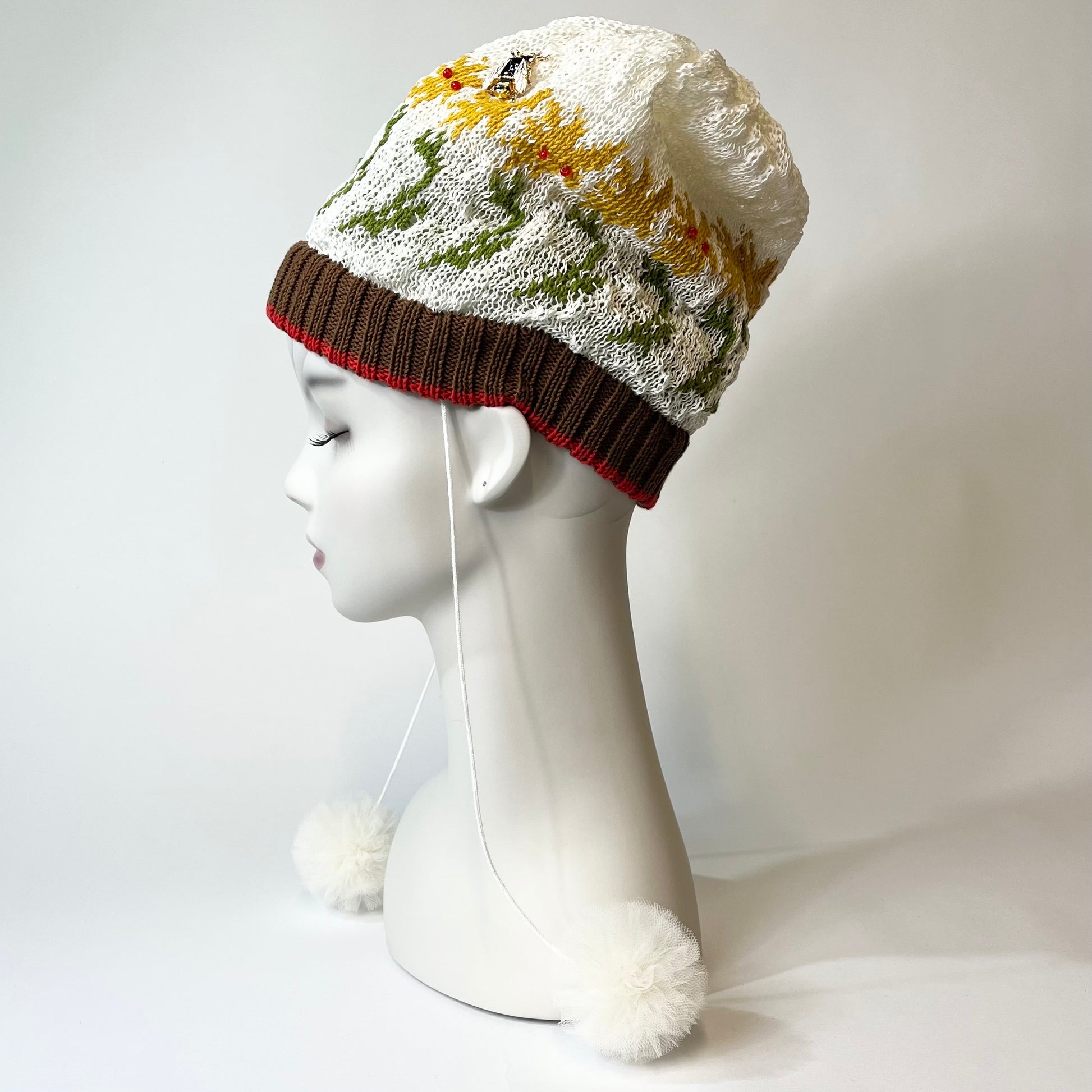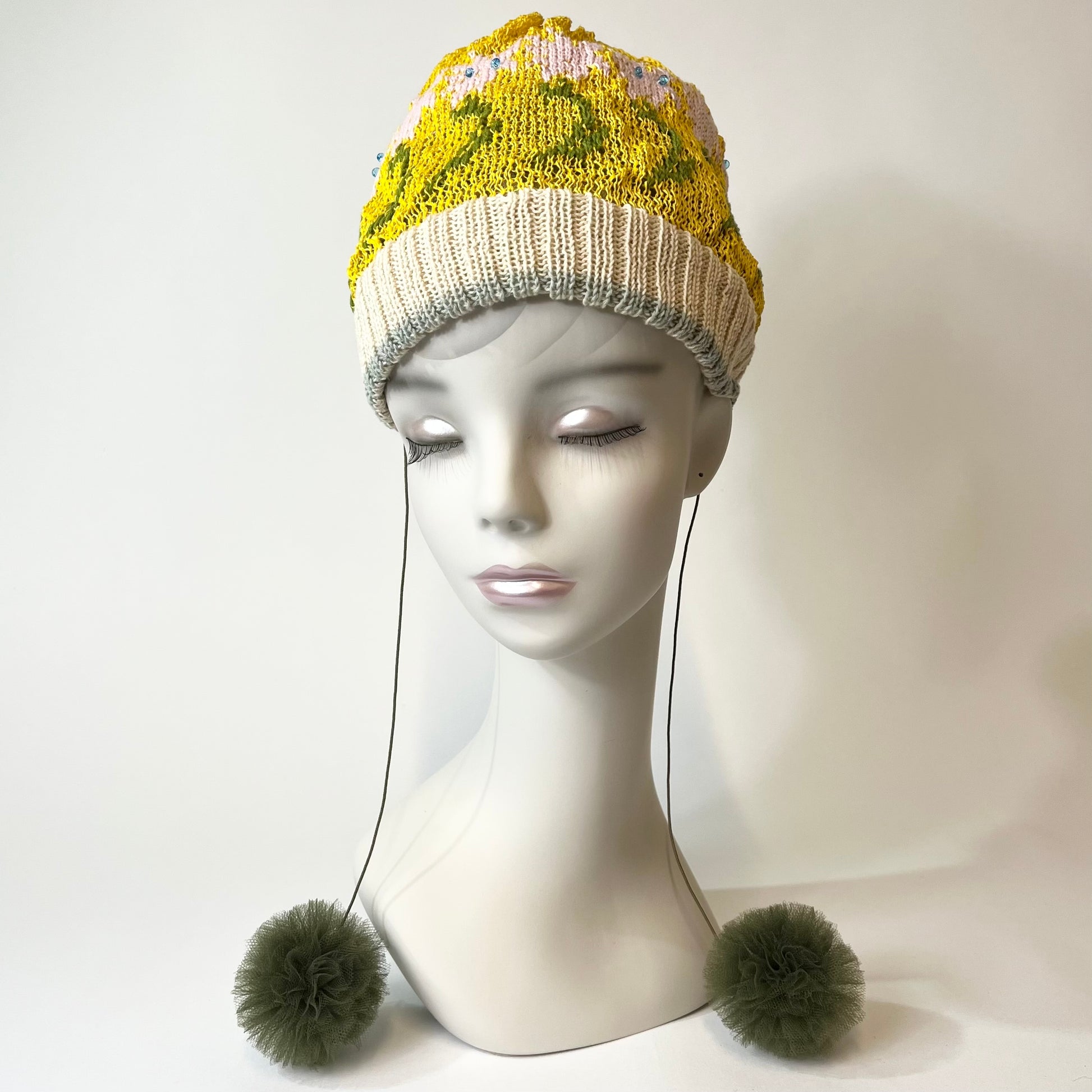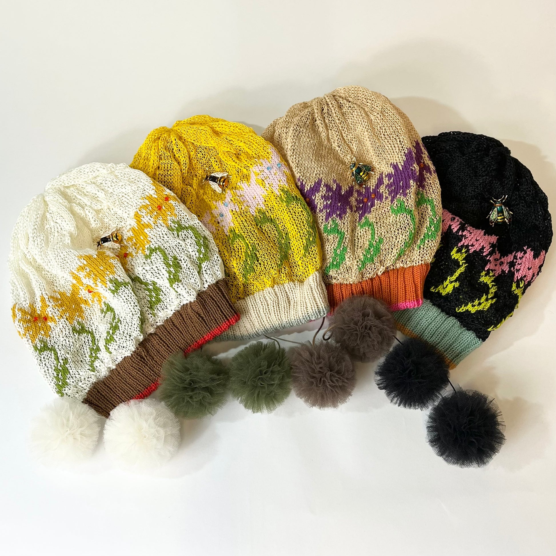 ギマ糸花編込み。春先に明るく楽しい花の合唱体をかぶりハチも楽しそうに花のまわりを飛び廻っています。下に下がったポンポンをあそびでよりたのしくさっそうと、、、