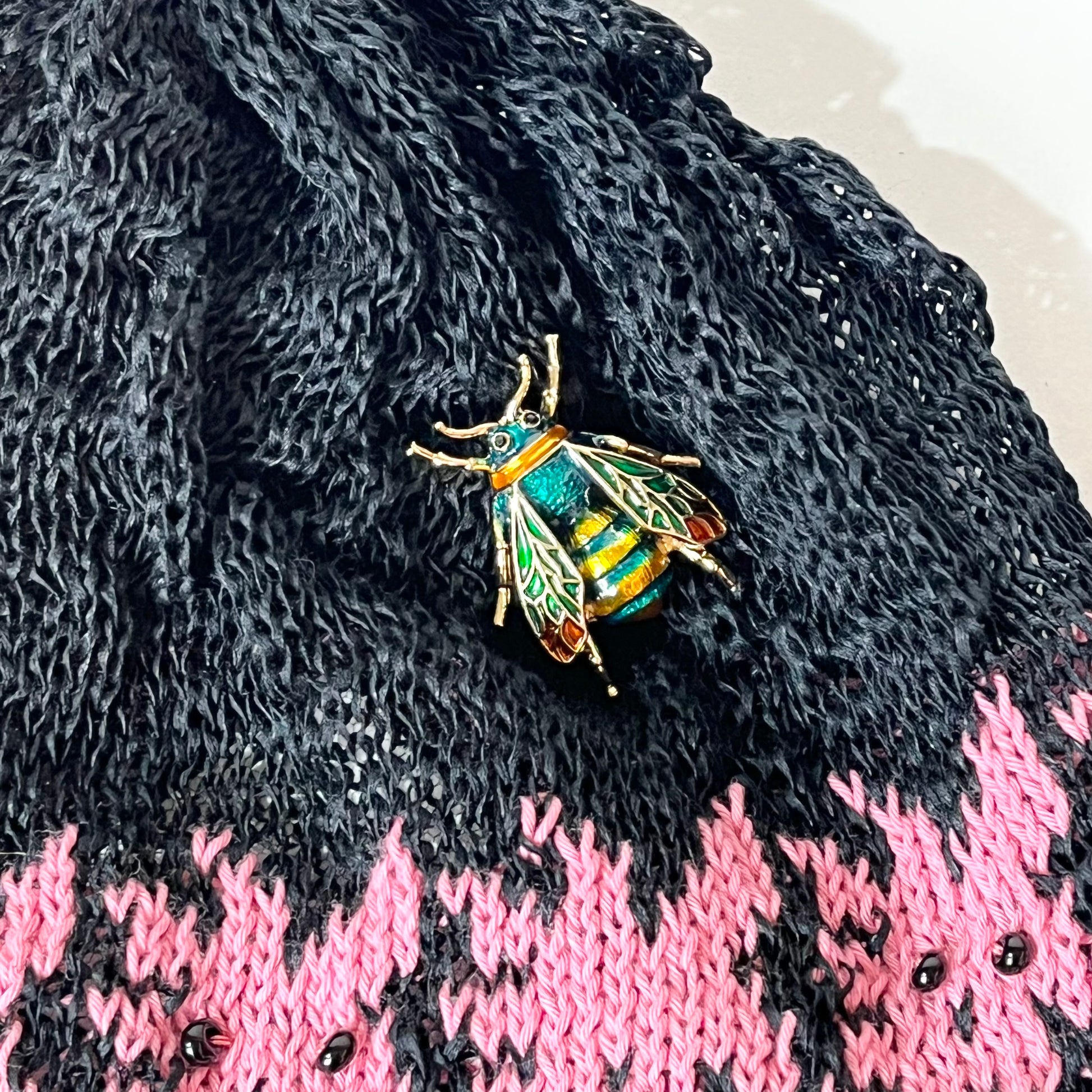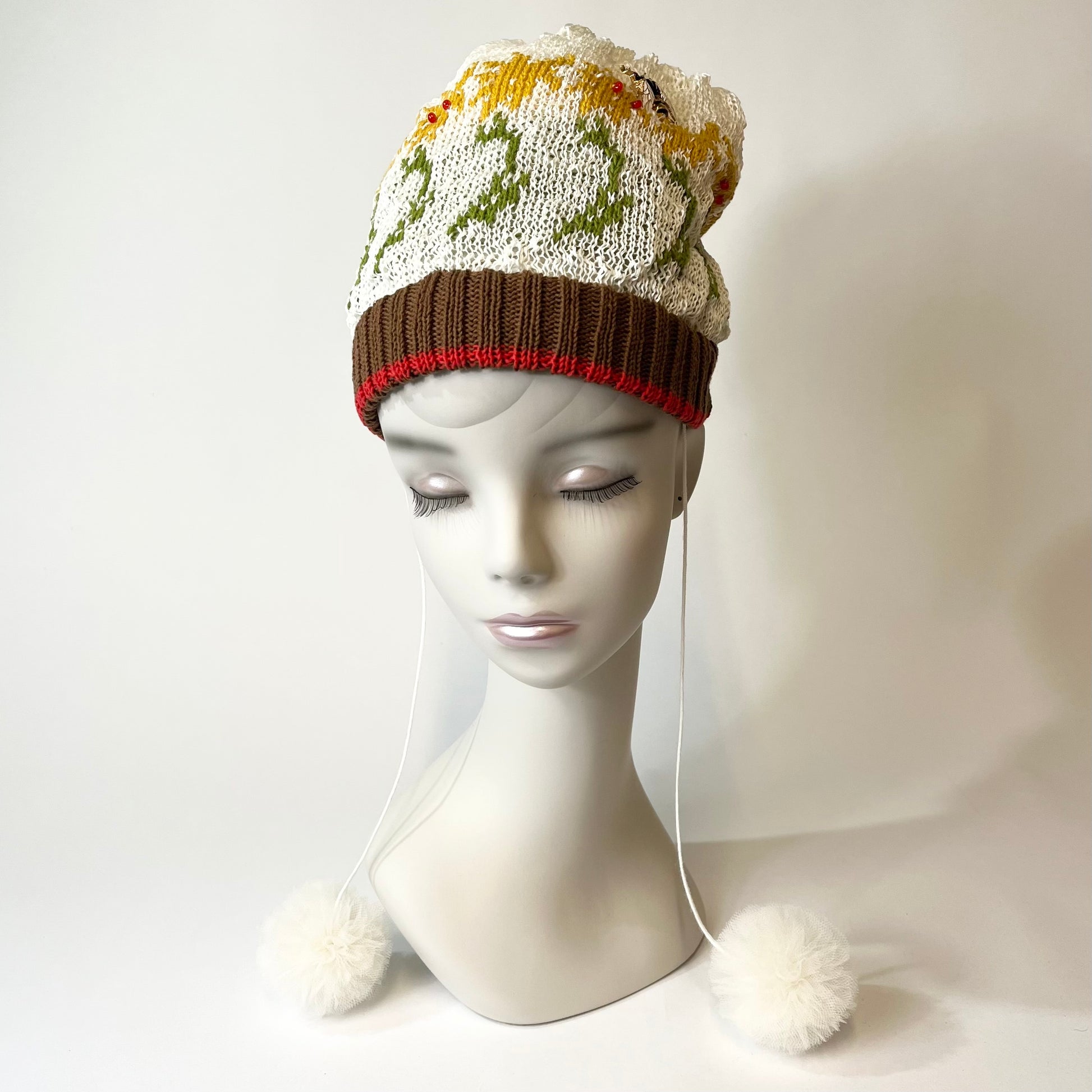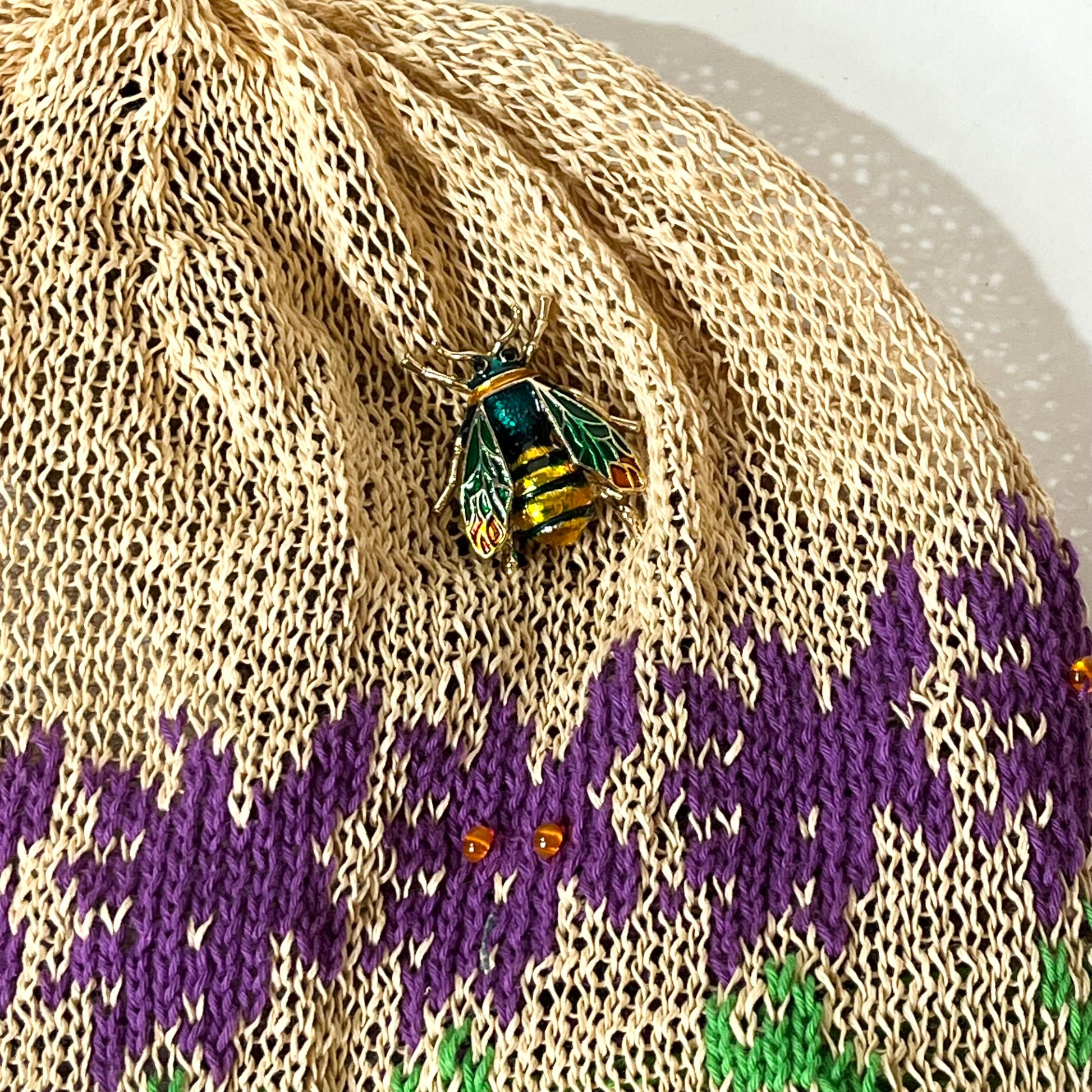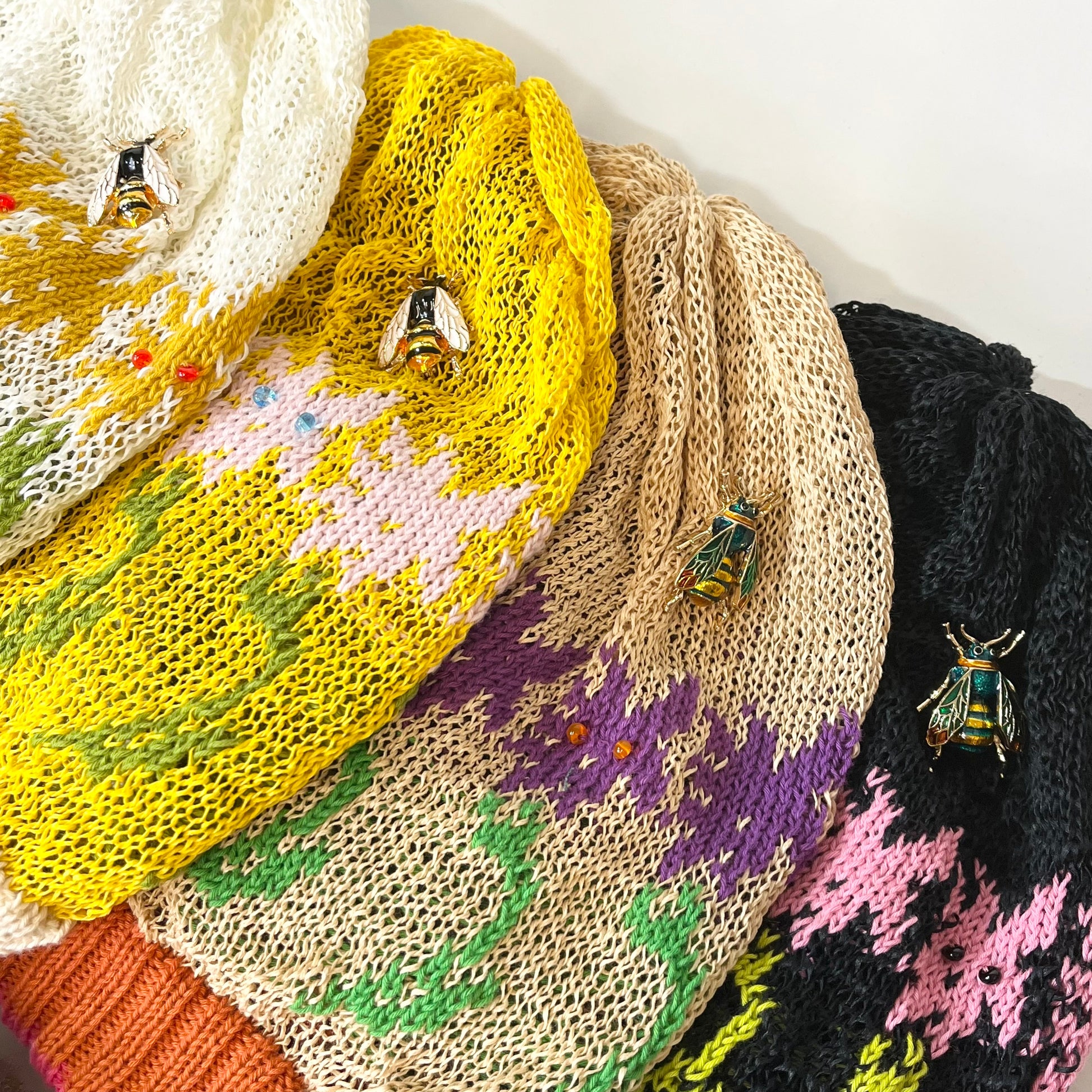 ギマ糸花編込み。春先に明るく楽しい花の合唱体をかぶりハチも楽しそうに花のまわりを飛び廻っています。下に下がったポンポンをあそびでよりたのしくさっそうと、、、