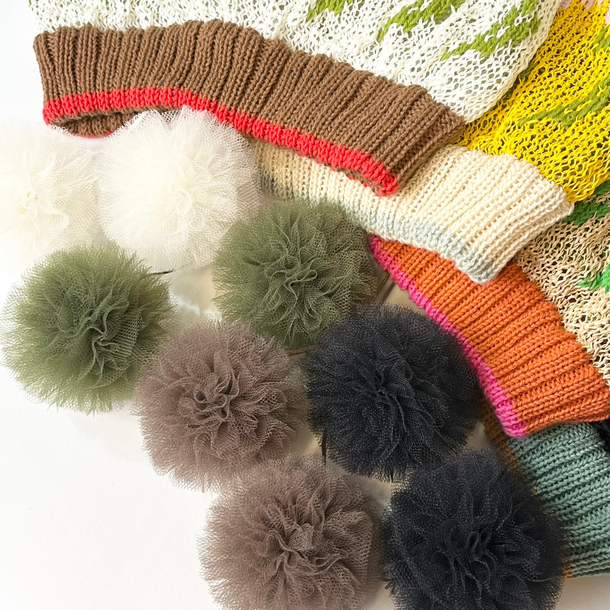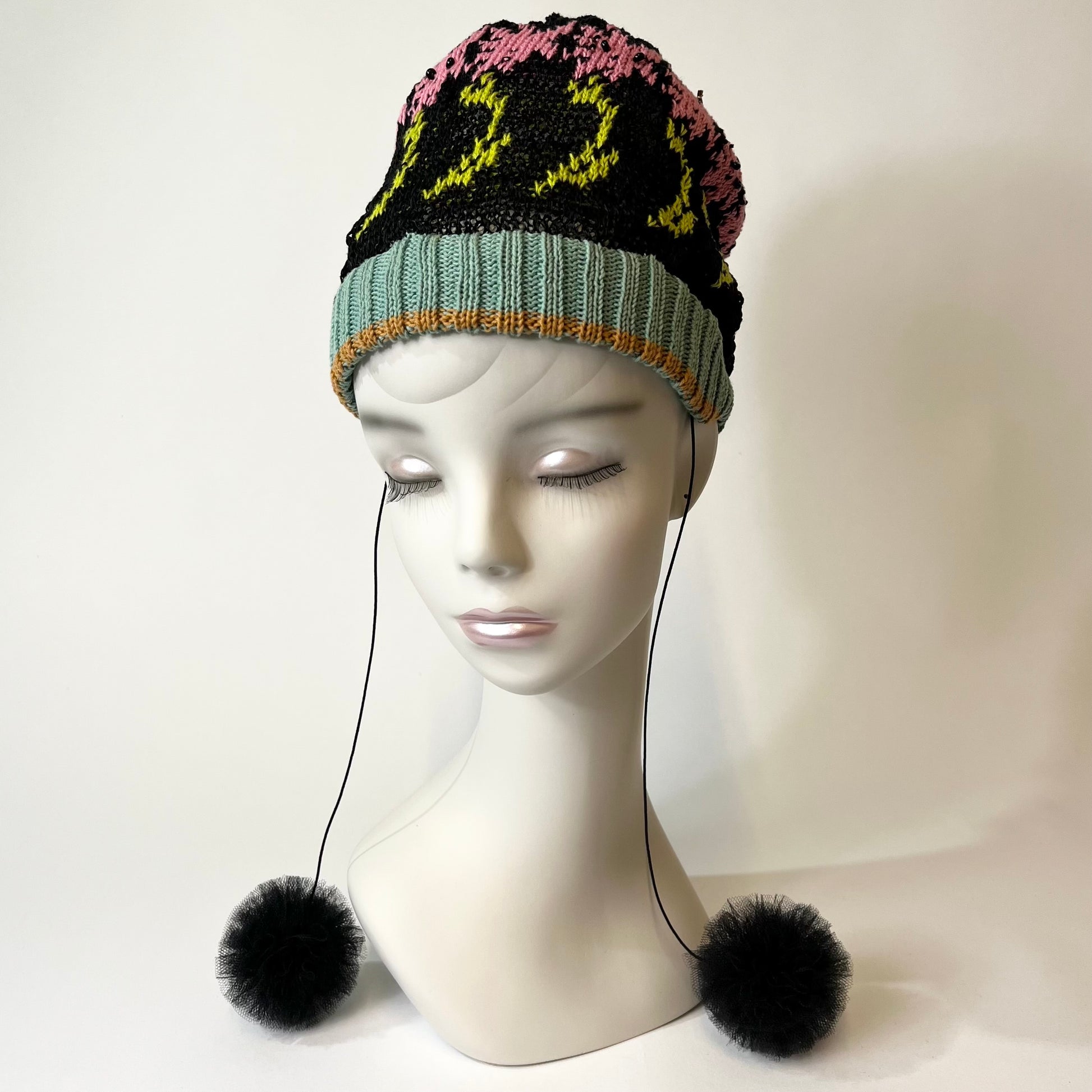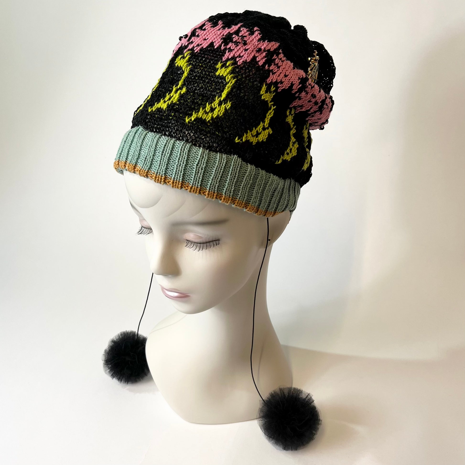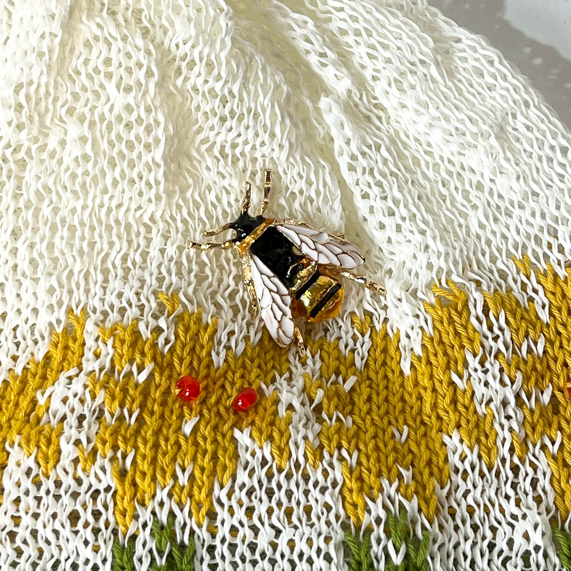 ギマ糸花編込み。春先に明るく楽しい花の合唱体をかぶりハチも楽しそうに花のまわりを飛び廻っています。下に下がったポンポンをあそびでよりたのしくさっそうと、、、