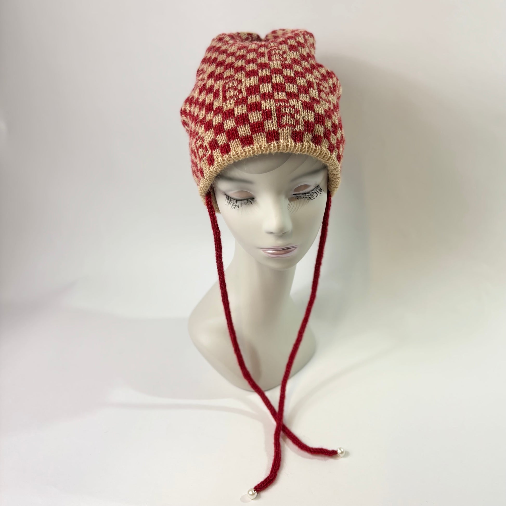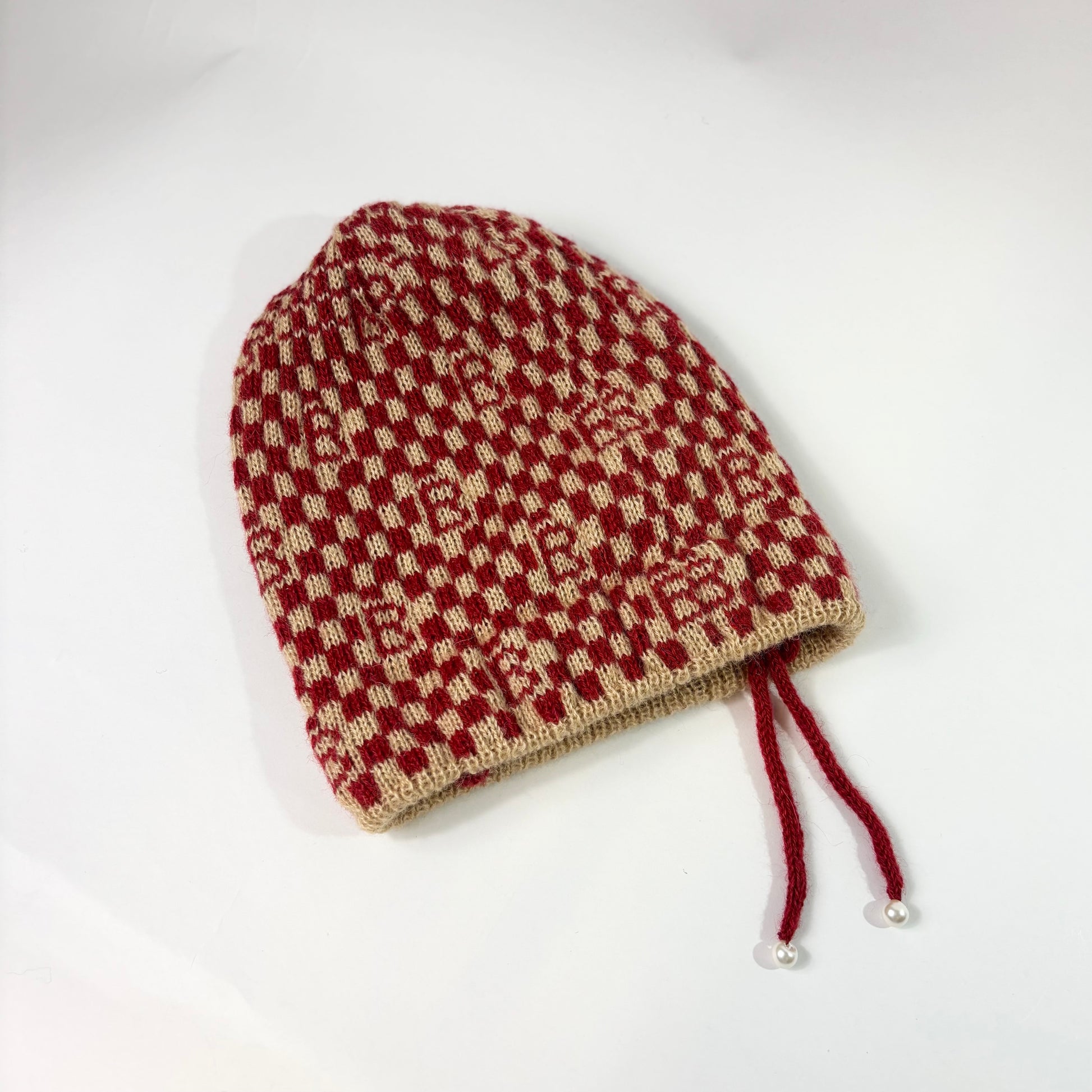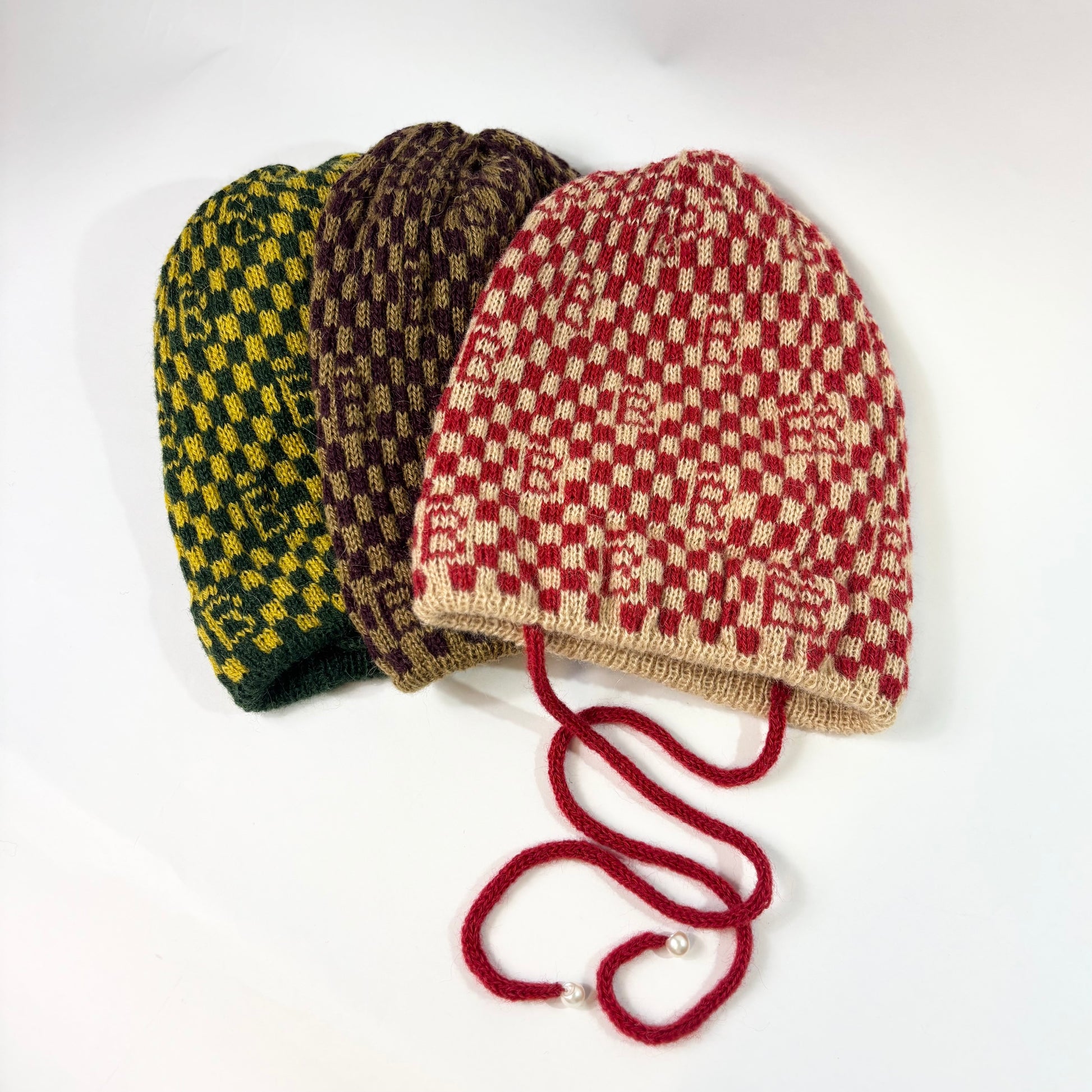 BBチェッカー柄を編み込んだ少し長めのニットキャップに、