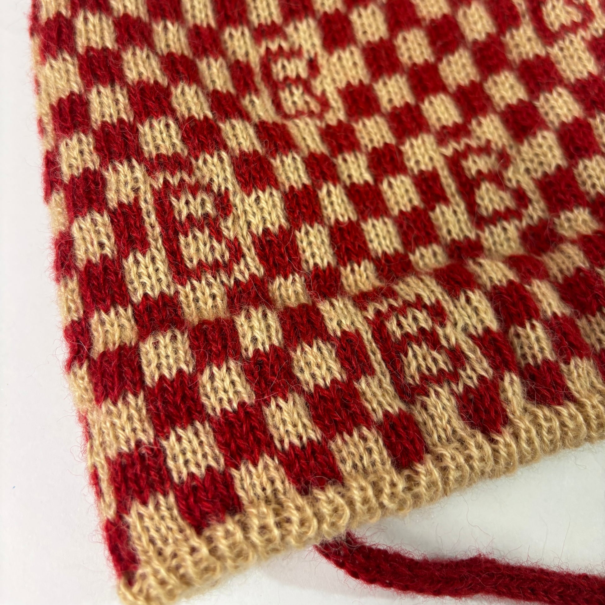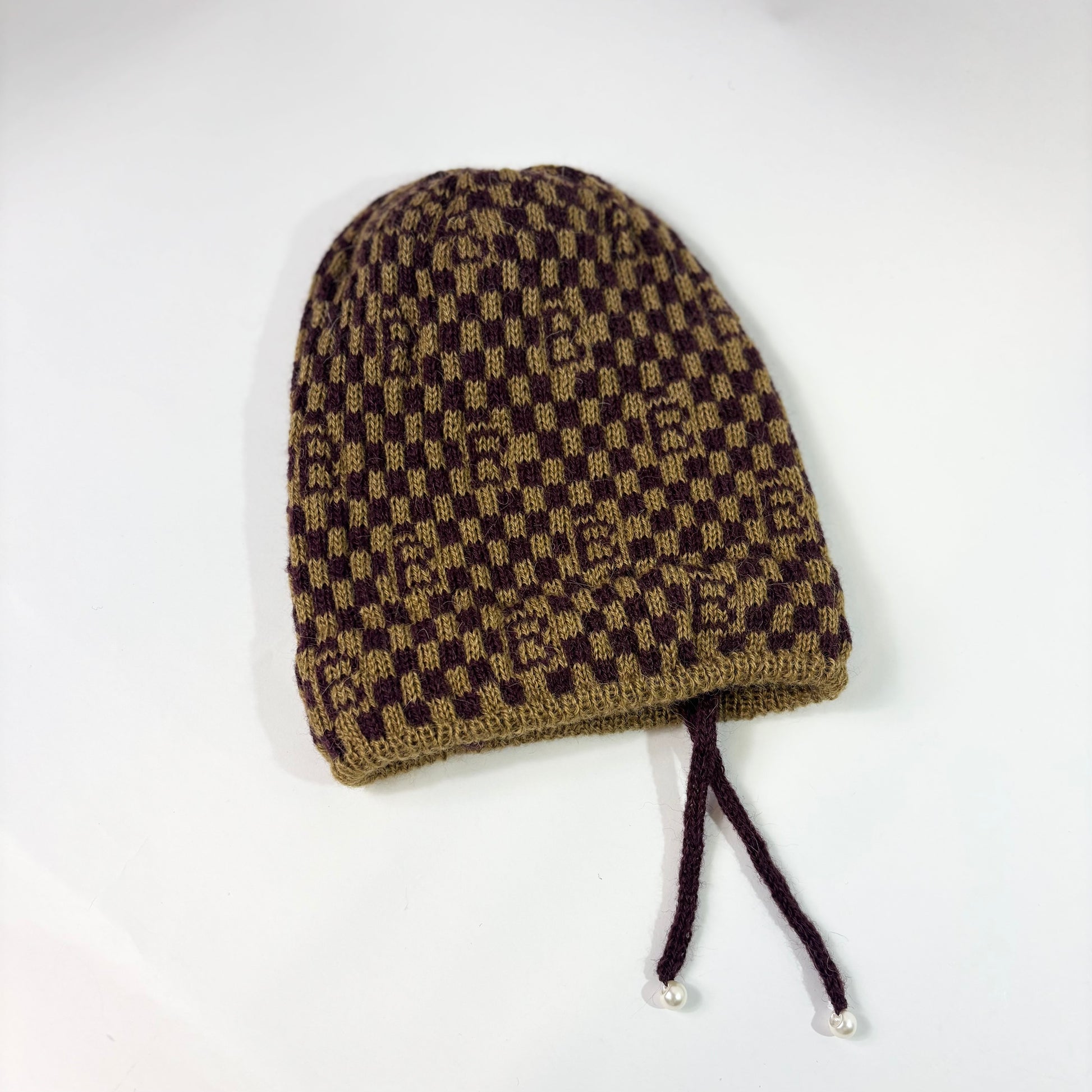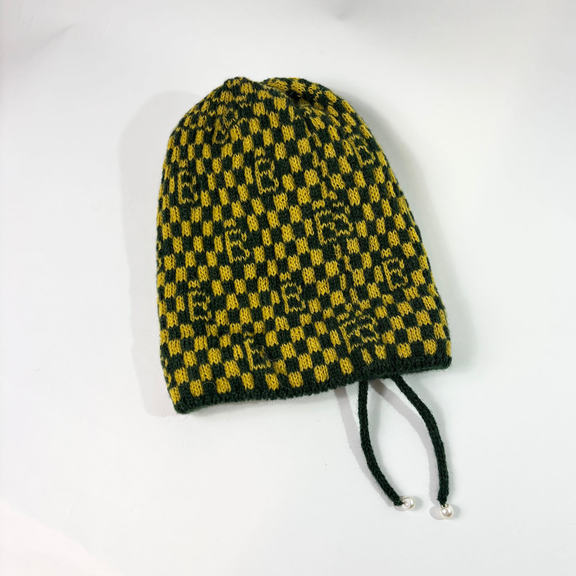 BBチェッカー柄を編み込んだ少し長めのニットキャップに、