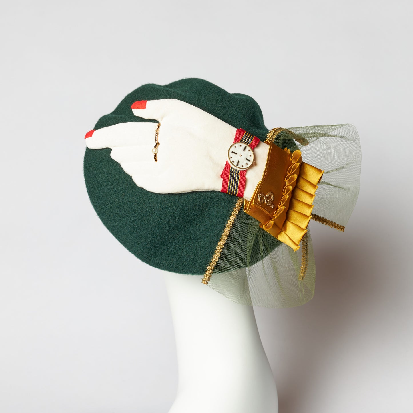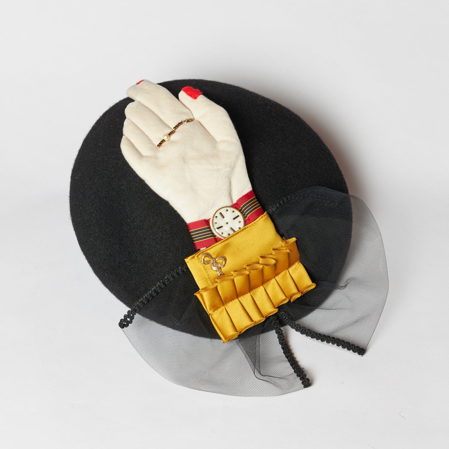 モントル=うで時計(仏)。うで時計がモチーフのベレー。時計の針はなく、時を忘れて買い物をしましょう!という思いをこめてデザインしました。