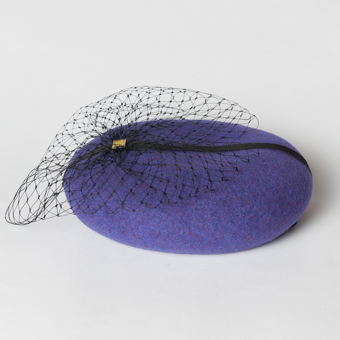 糸を縮絨してフェルト状にしたものをベレーに仕上げ、ベーシックなベールを飾り付けました。小ぶりなベレーで、年齢問わずかぶれるベレーです。サイドからたれるヒモは結んだり、垂らしたり、ベレーの中にしまってベーシックなベレーとしてもかぶれます。