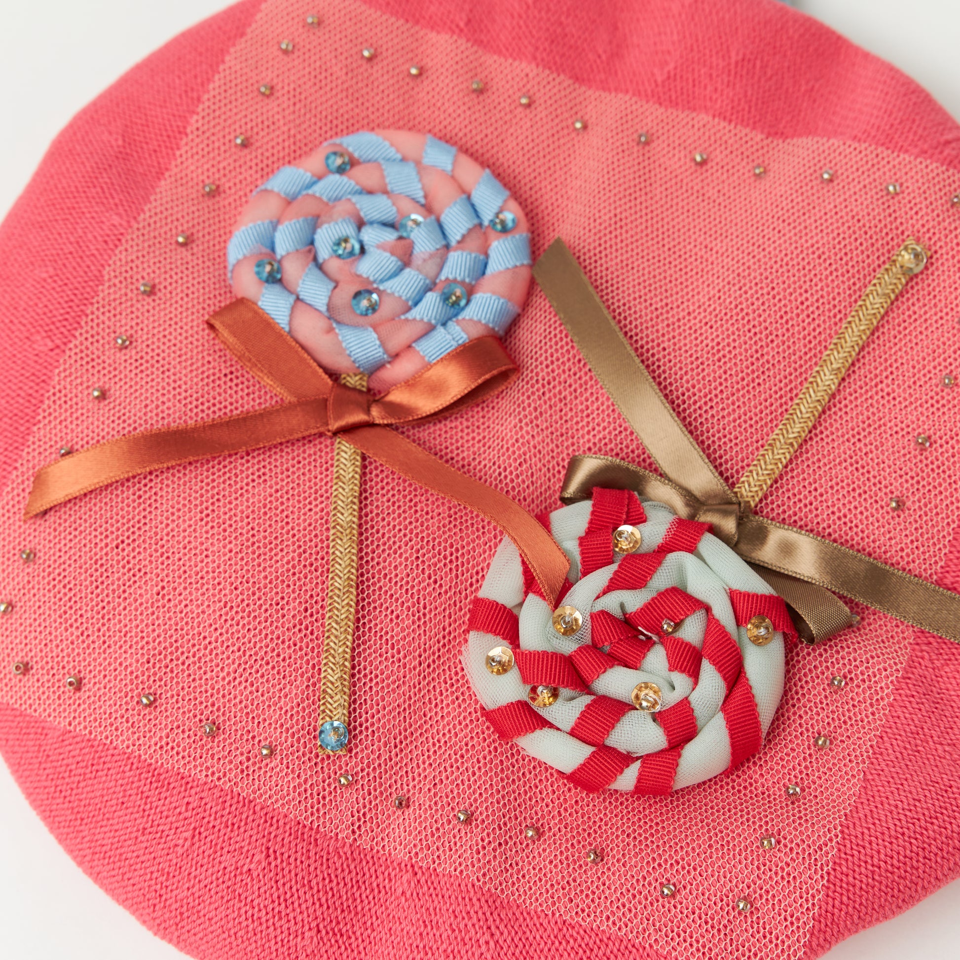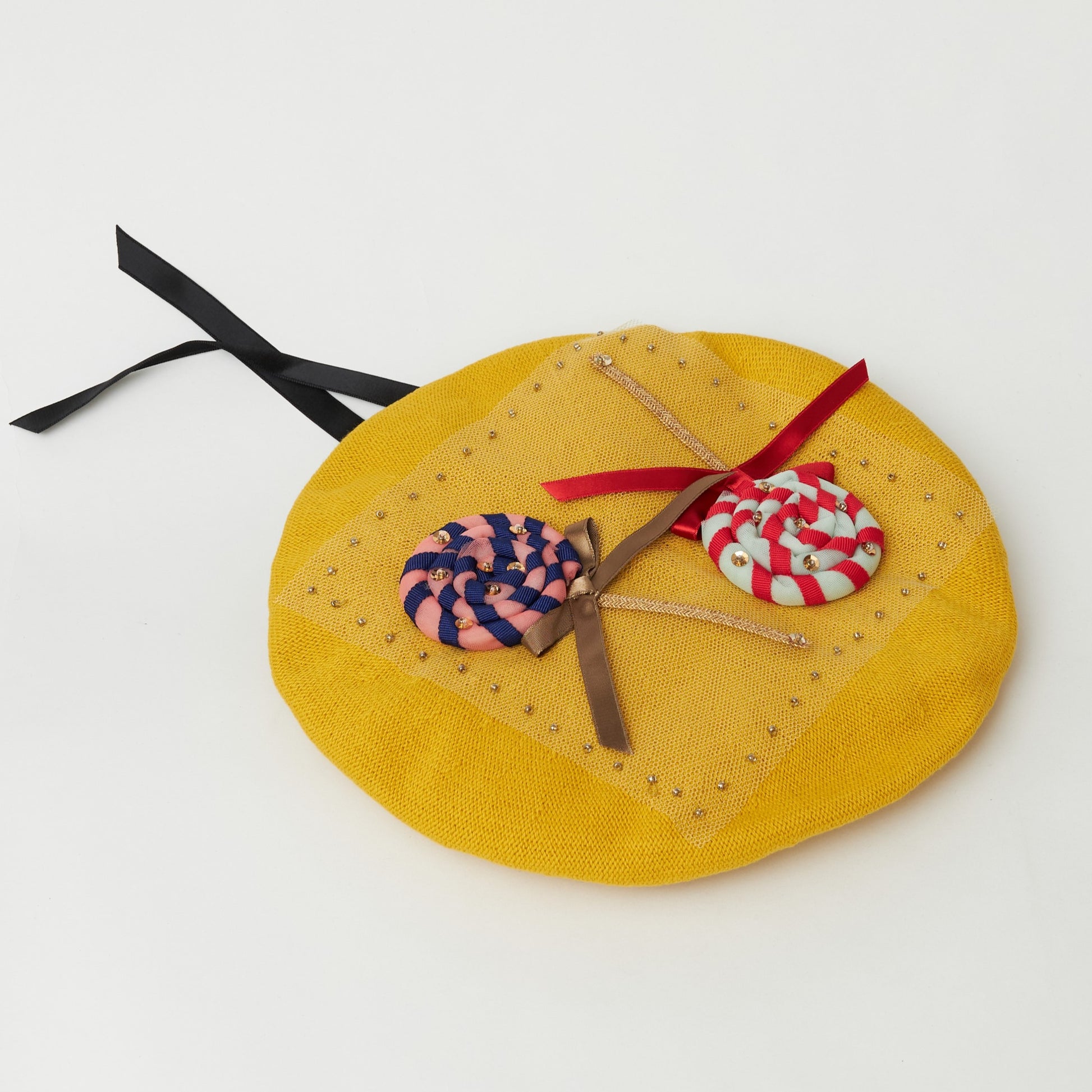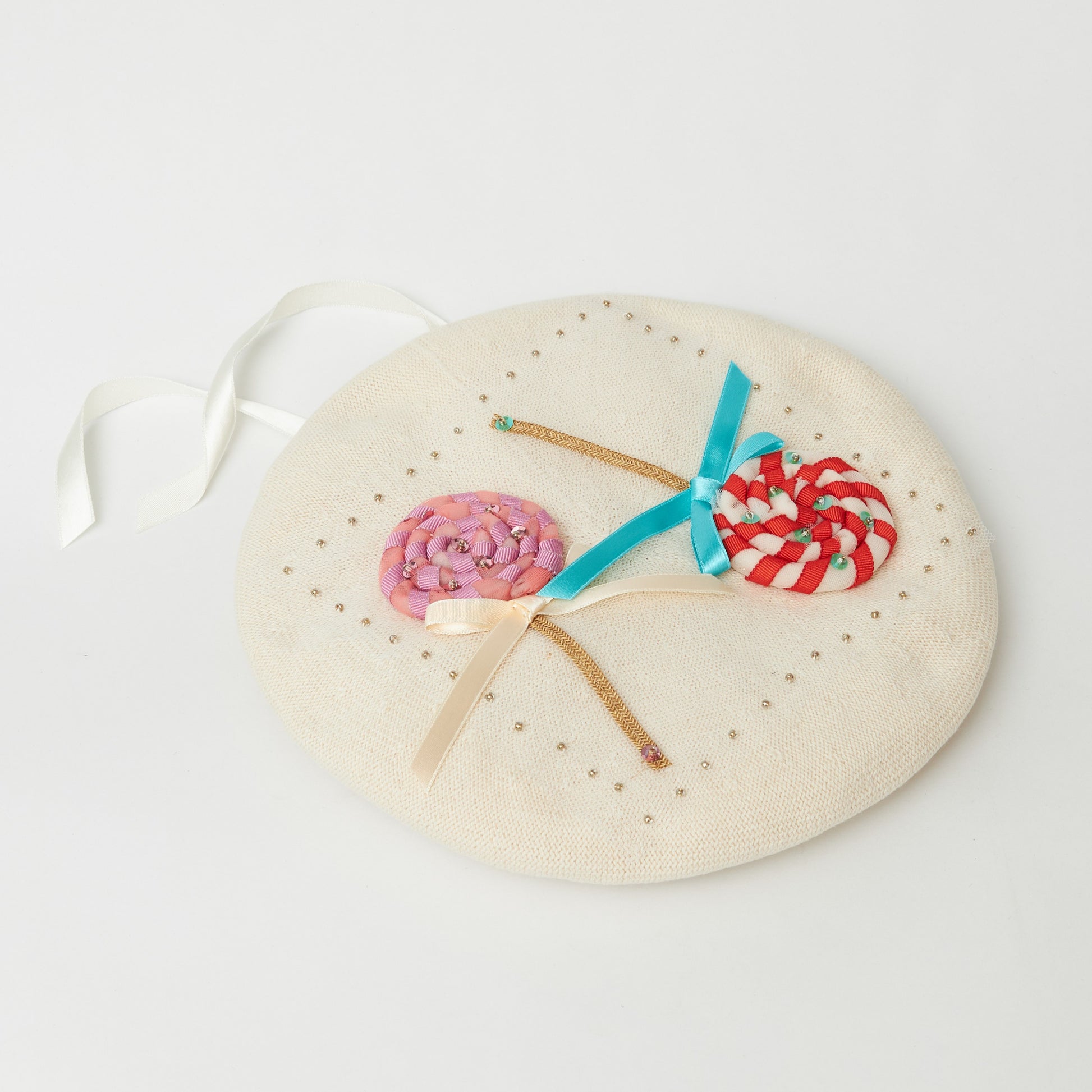 フランスのパティスリーのショーケースに並んでいたらかわいいキャンディーをあしらったベレー。被っている方も見る方も思わずふふふ♪となる遊び心のあるベレーです。