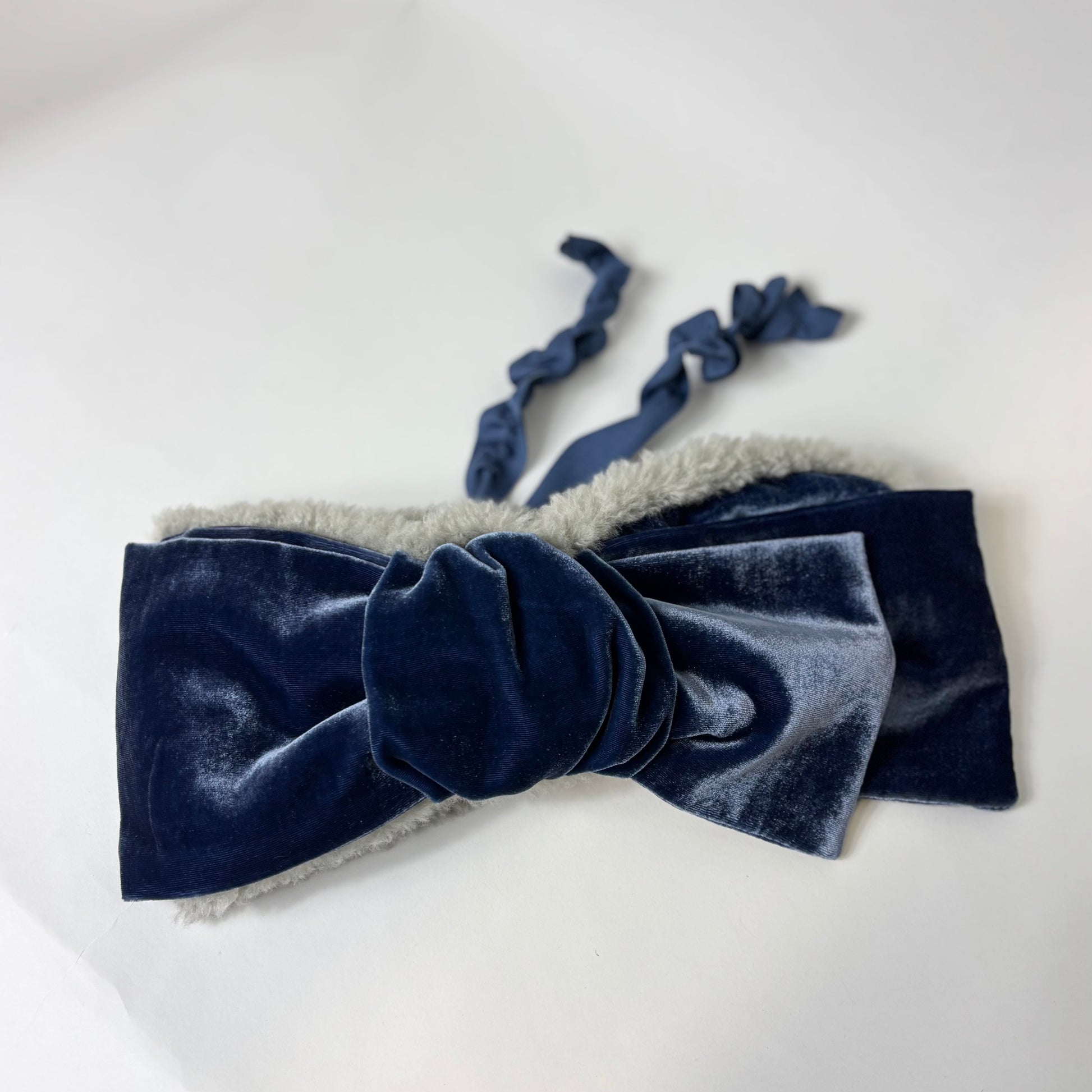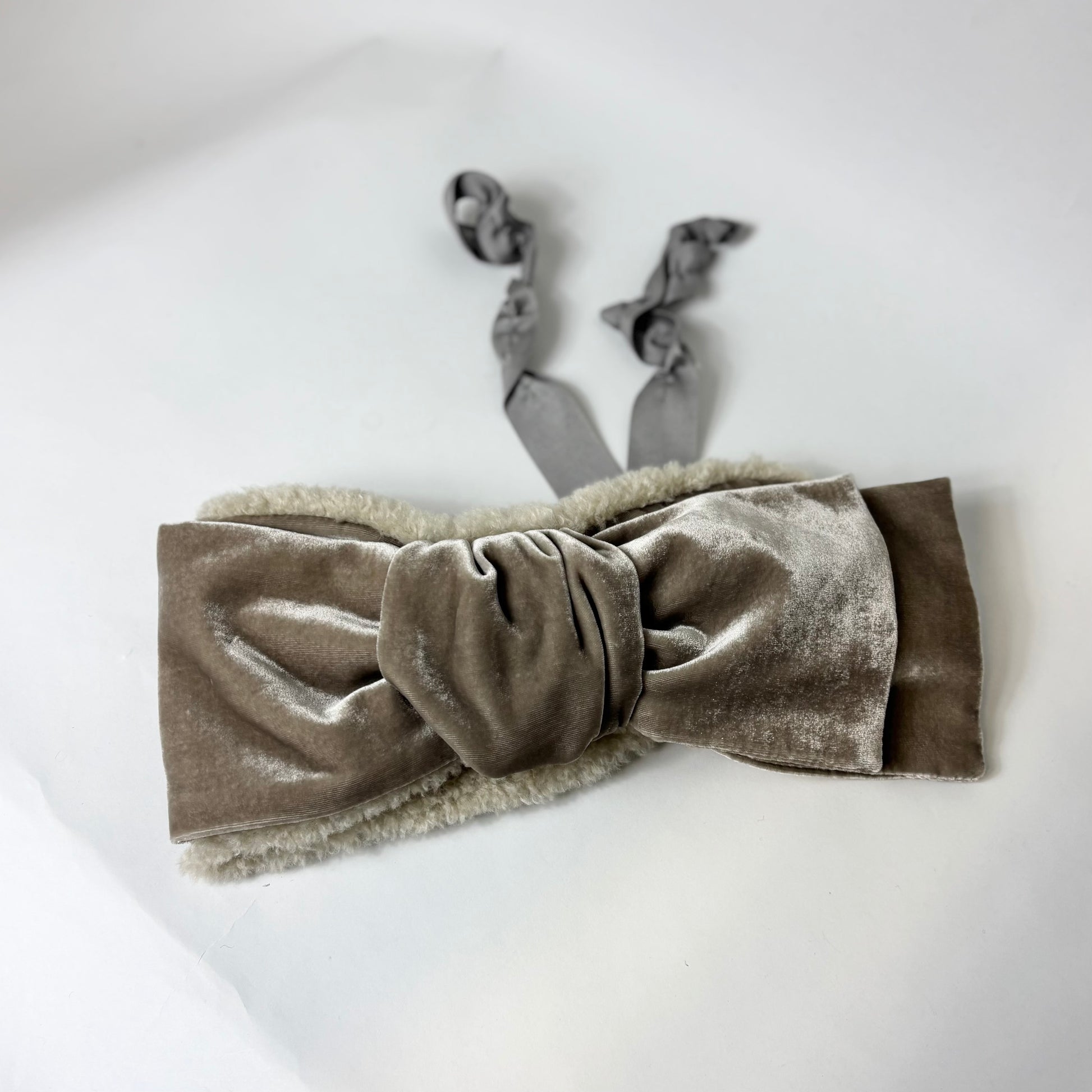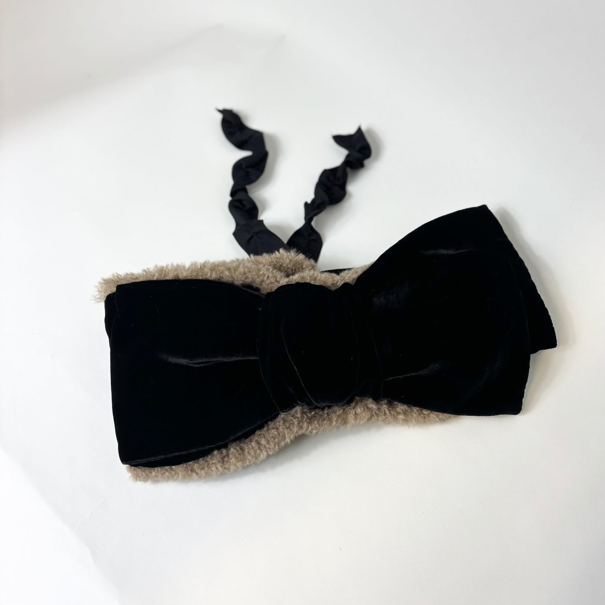 シルクベルベットの大きなリボンが目を引く、ヘアバンドタイプのイヤマフ。