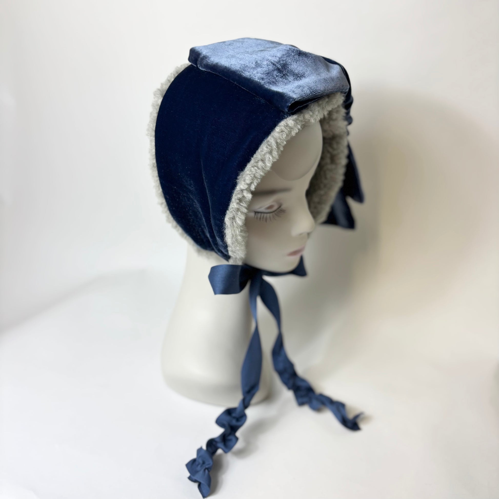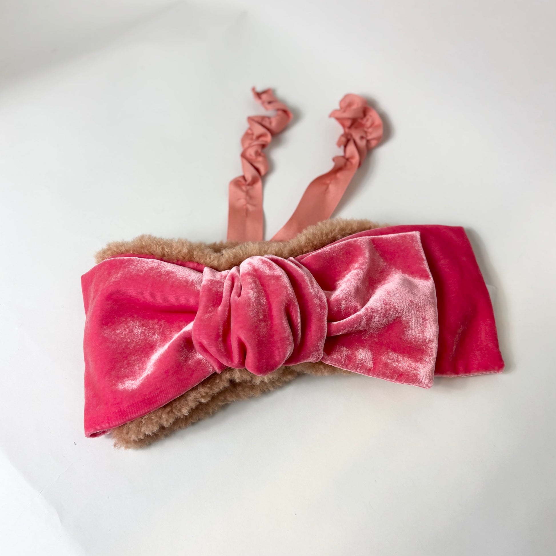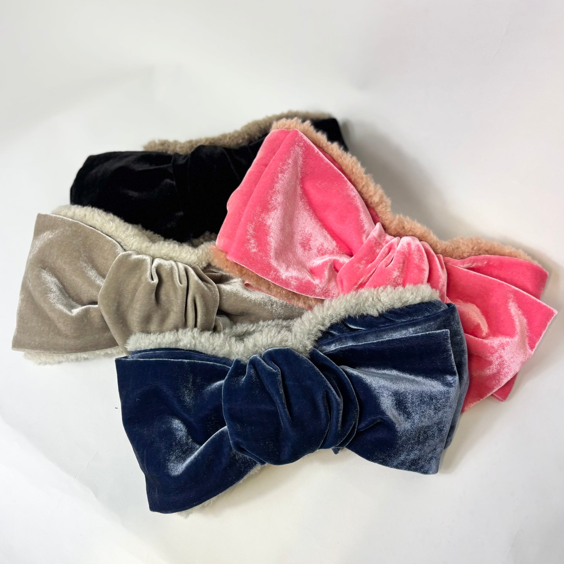 シルクベルベットの大きなリボンが目を引く、ヘアバンドタイプのイヤマフ。