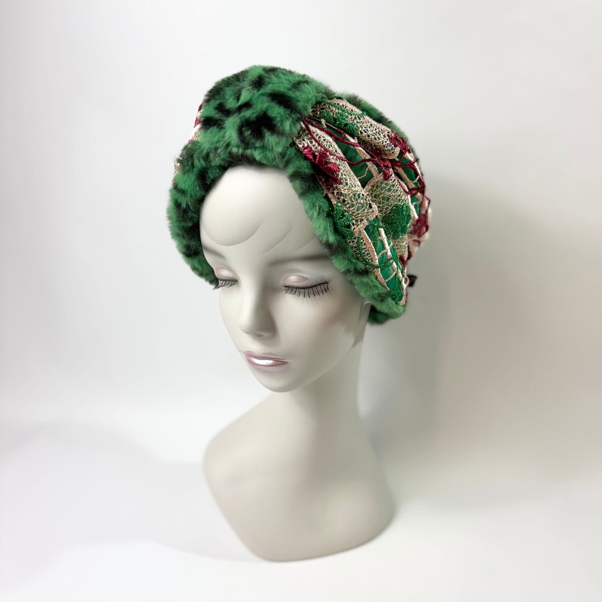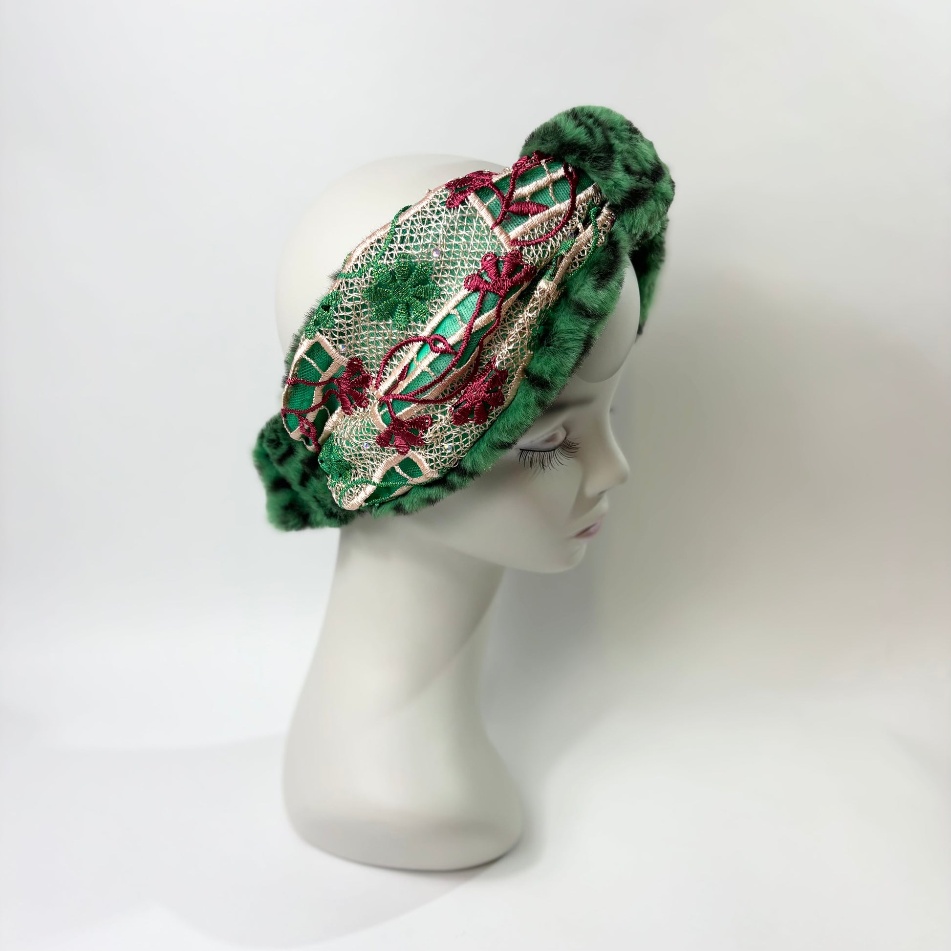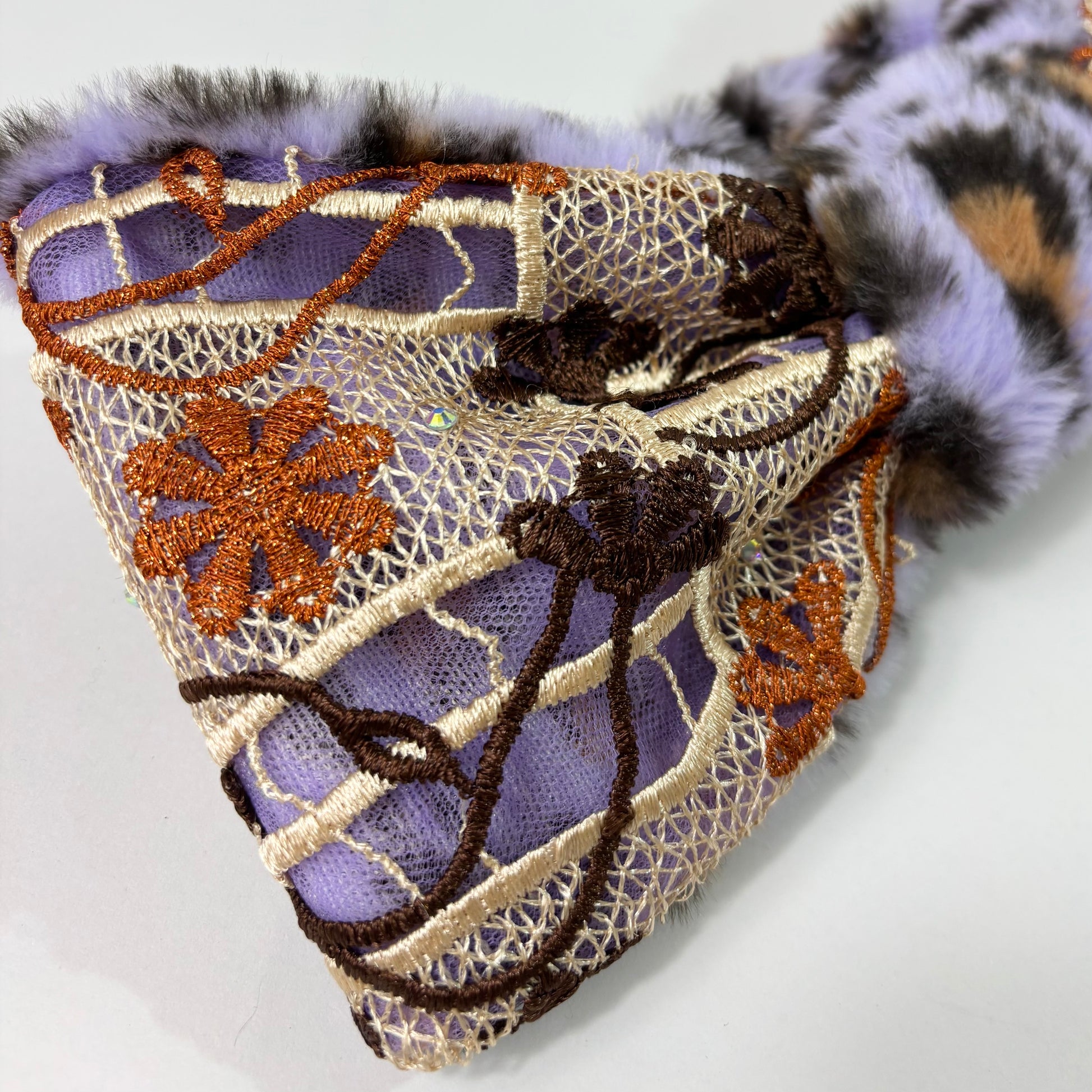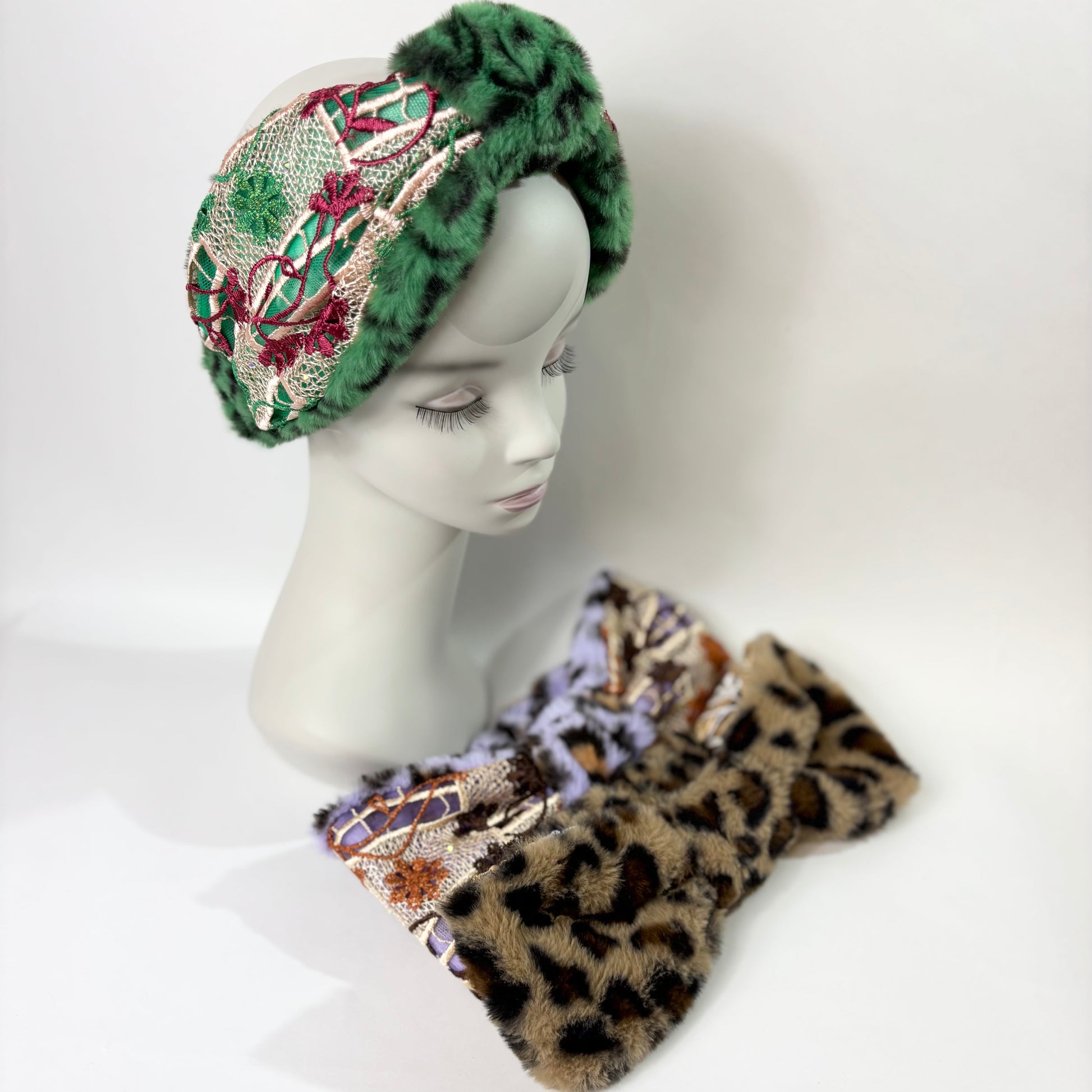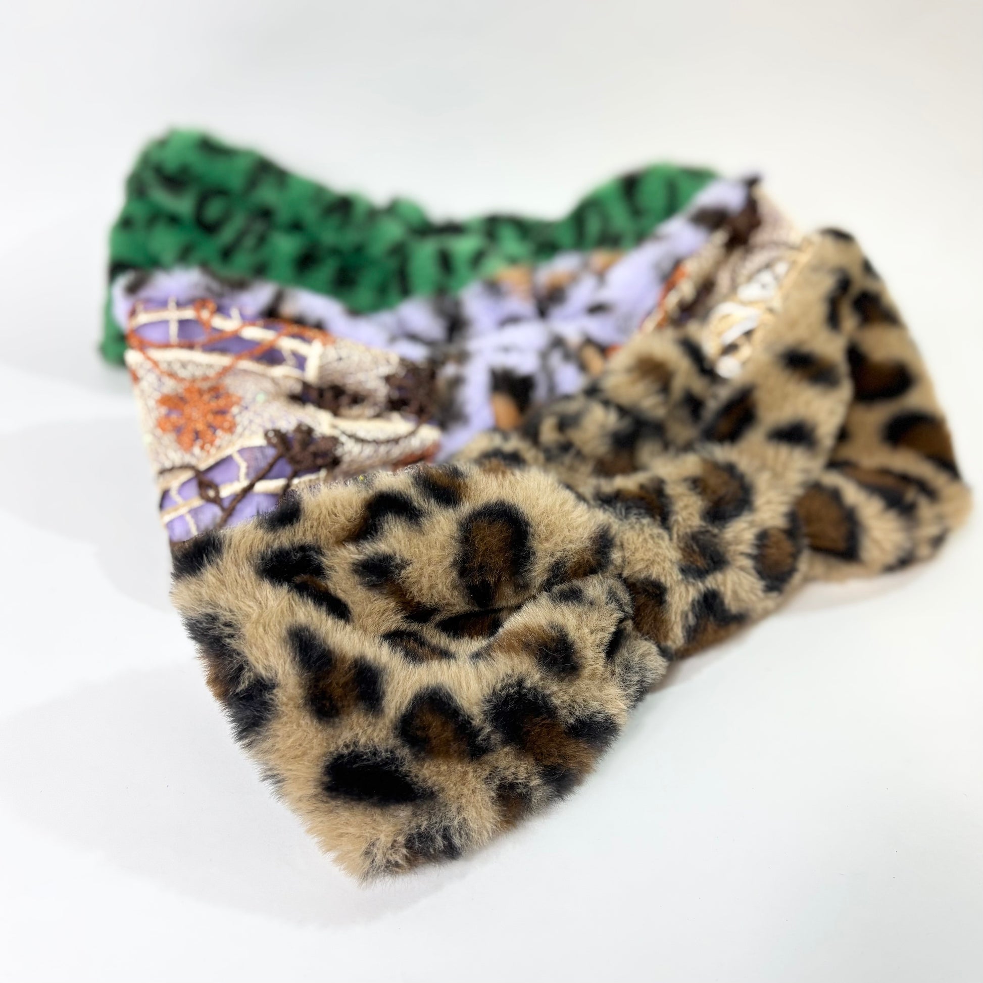 その味わい深いテクスチャーと独特の存在感が、ヘアバンドの片面を華やかに彩ります。