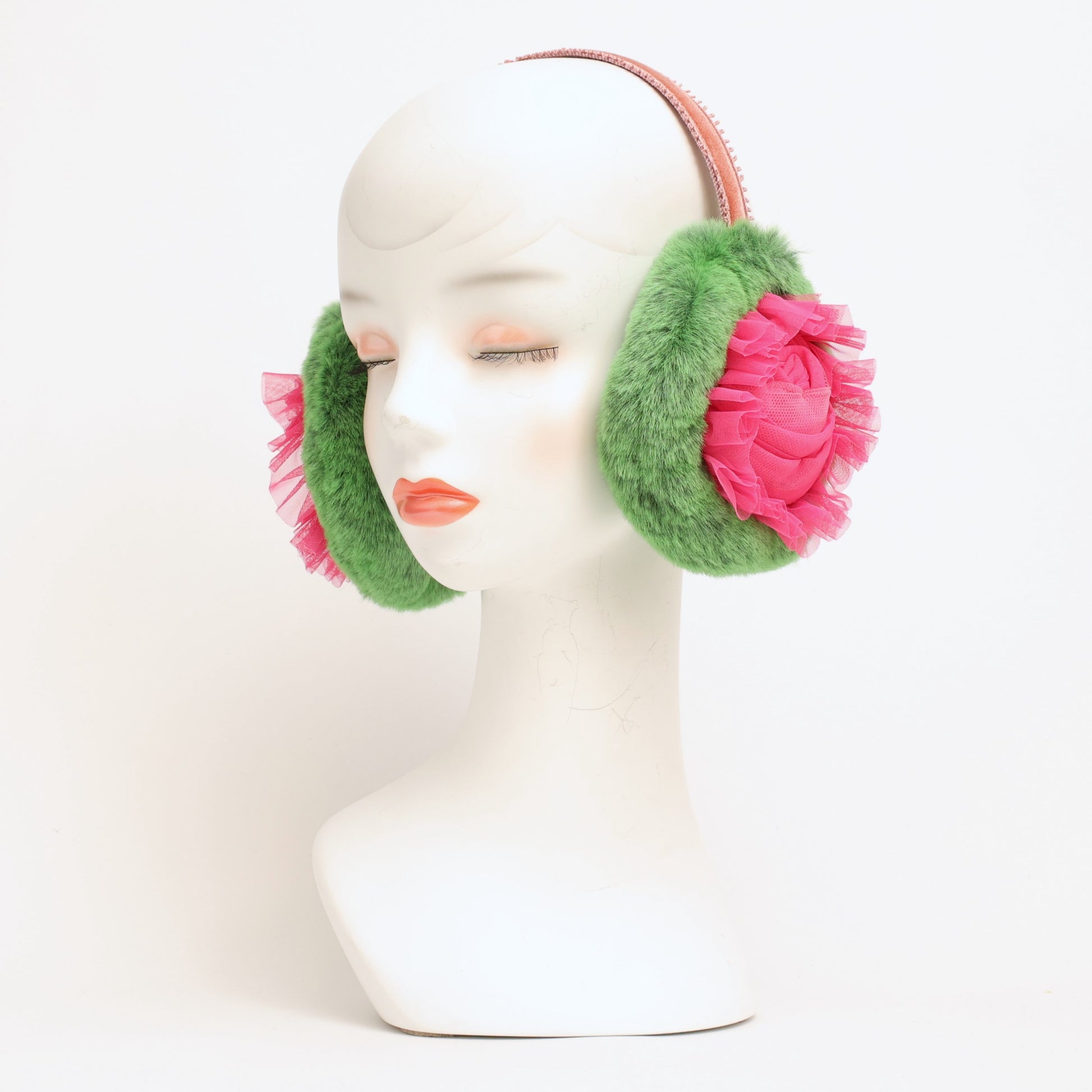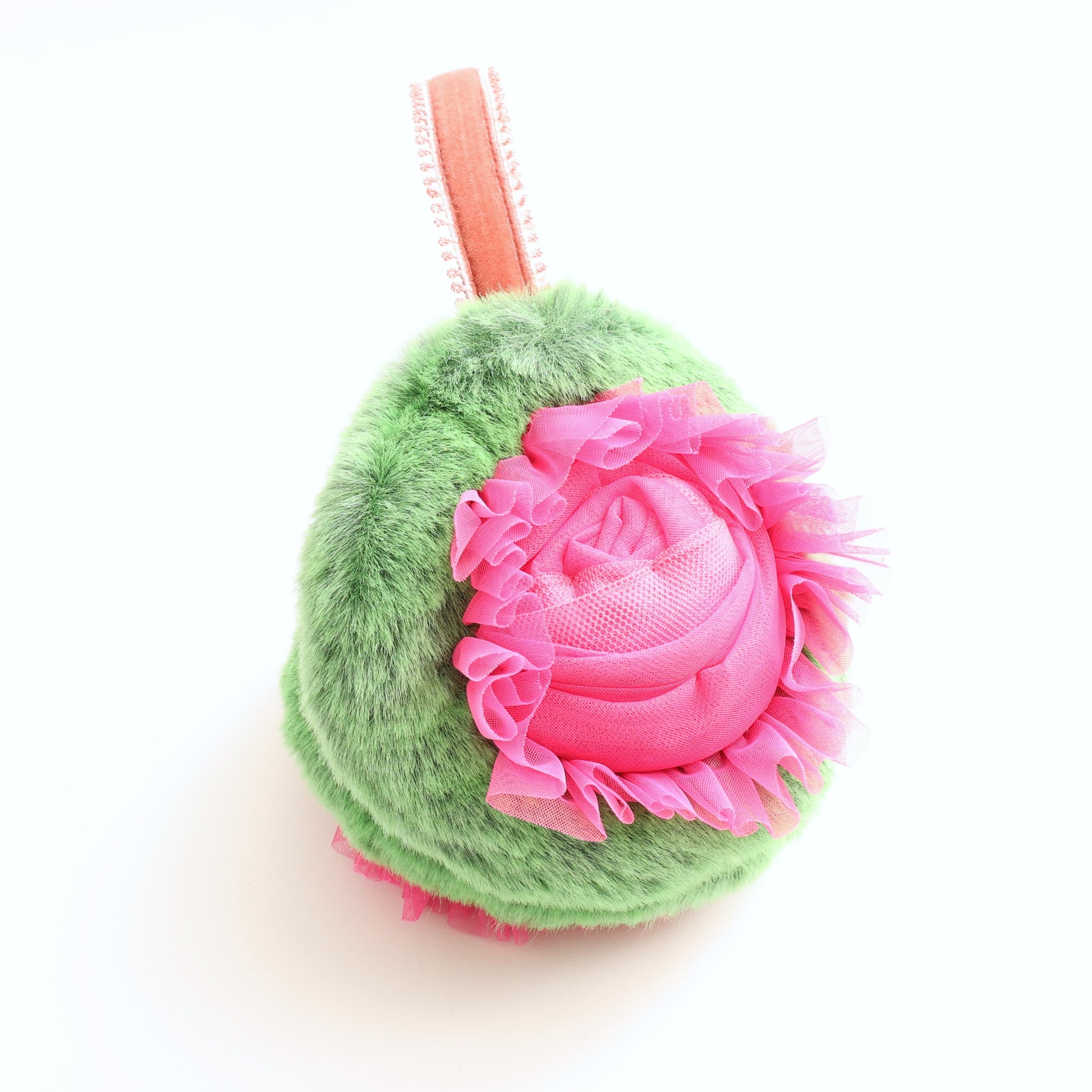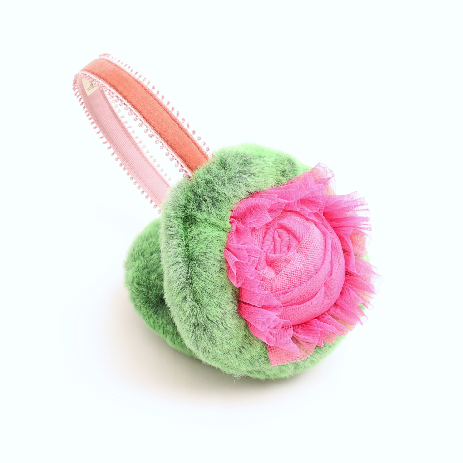 2色のチュールを使用して作った巻きバラとチュールのフリルの組み合わせで、華やかな印象のイヤマフに仕上げました。