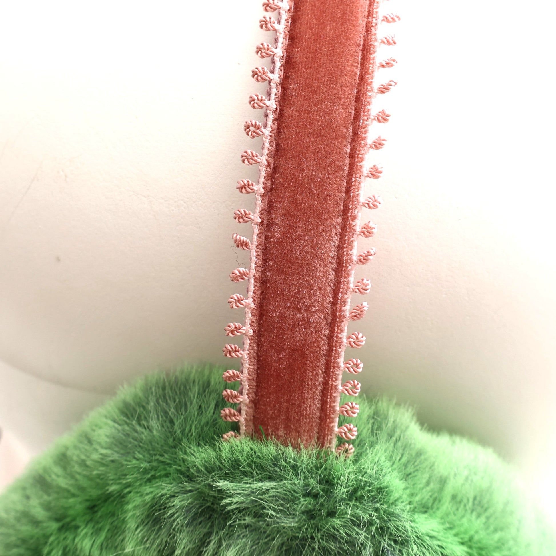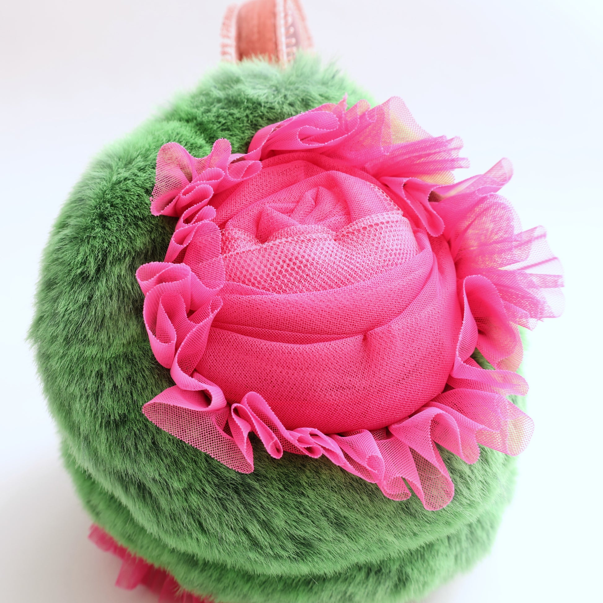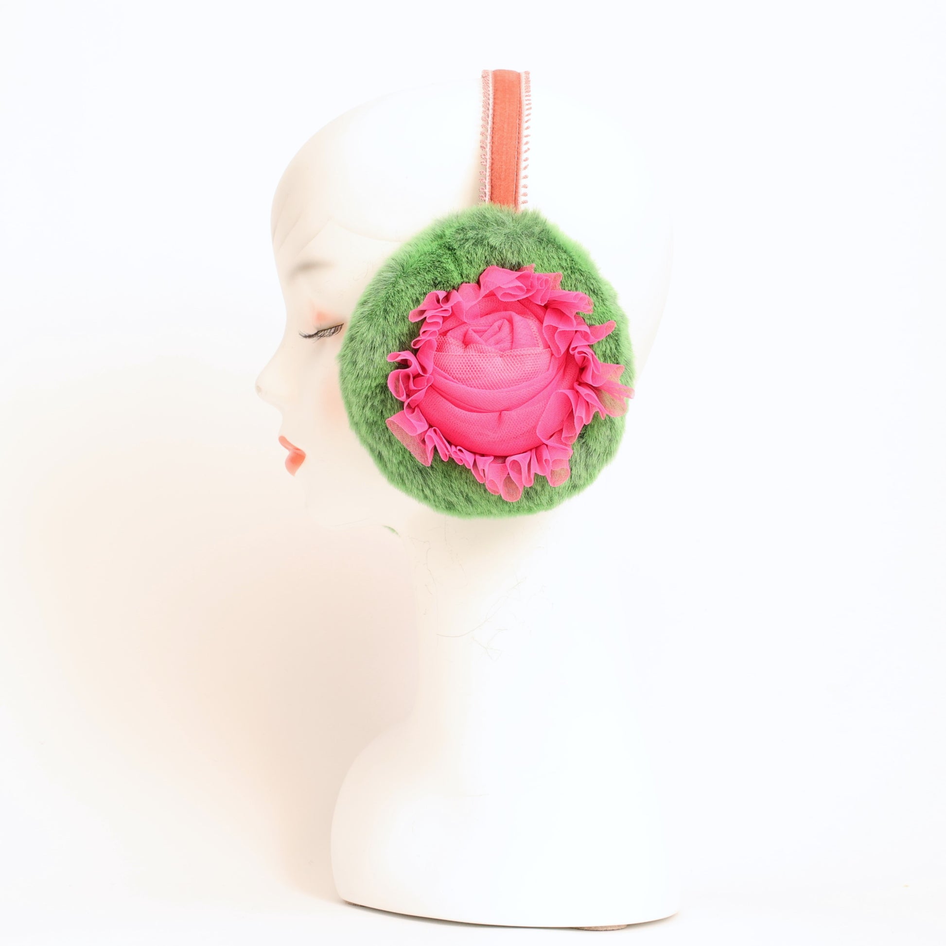 2色のチュールを使用して作った巻きバラとチュールのフリルの組み合わせで、華やかな印象のイヤマフに仕上げました。