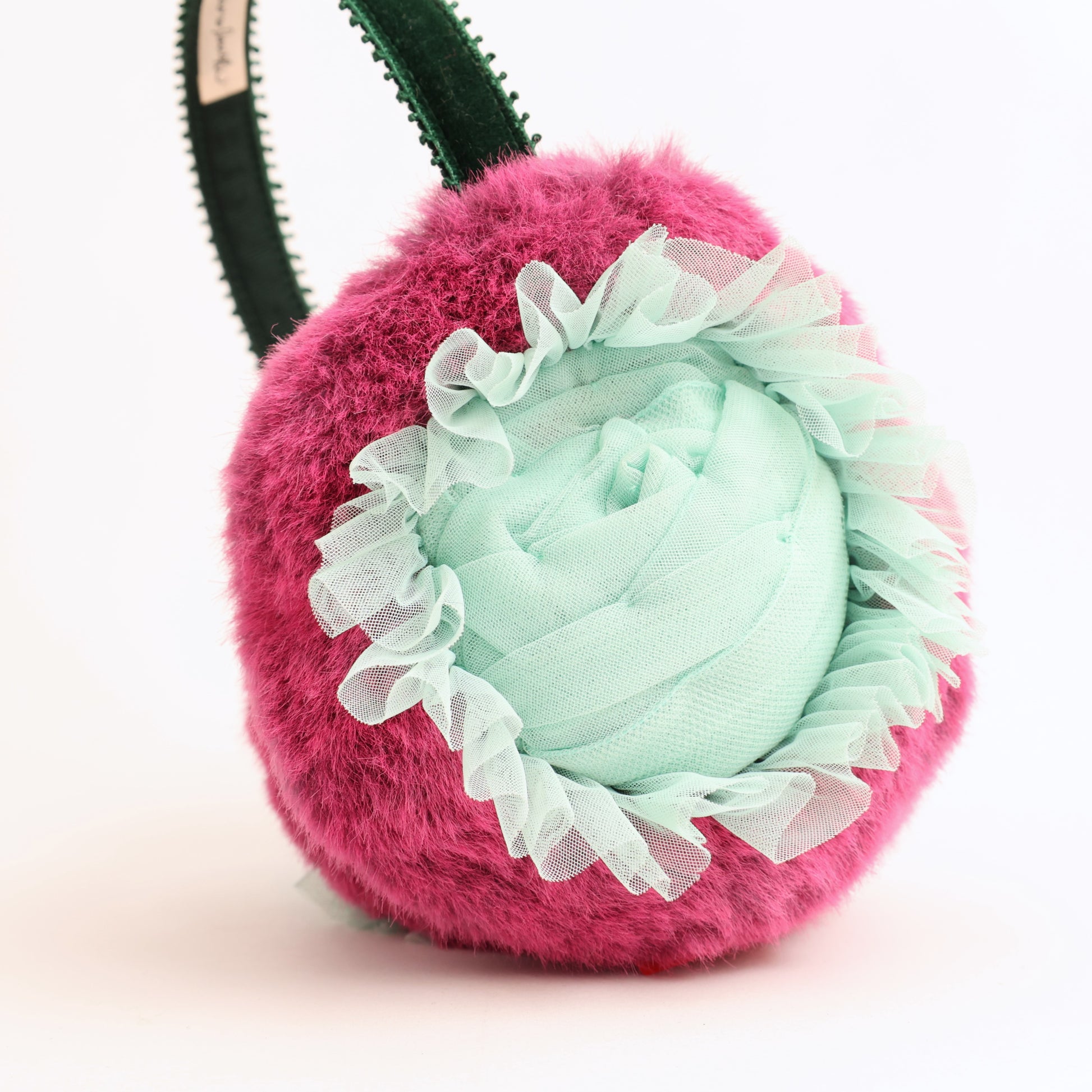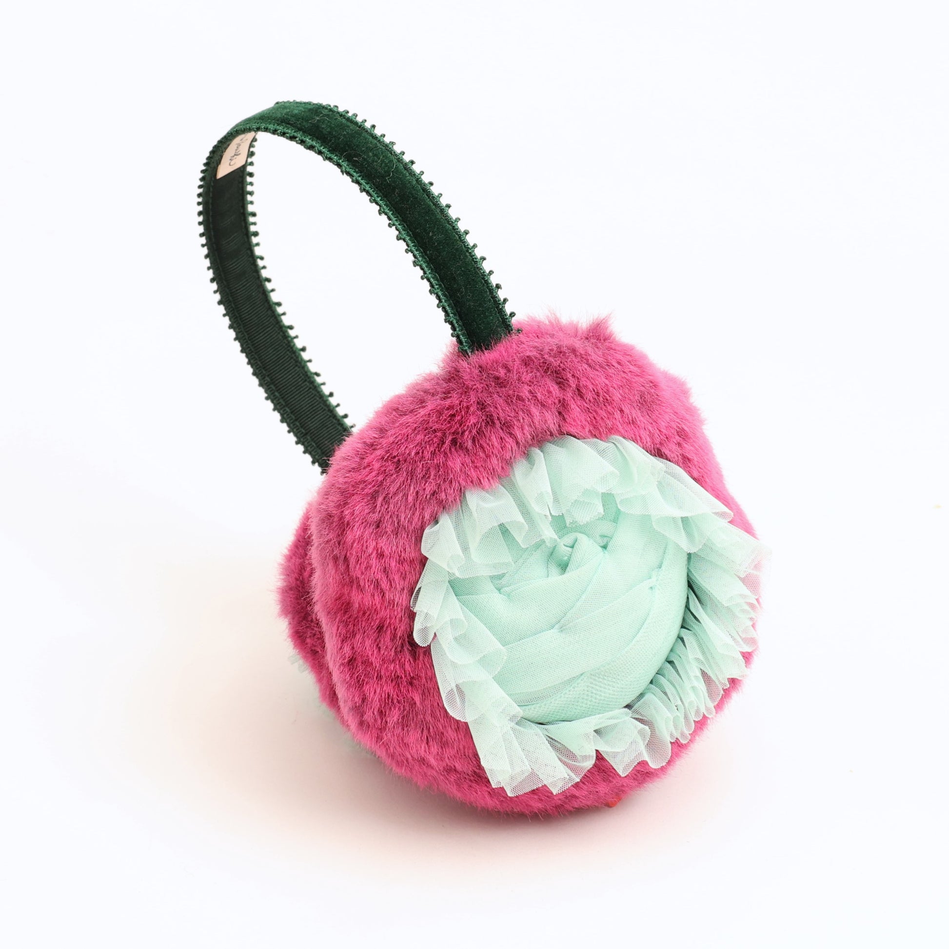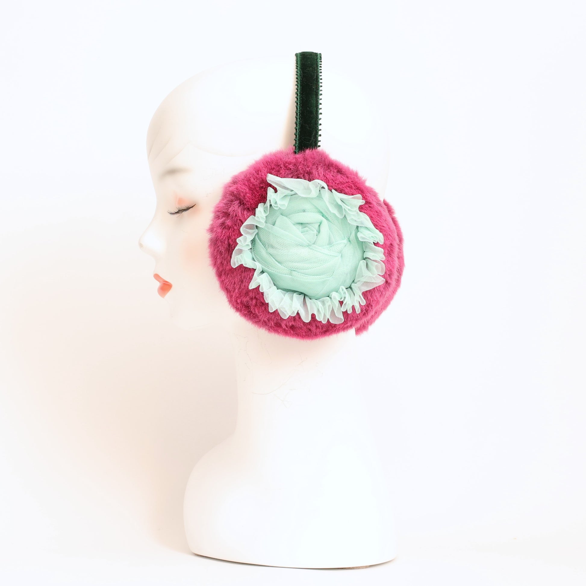 2色のチュールを使用して作った巻きバラとチュールのフリルの組み合わせで、華やかな印象のイヤマフに仕上げました。