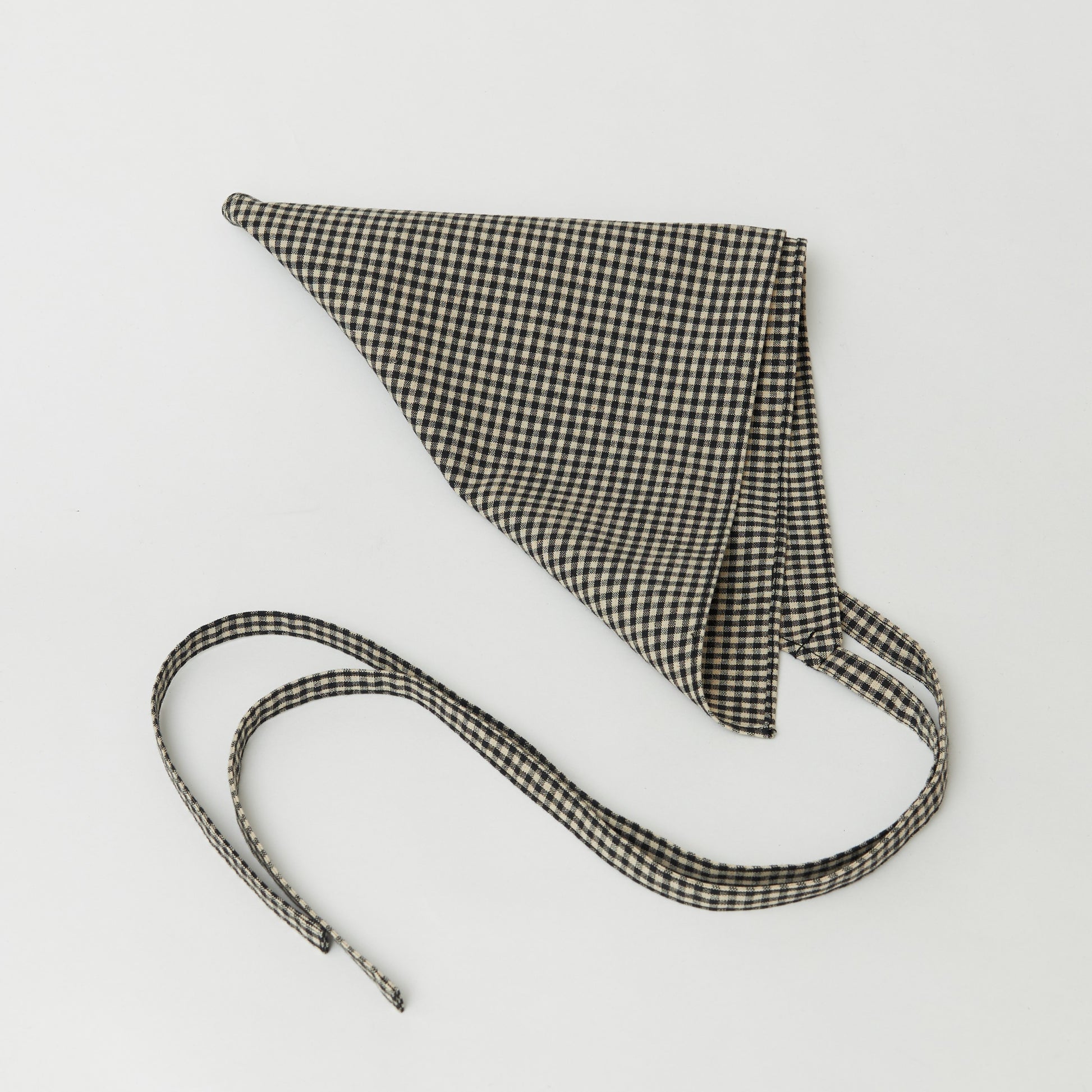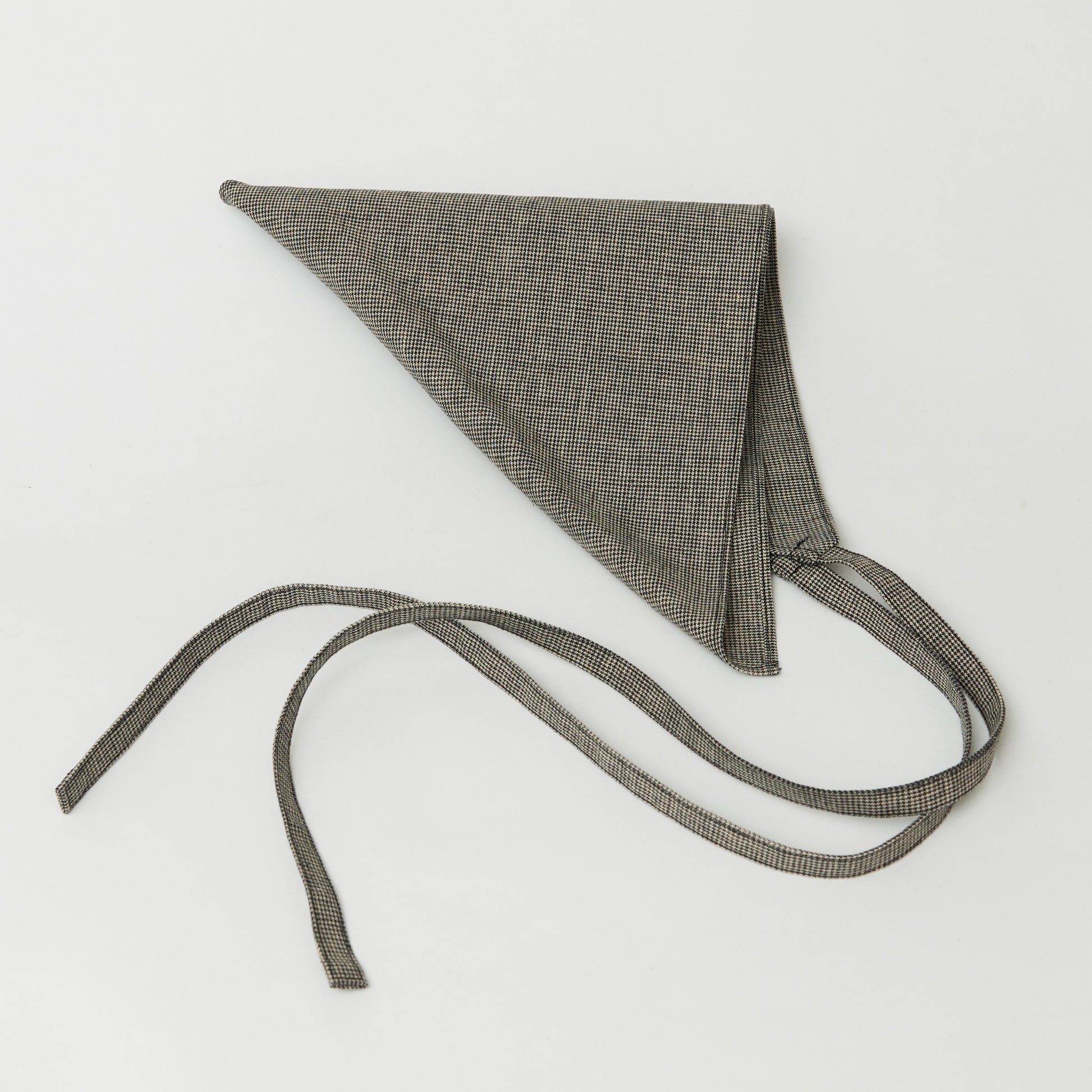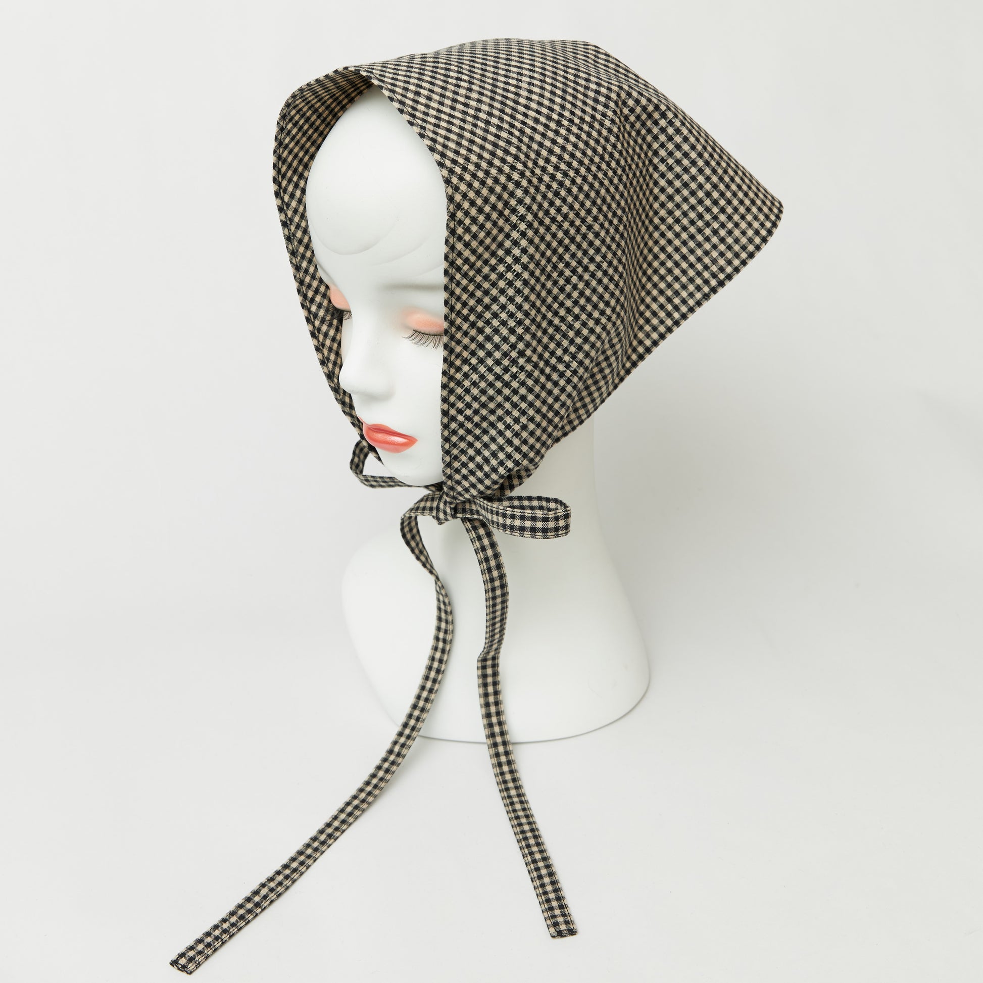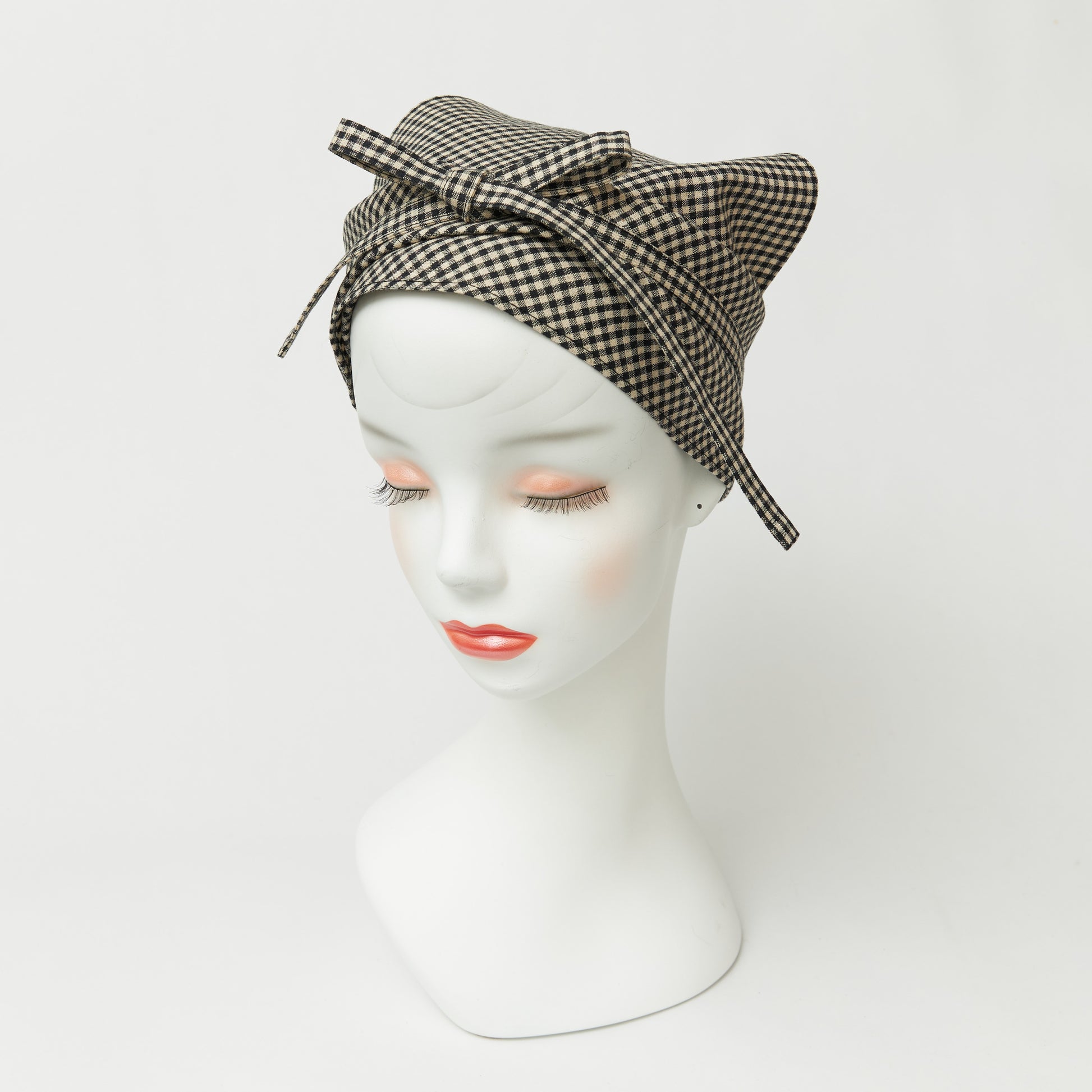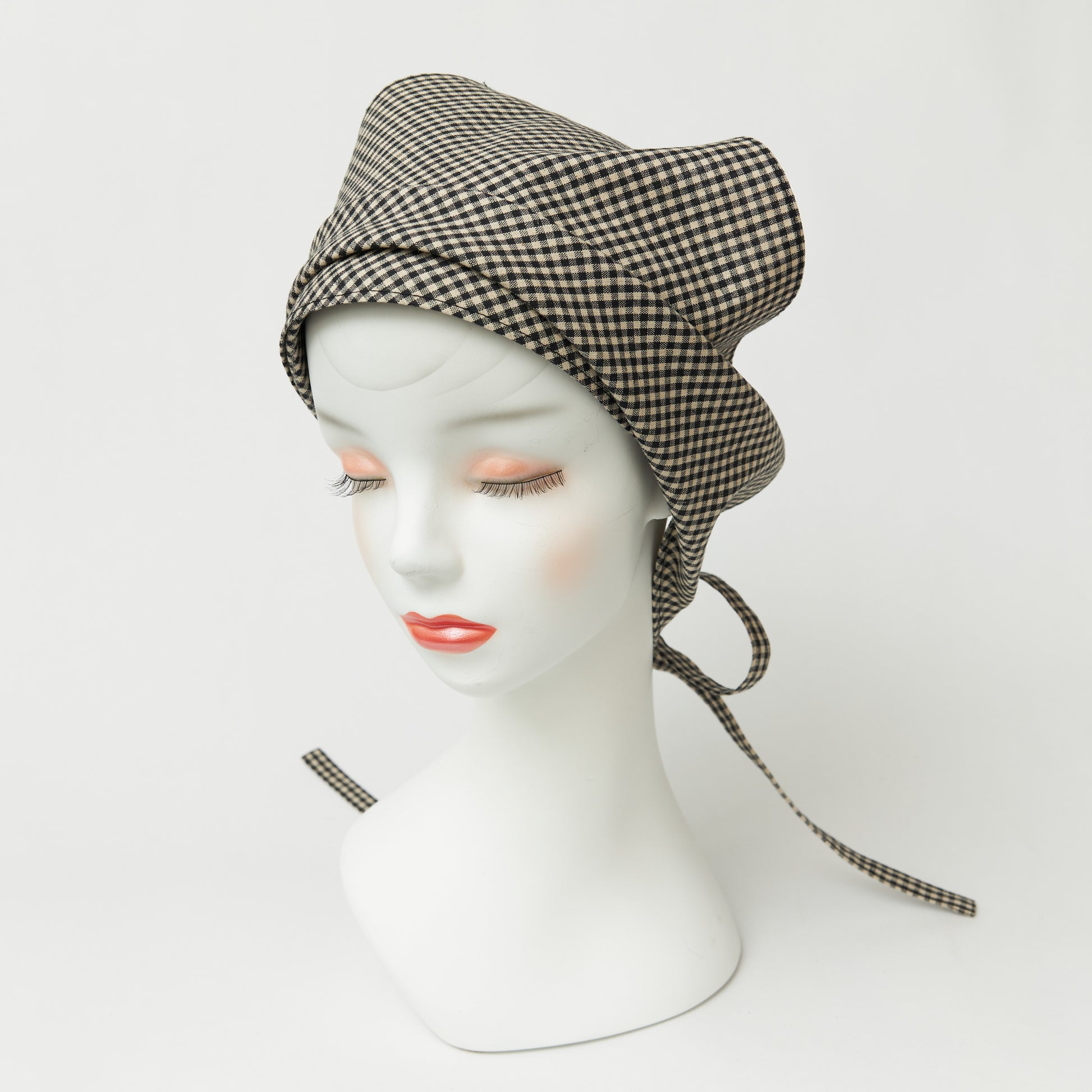 麻のチェック柄パリパリにアイロンをかけて共の長いリボンを上で結びジュニアからシニアまで個性的にかぶれます。