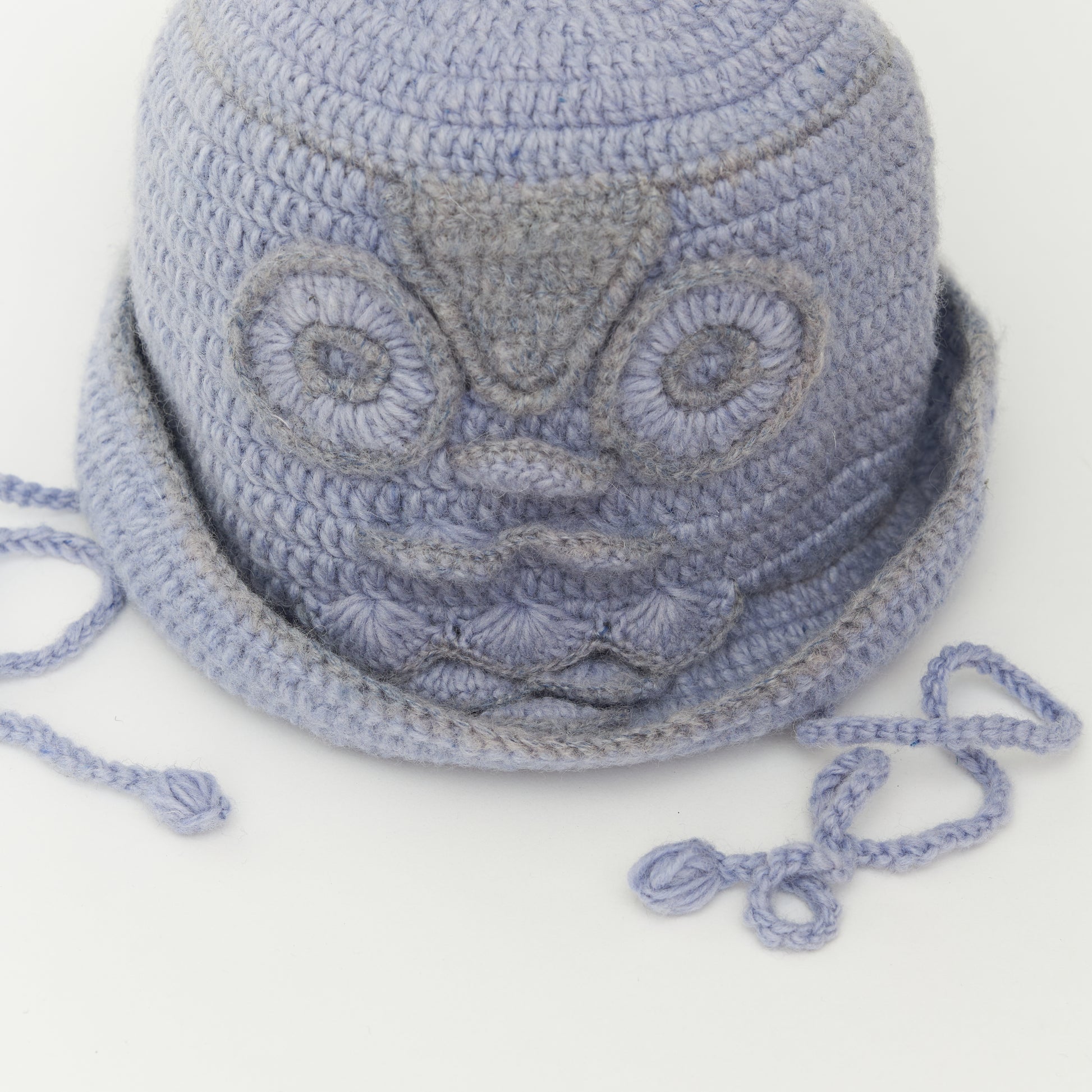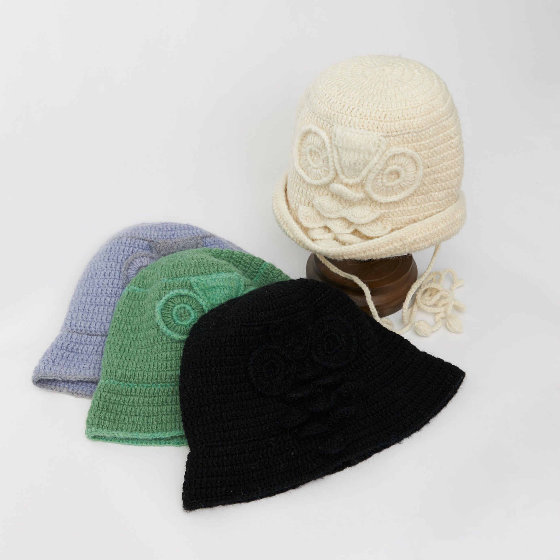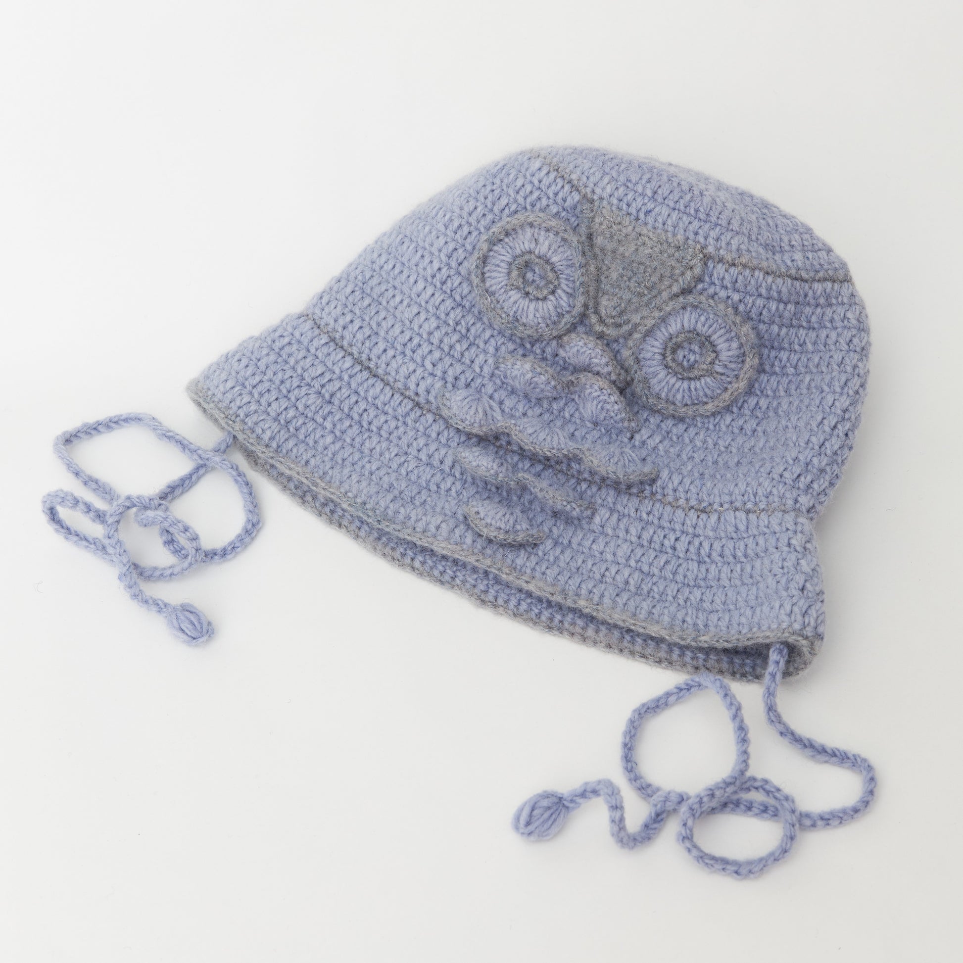 他に、ブリムをクルクル折り上げてかんかん帽の様なシルエットを作っても可愛いですね。 サイズ調整とアクセントになっている紐を内側にしまって、フクロウの顔を横にして被っても素敵です。