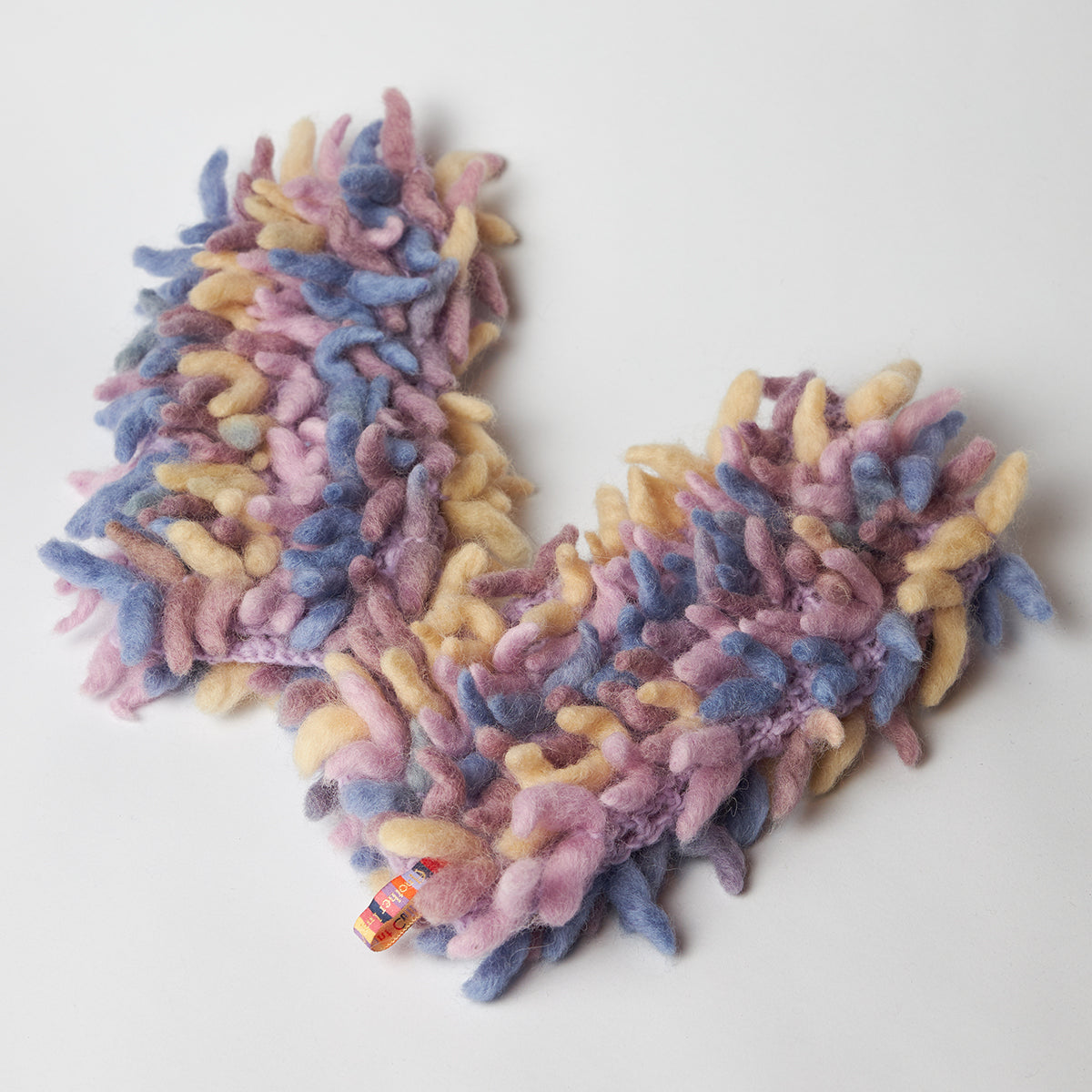 ウール100%の柔らかな糸を優しい色合いのタイダイに染め、かぎ針編みに手で撚ったフリンジをひとつ、ひとつ、絡めて作成しました。空気をたくさん纏うのでとても暖かです。