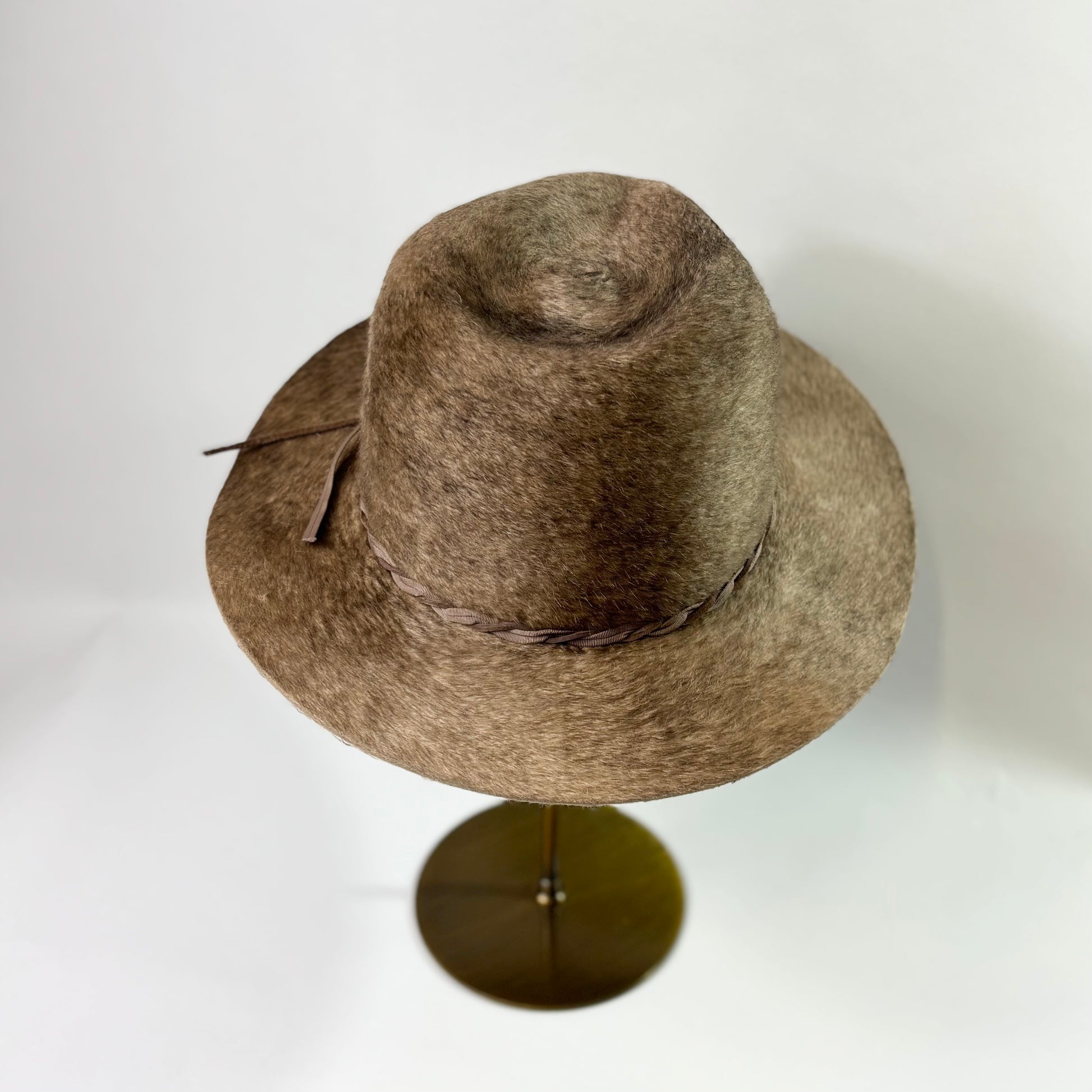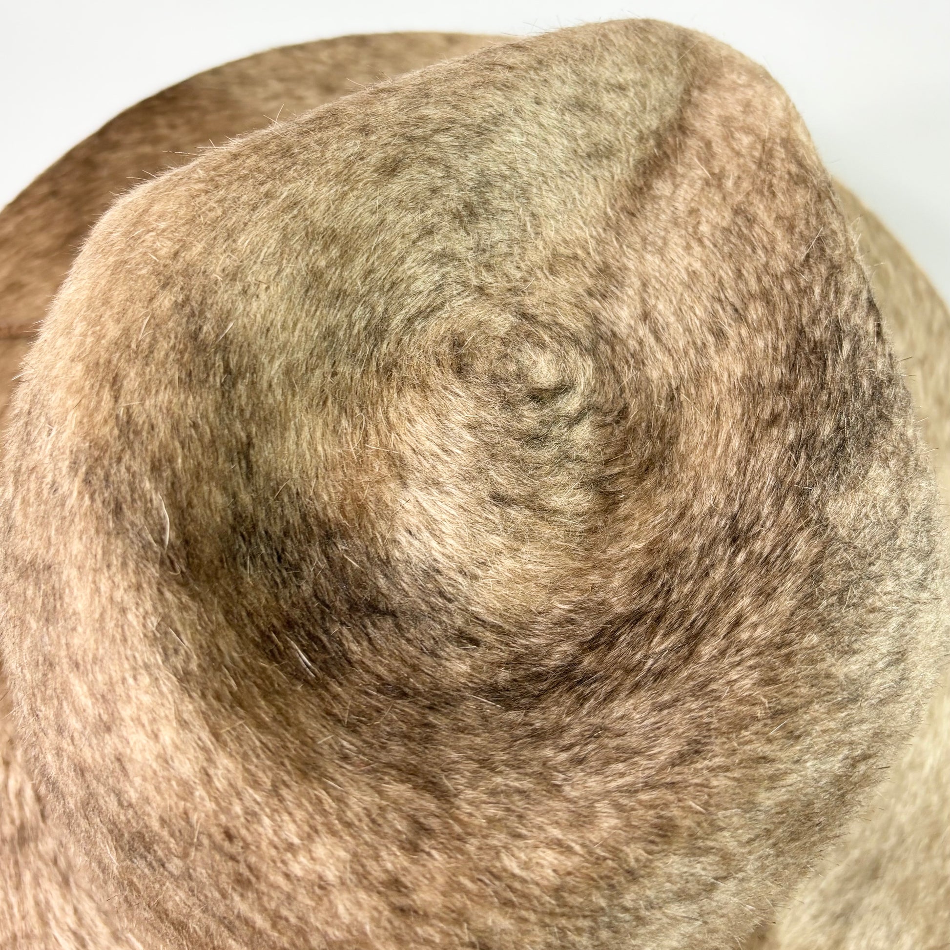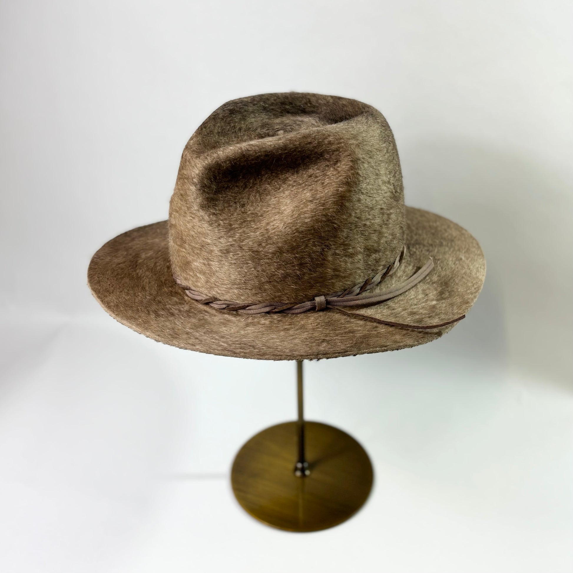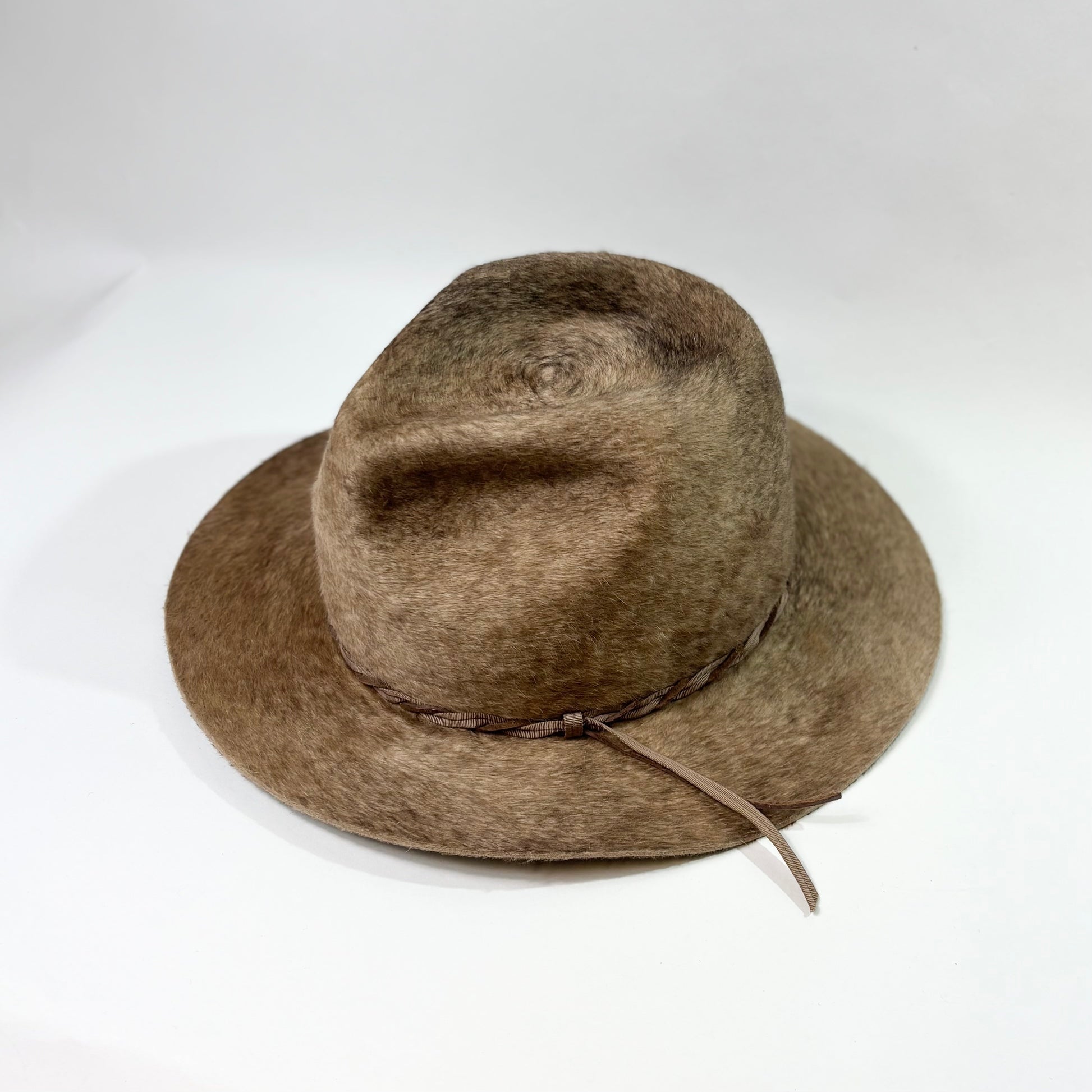 ラビットファー エレクトラを使用したハット。 (エレクトラと呼ばれるラビットファーは地の色とは別の色を毛先に吹き付けた物です。) 被り口の円が楕円形の木型を使用している為、サイドが狭く前後に長い被り口になっています。 リボン部分はアメリカ製の2ply(プライ)というリボンと アメリカ製の牛革スエードリボンを編み込んで使用しています。