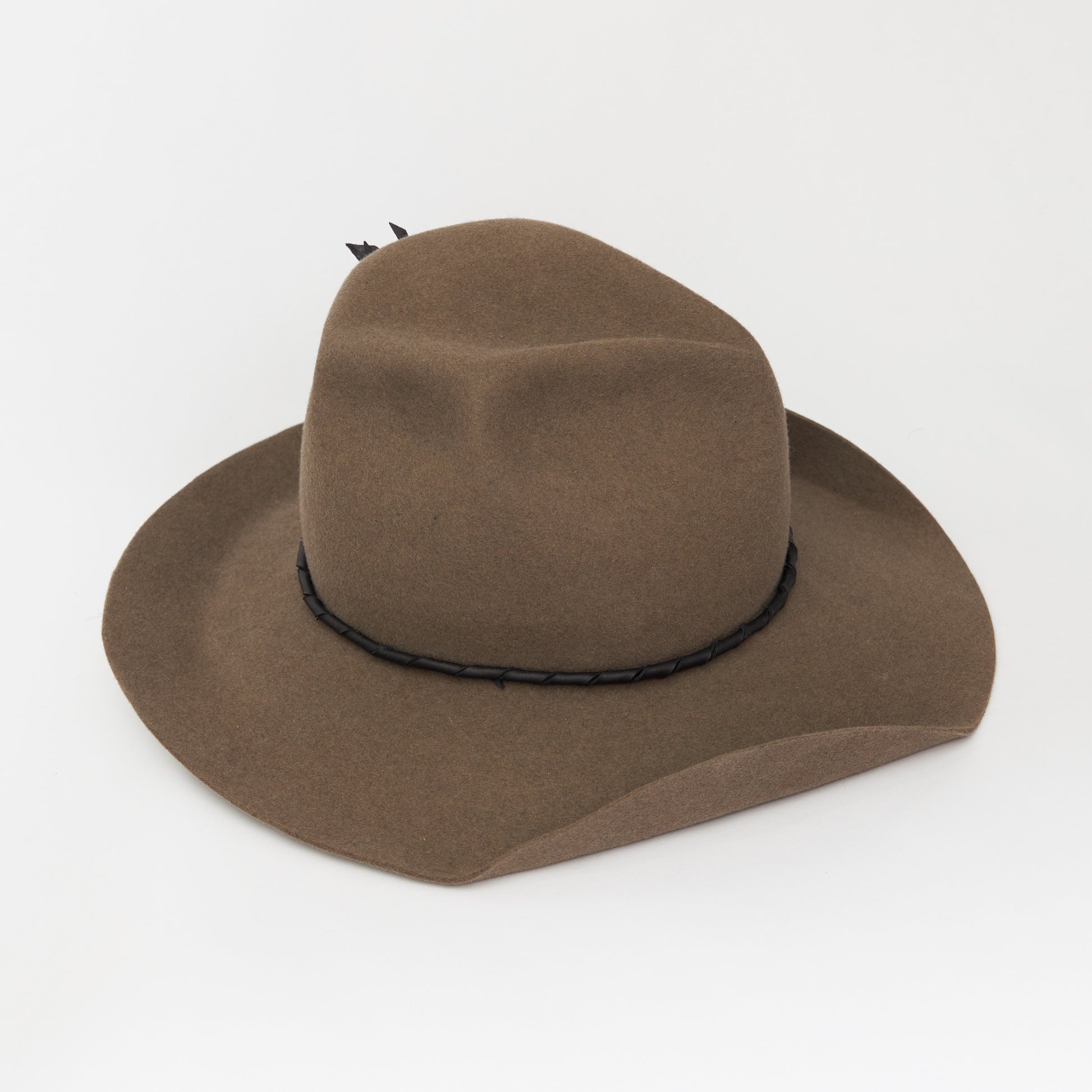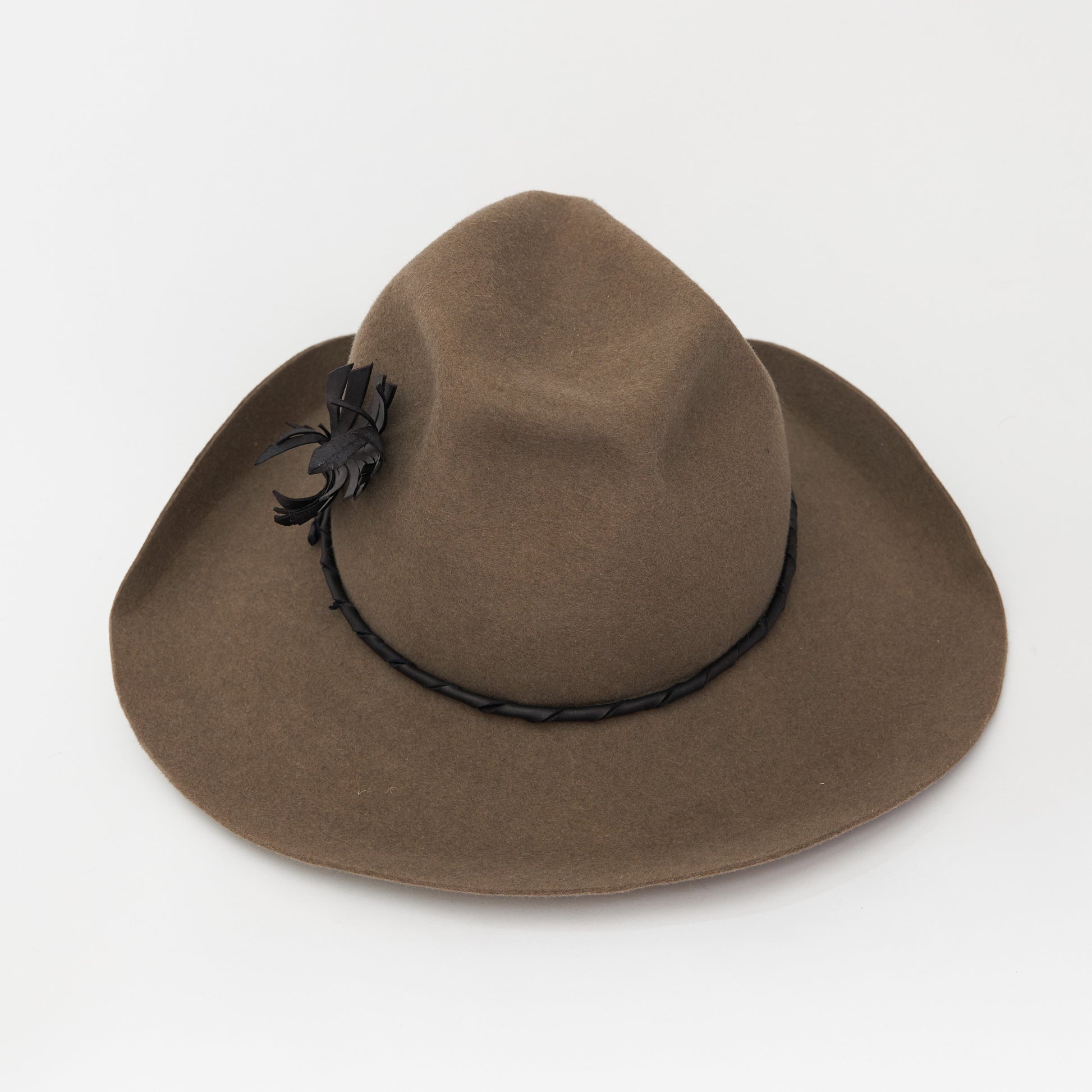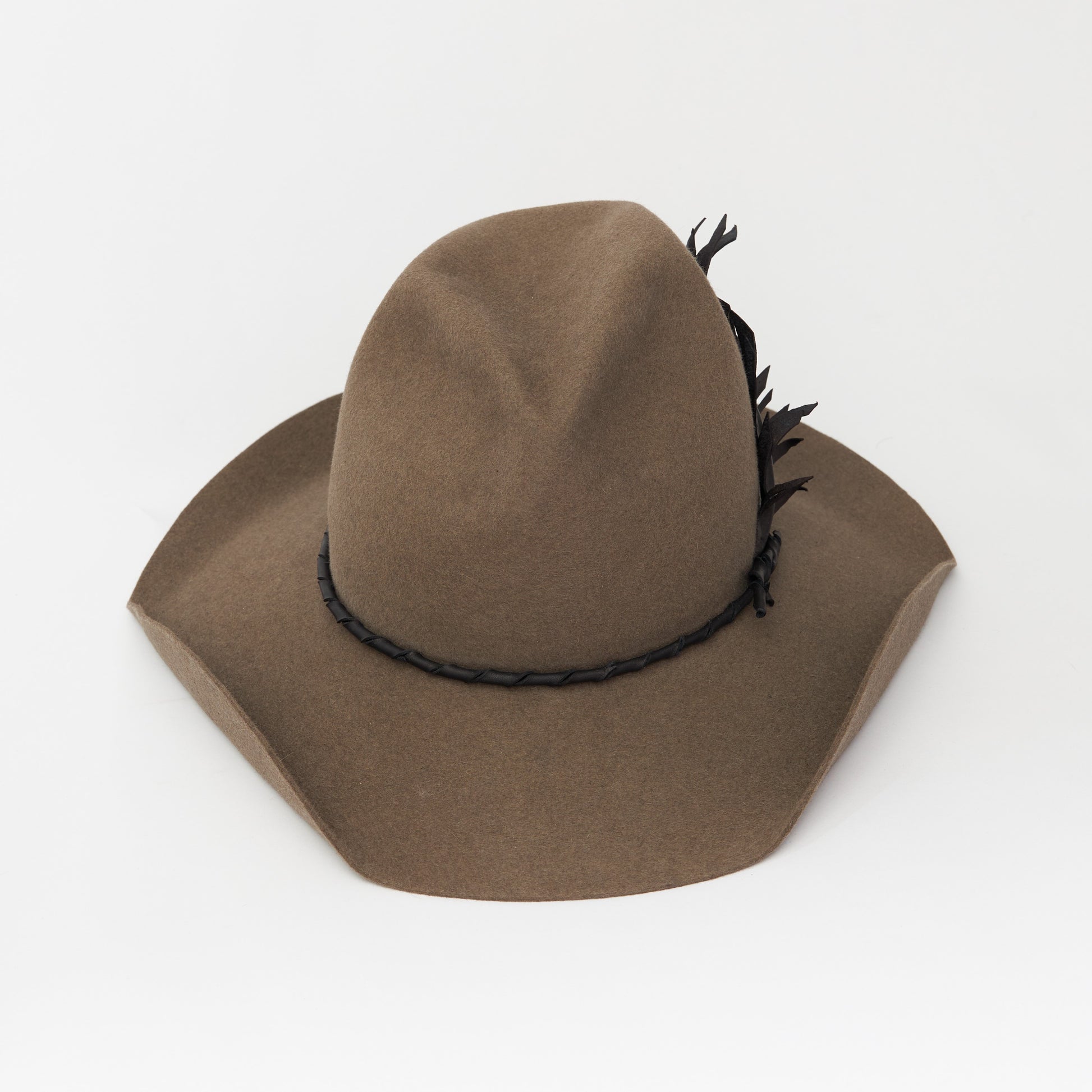 クラウンはアシンメトリー木型を使用し五角形にへこませています。 ブリムは10cm広幅ブリムのサイドを折り立てて飛べそうな形にしました。