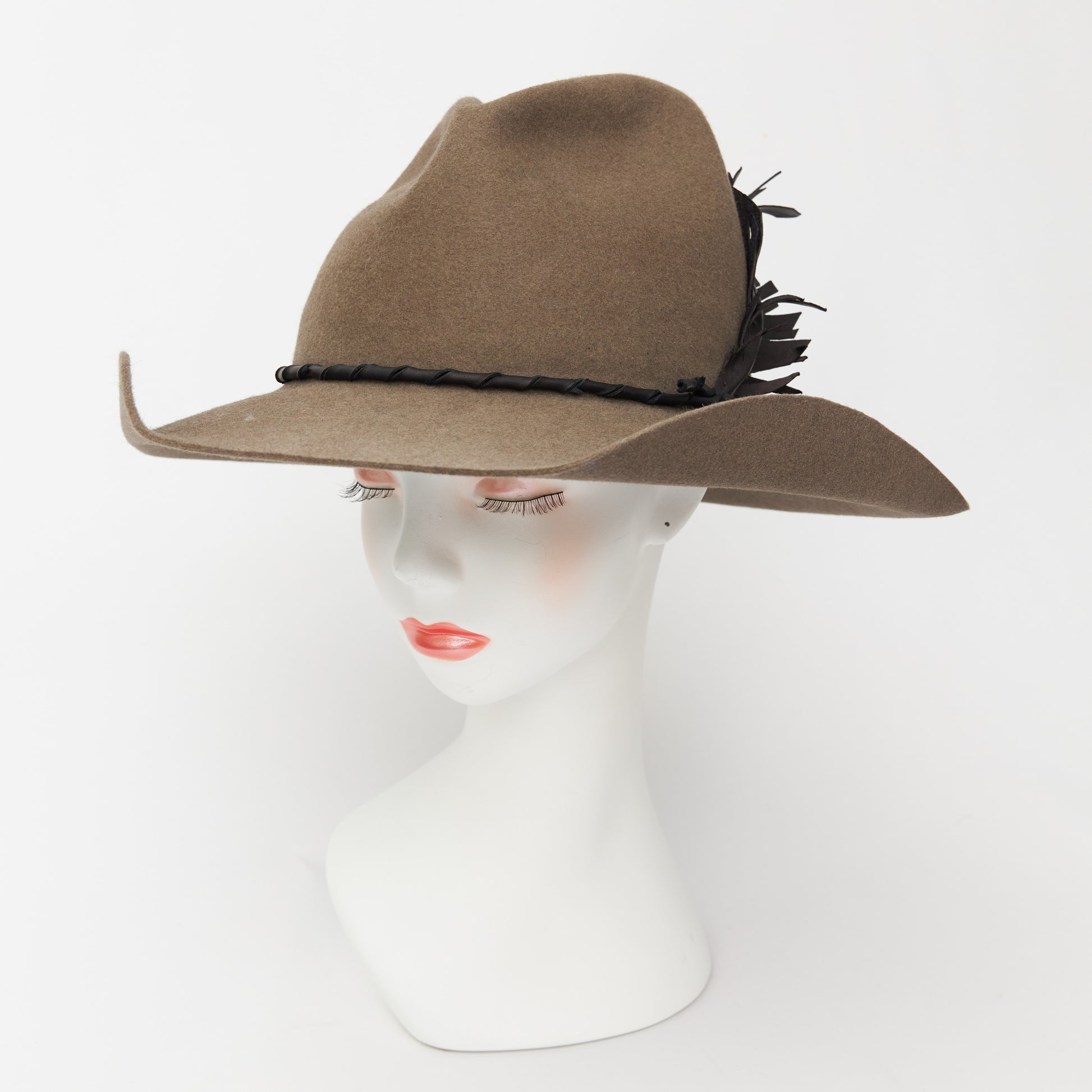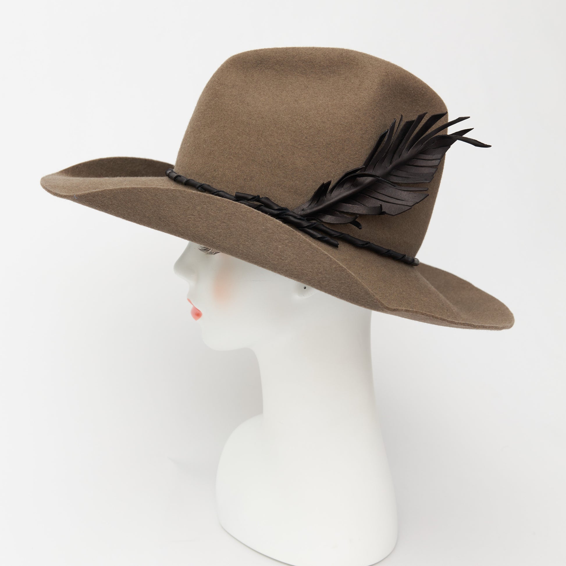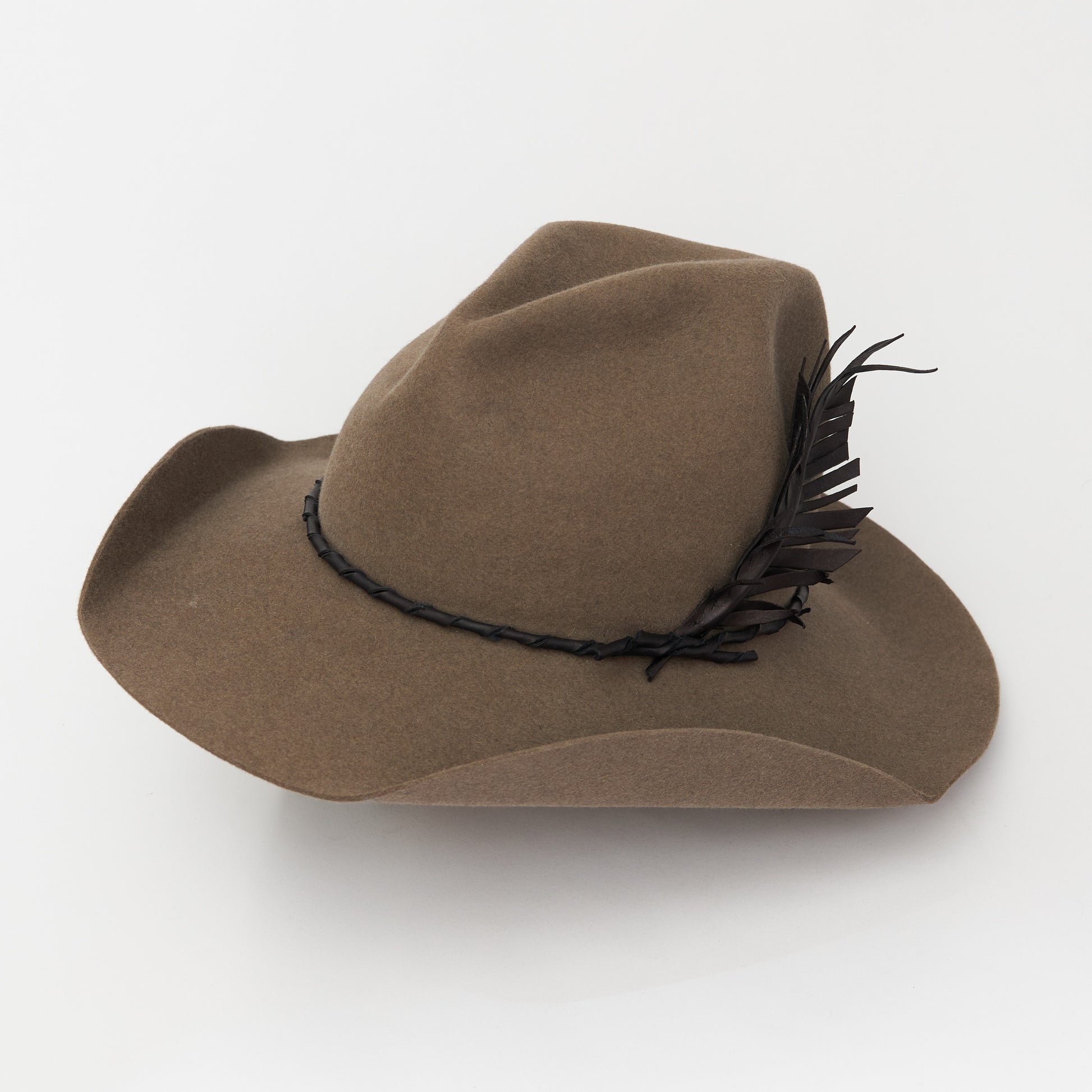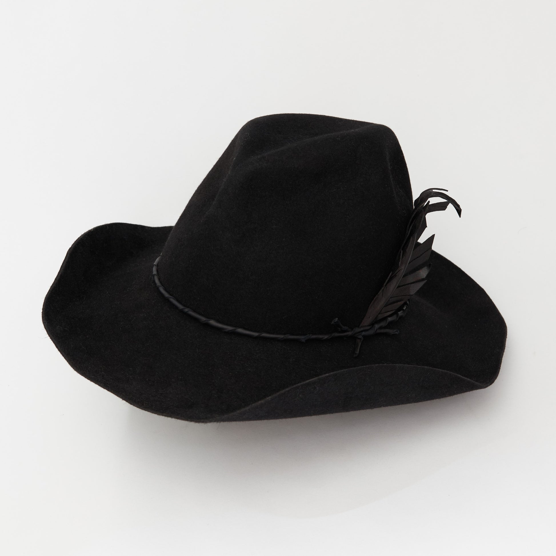 クラウンはアシンメトリー木型を使用し五角形にへこませています。 ブリムは10cm広幅ブリムのサイドを折り立てて飛べそうな形にしました。