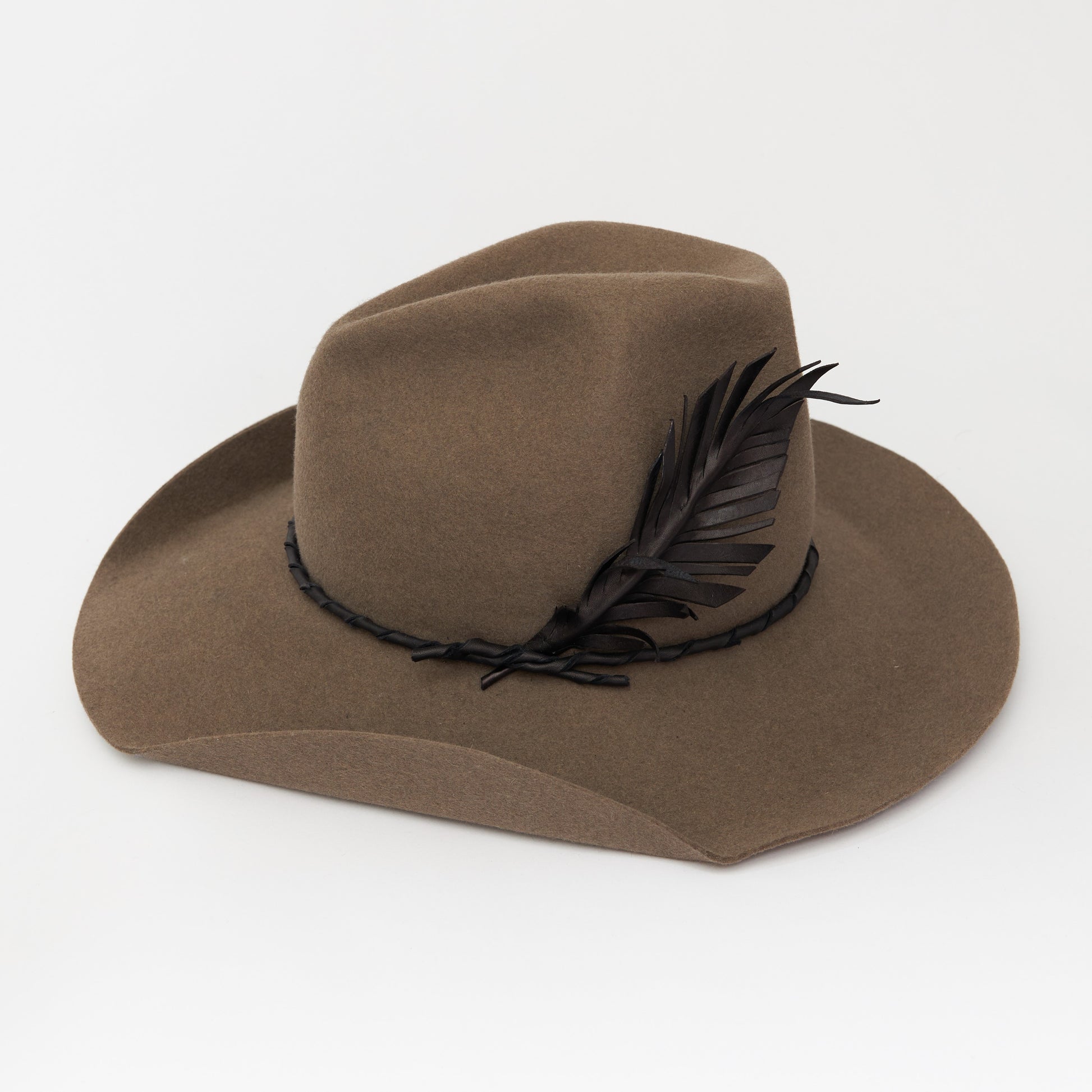 装飾はヌメ革をカットして作った羽根と 回転させて作った紐を巻いてあります。 革紐は部分的に切り込みを入れて"ささくれ"を作ってあります。この装飾は棘のある蔦に絡まった羽根をイメージしています。