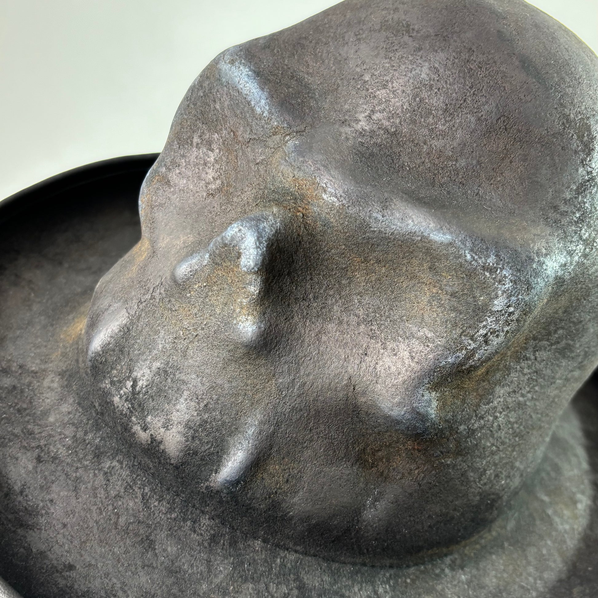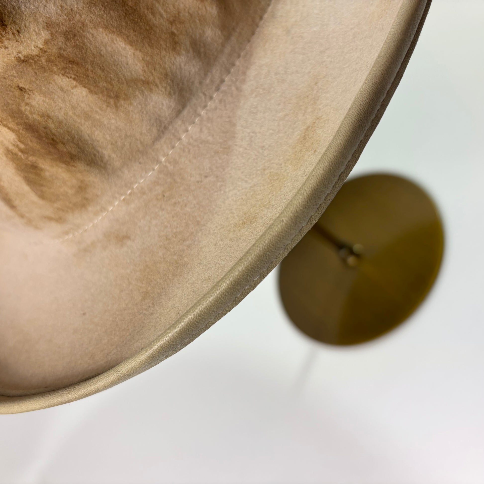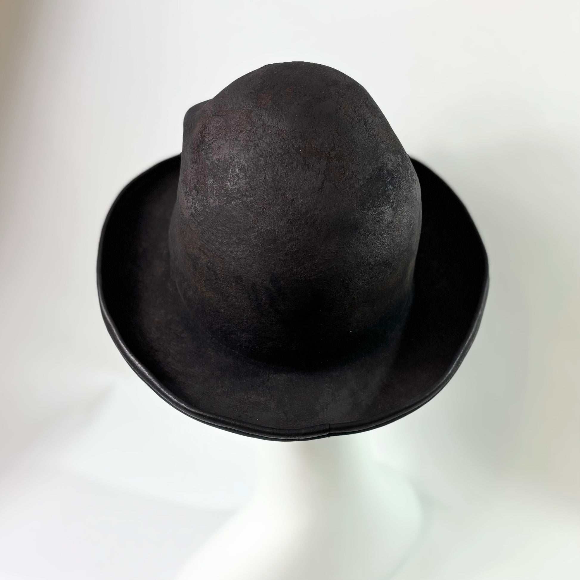 フェルトのスカルハットに特殊加工を施しました。 ビンテージ加工、バーン加工などを繰り返し独特な風合いを出しています。 つば先はレザーパイピングした後にオーバーウェルトという道具を使い、つば先を折りボーラーハットっぽく被れる様に仕上げました。