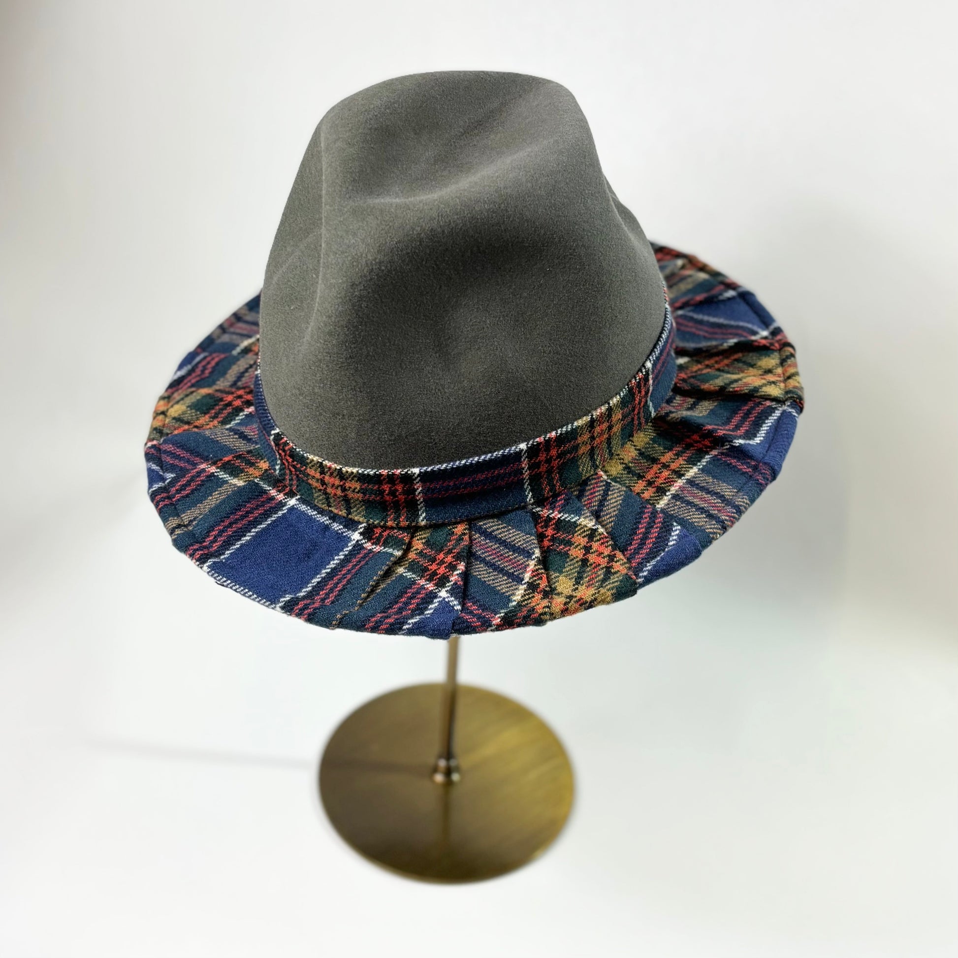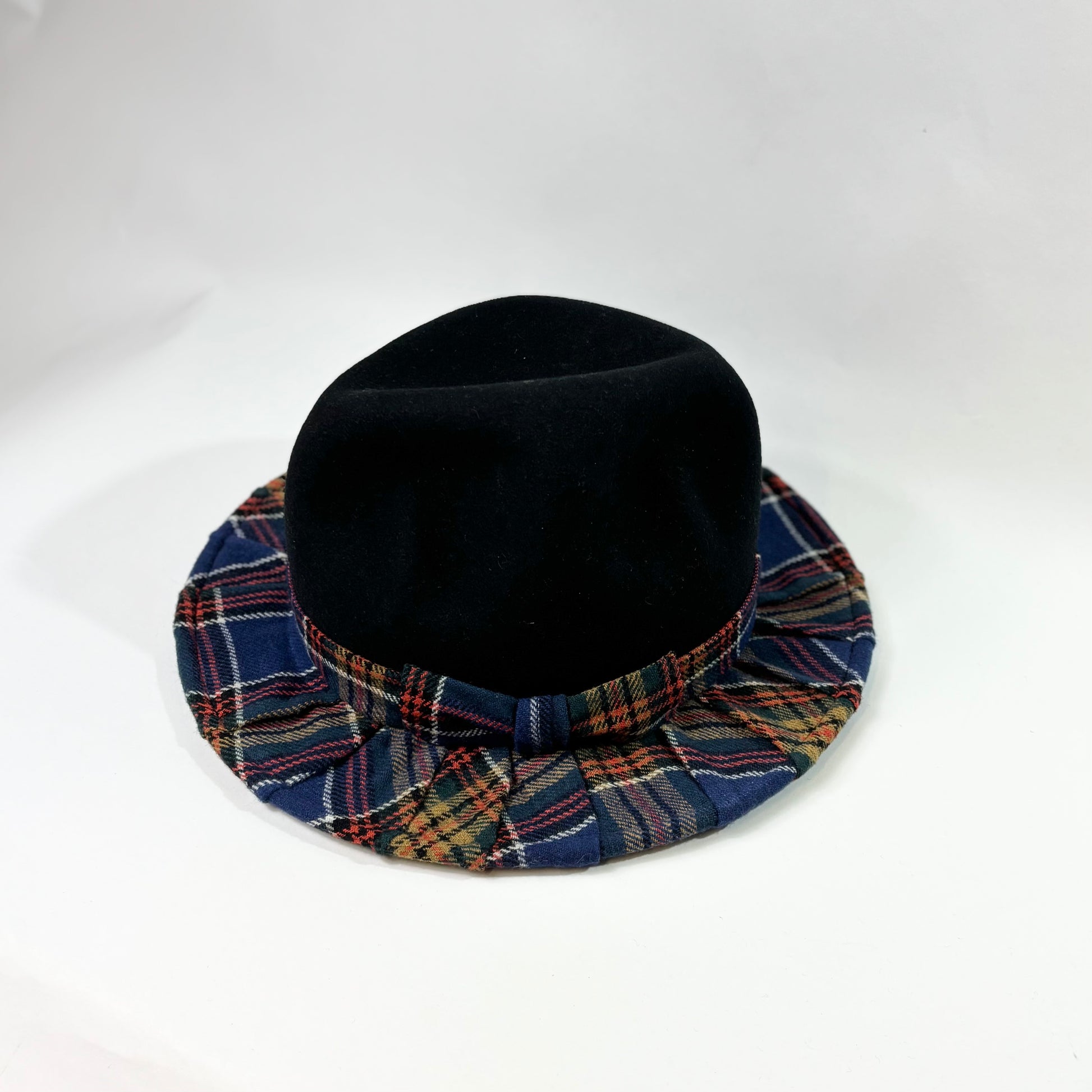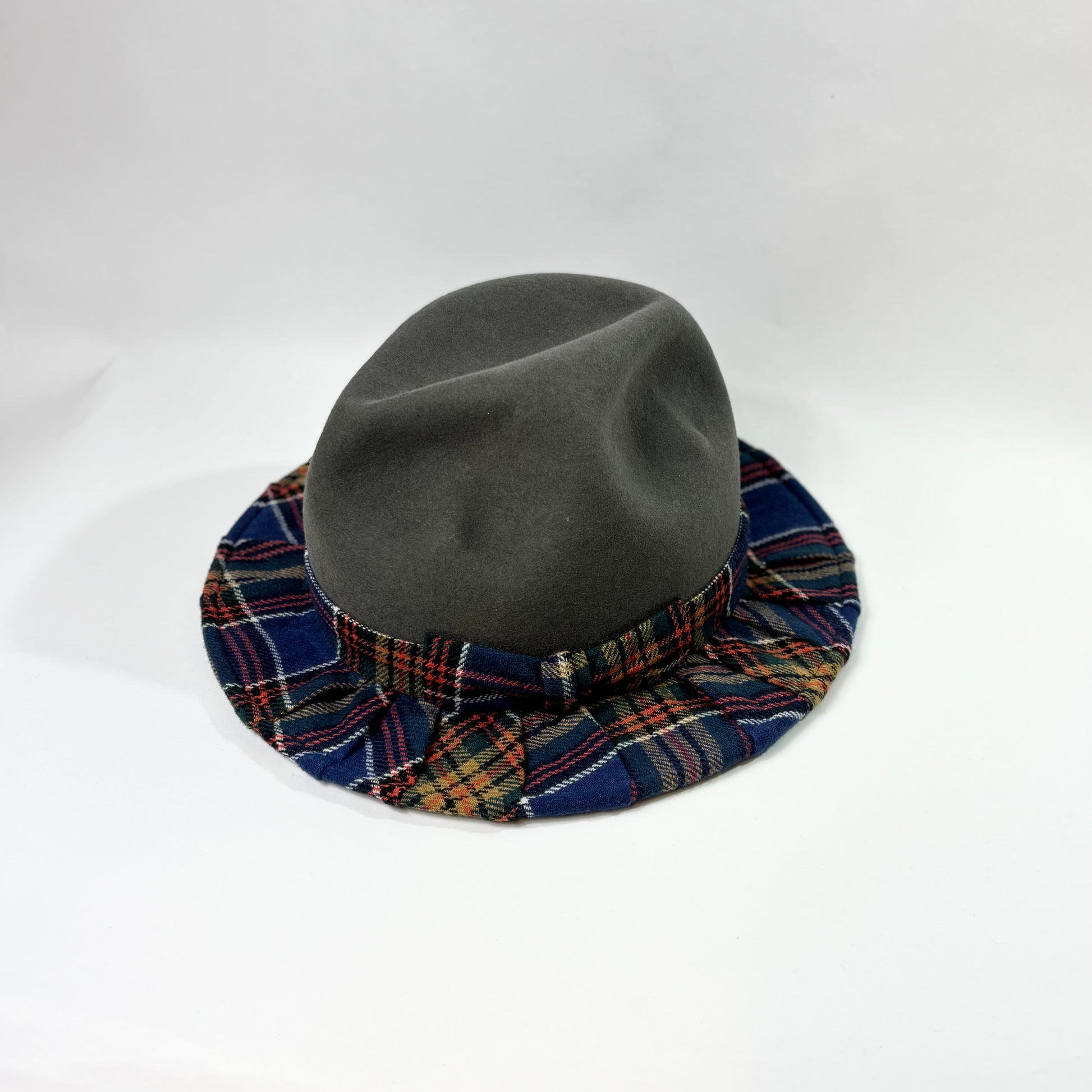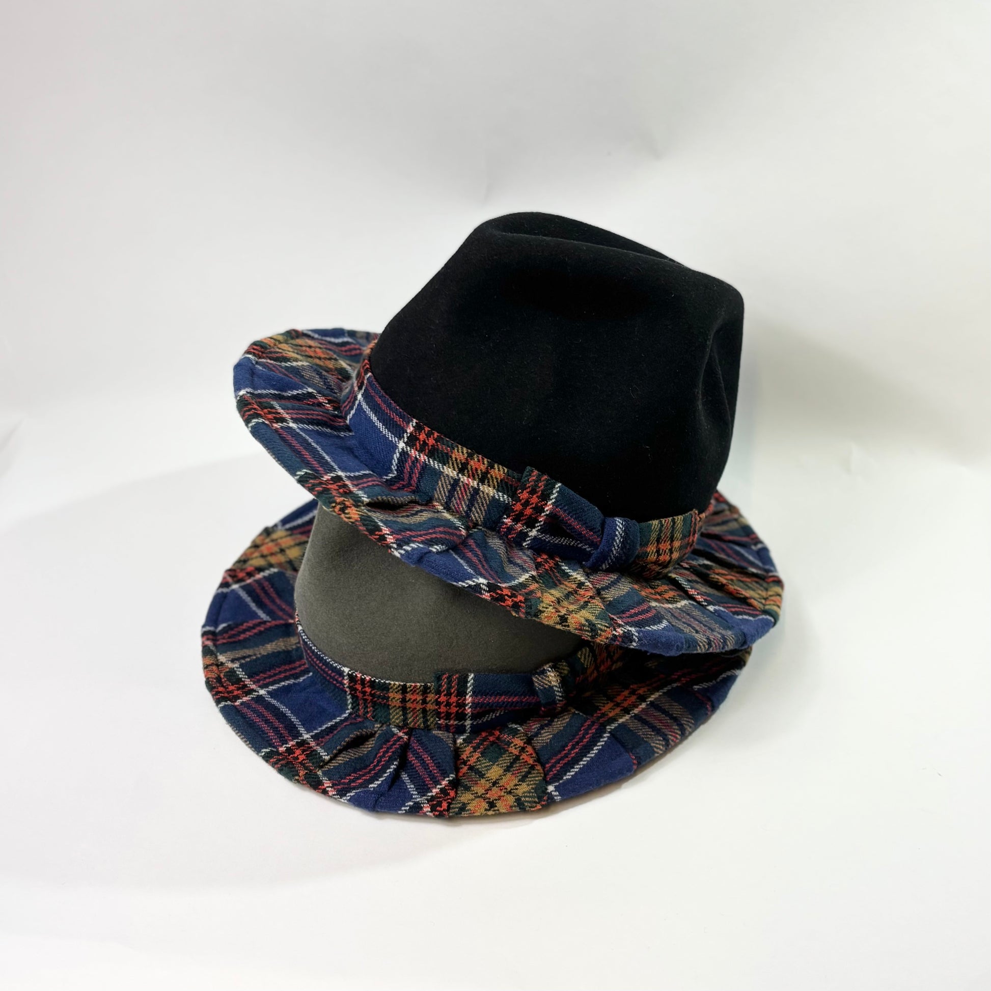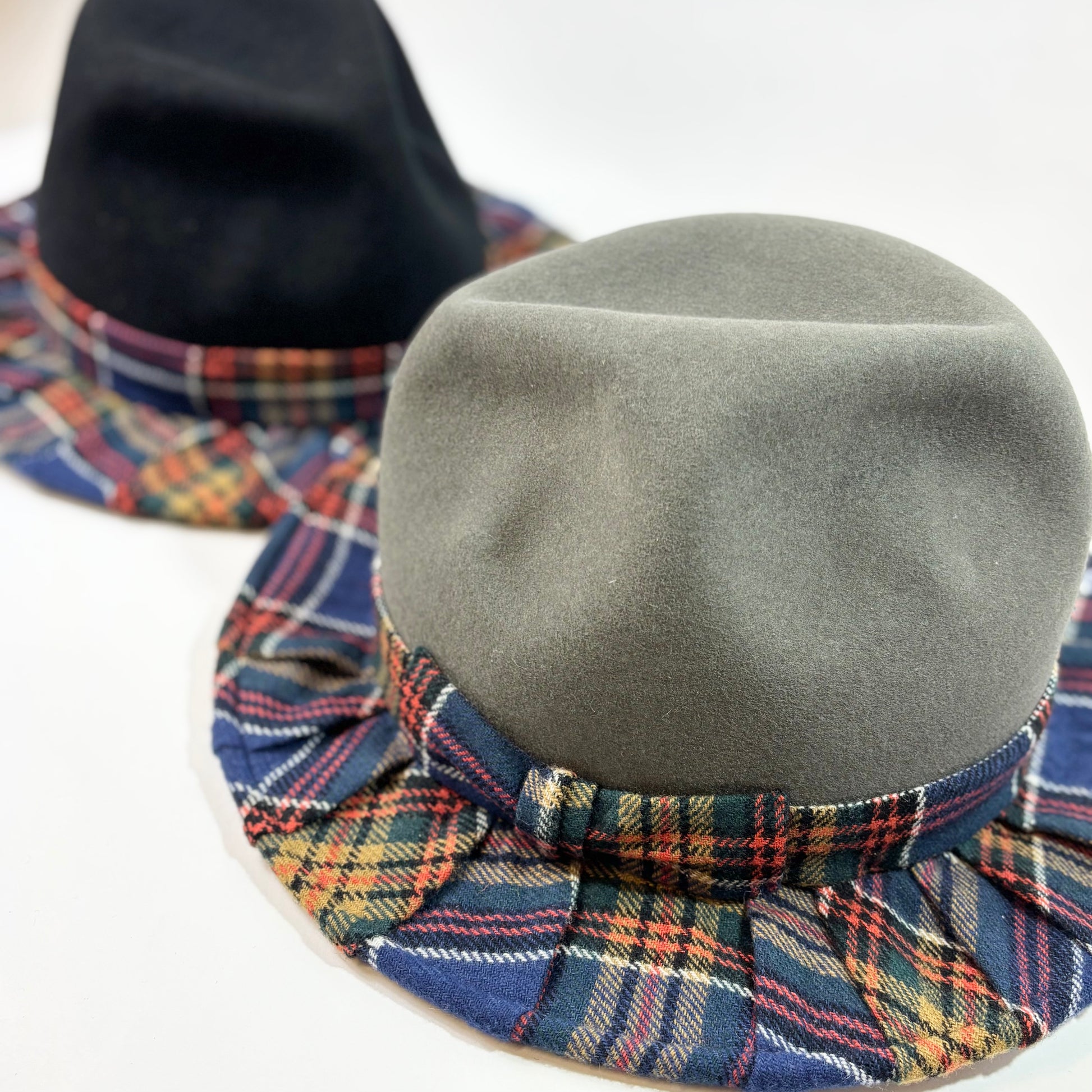 マウンテンハットにタータンチェックを履かせたパンキッシュなハット。 スコットランドの伝統的な男性用衣装「キルト」 (格子縞(タータン)柄のスカート状のもの)からインスピレーションを得てデザインしました。 ブリム上のタータンチェック生地は手作業でプリーツを作りフェルト部分と一緒に型入れをしてから縫い付けてあります。リボン部分にもタータンチェック生地を使用。