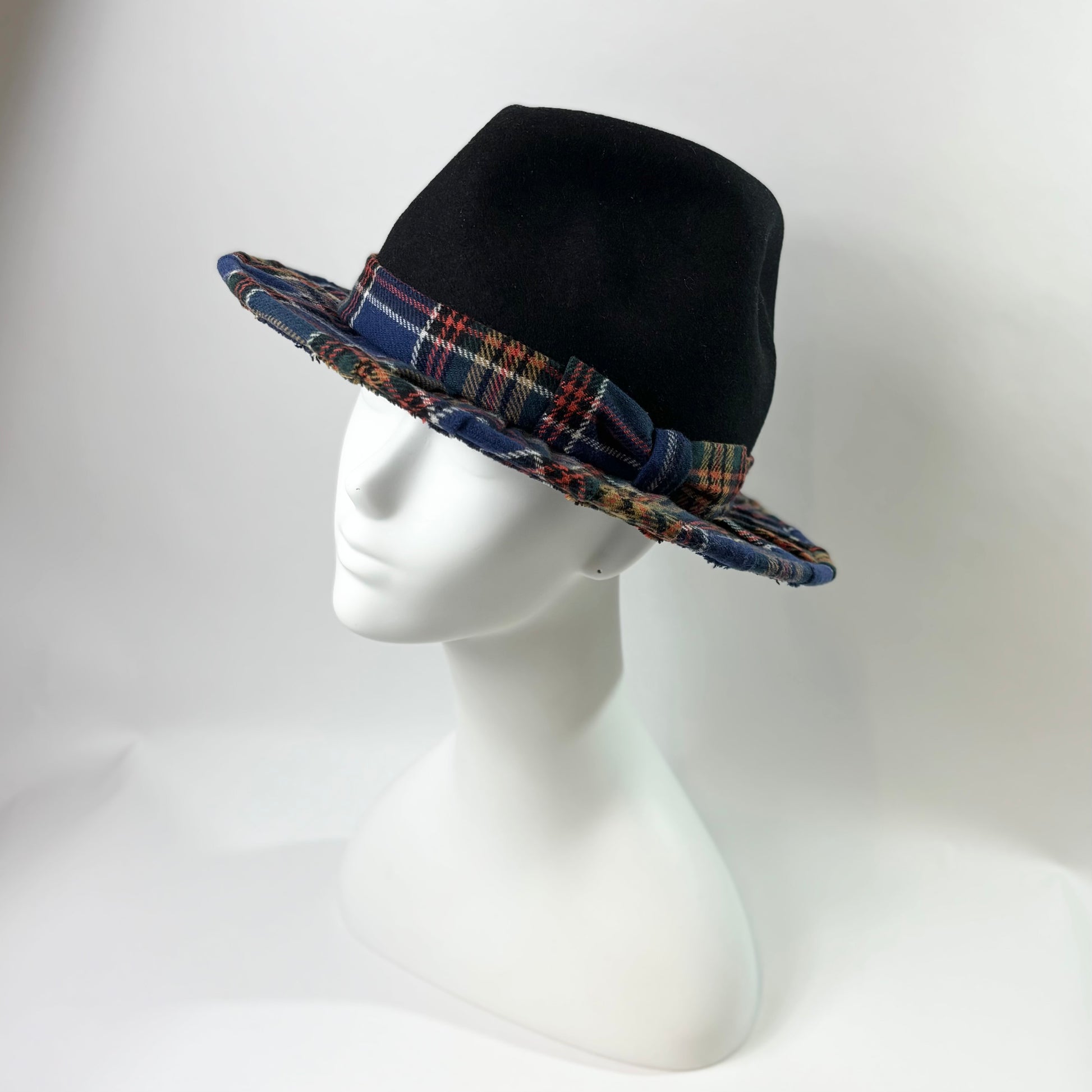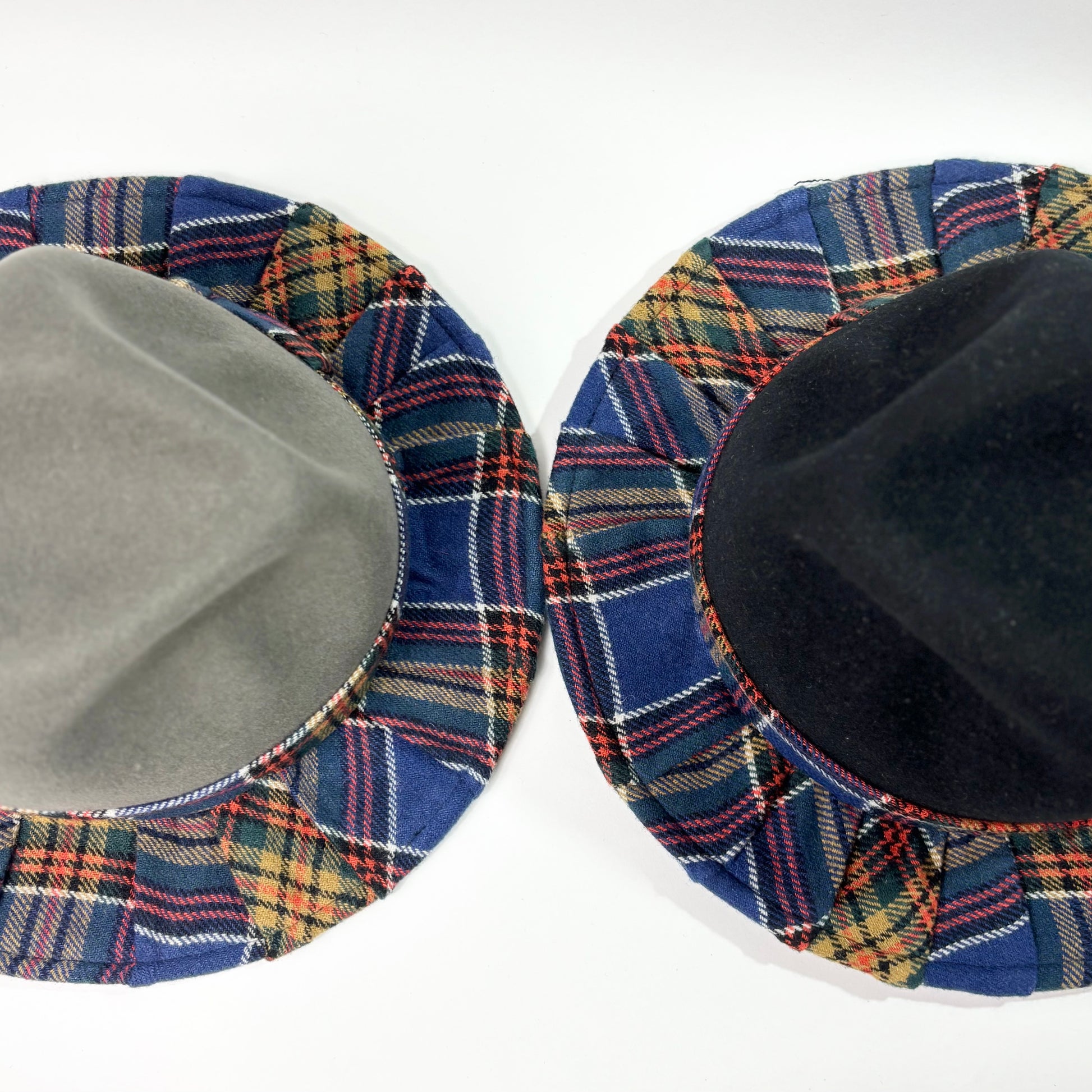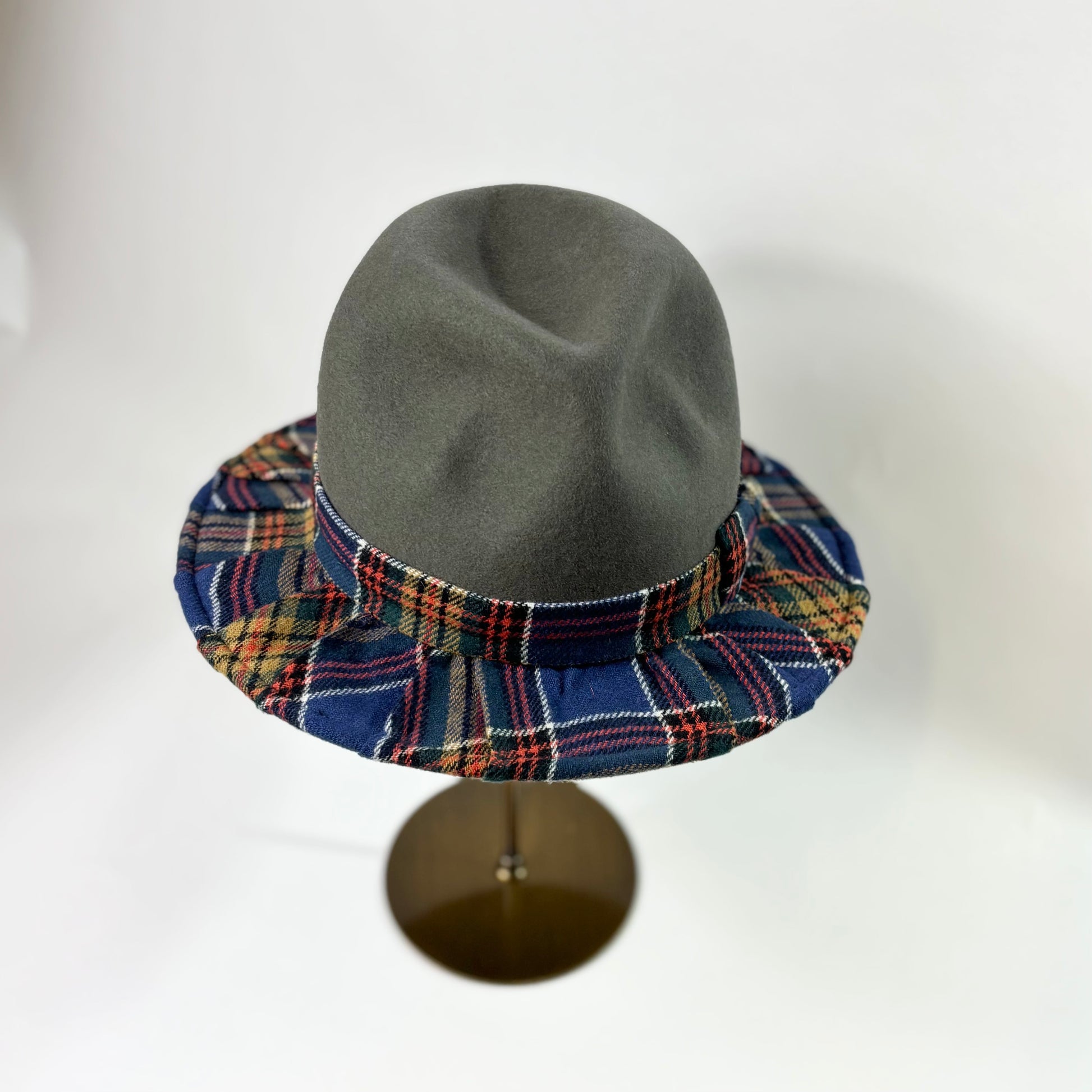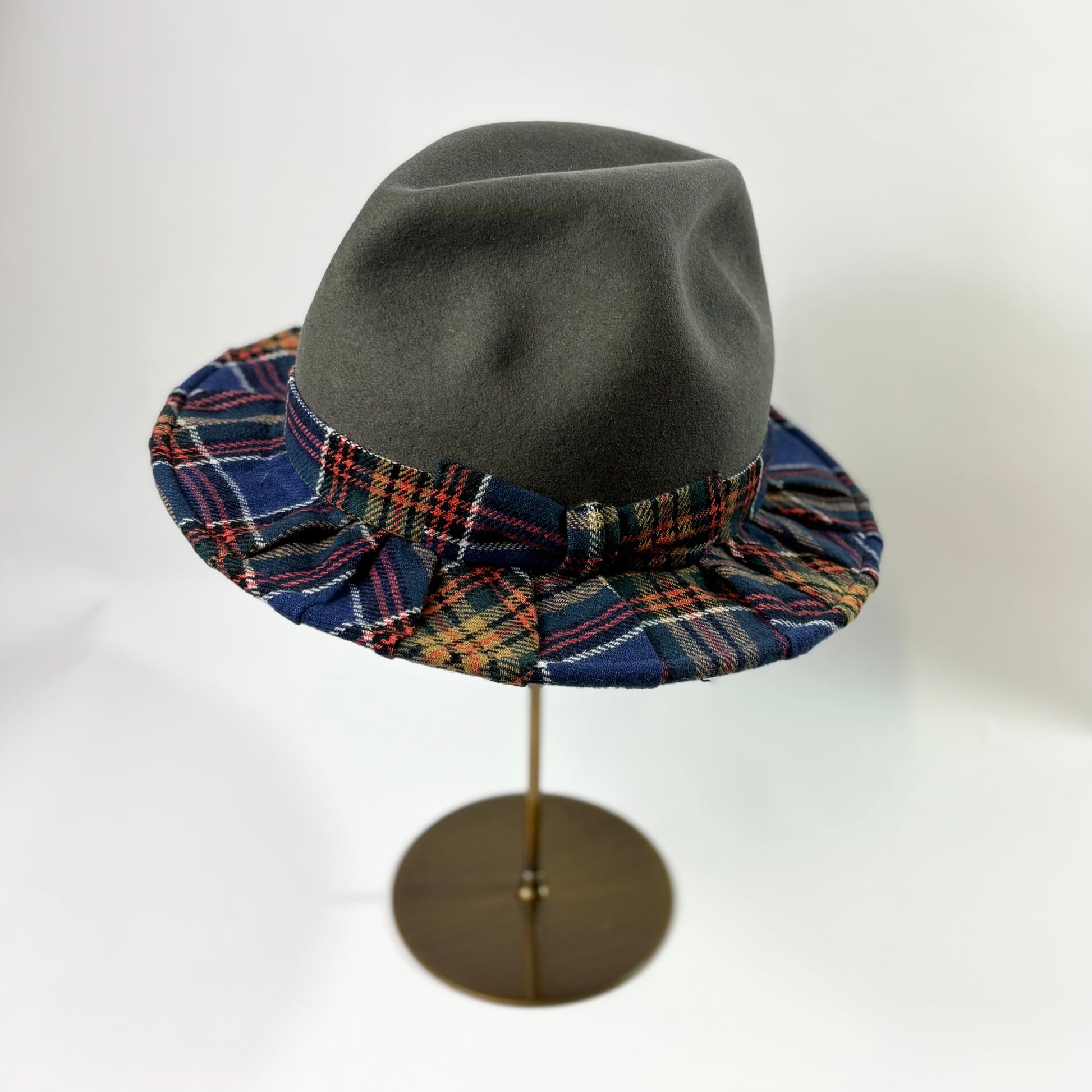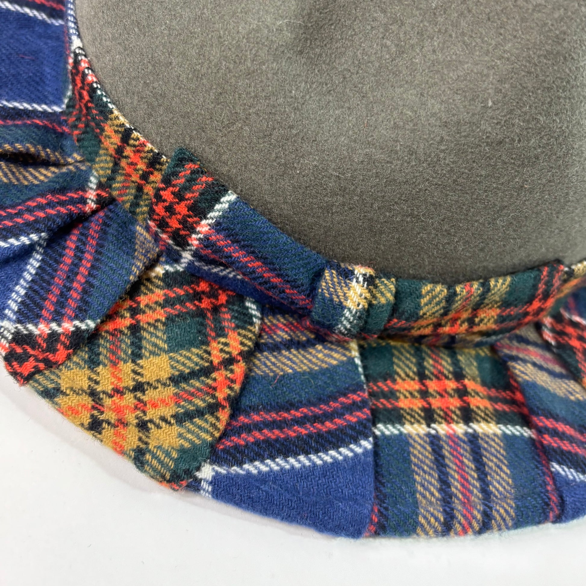 マウンテンハットにタータンチェックを履かせたパンキッシュなハット。 スコットランドの伝統的な男性用衣装「キルト」 (格子縞(タータン)柄のスカート状のもの)からインスピレーションを得てデザインしました。 ブリム上のタータンチェック生地は手作業でプリーツを作りフェルト部分と一緒に型入れをしてから縫い付けてあります。リボン部分にもタータンチェック生地を使用。