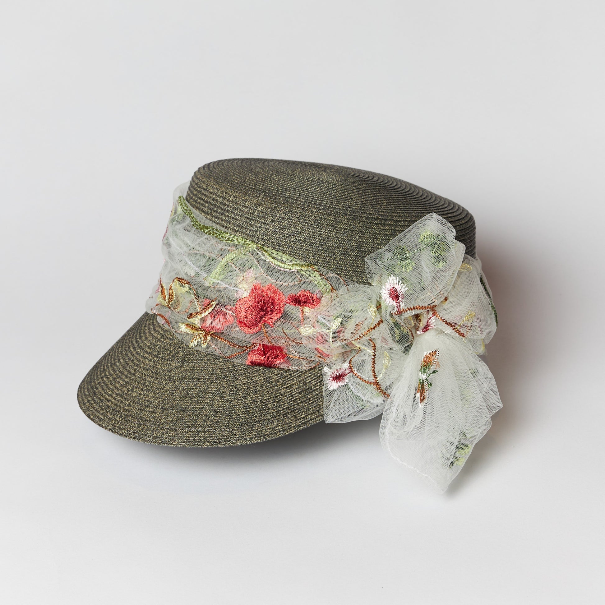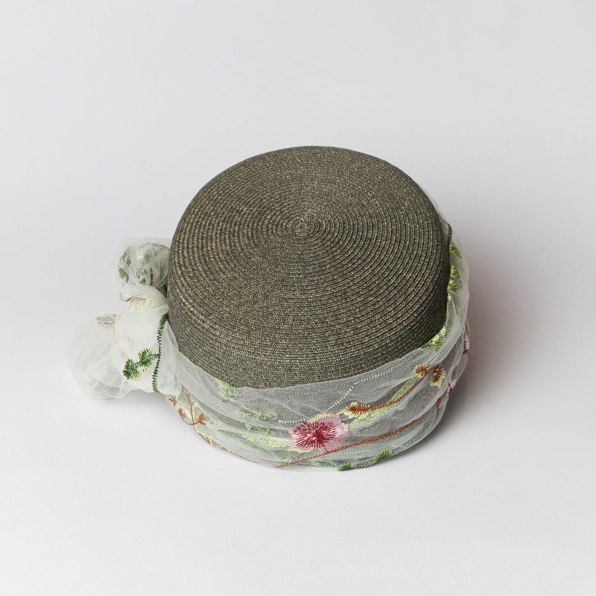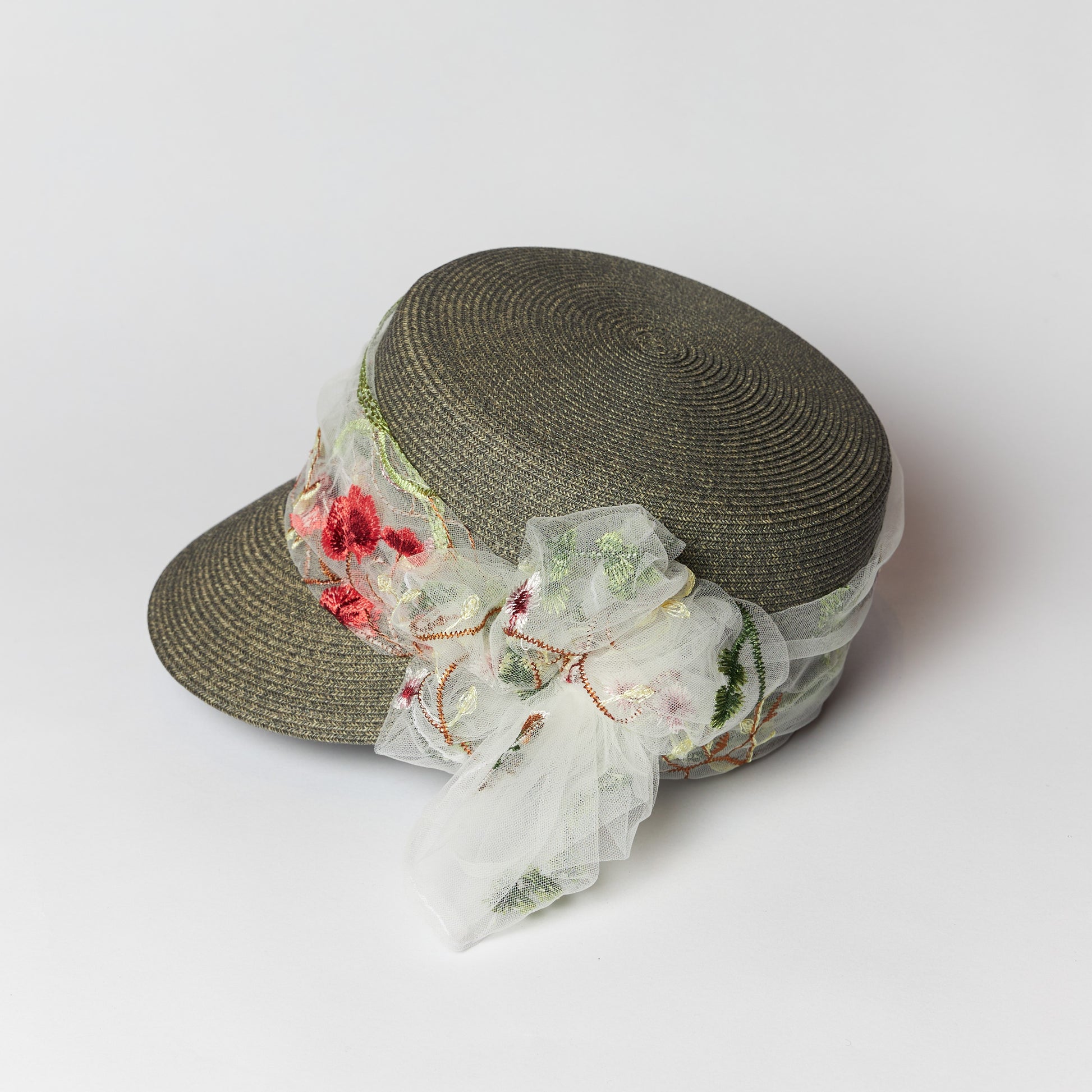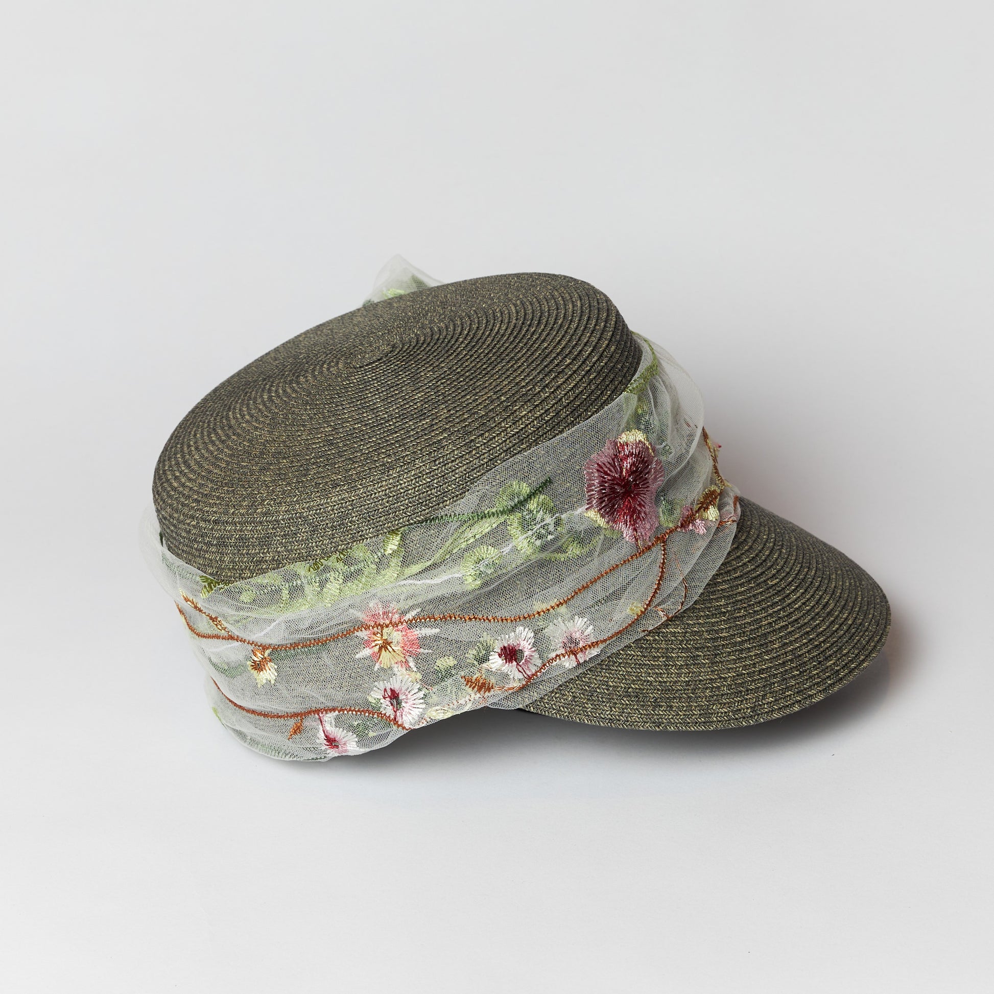 ペーパーブレードキャップに花の刺繍が入ったチュールを巻いてファンシーに仕上げました。