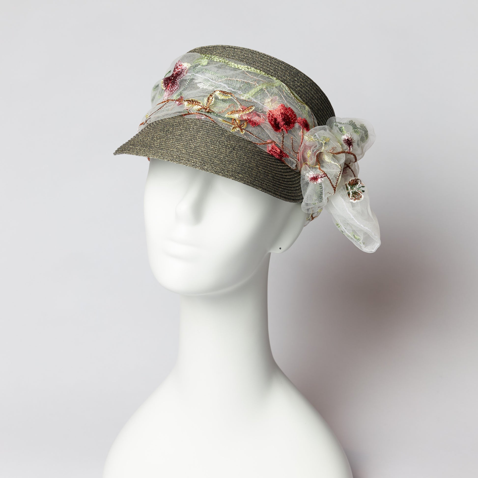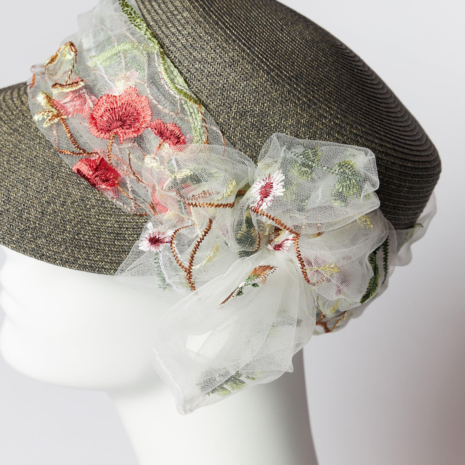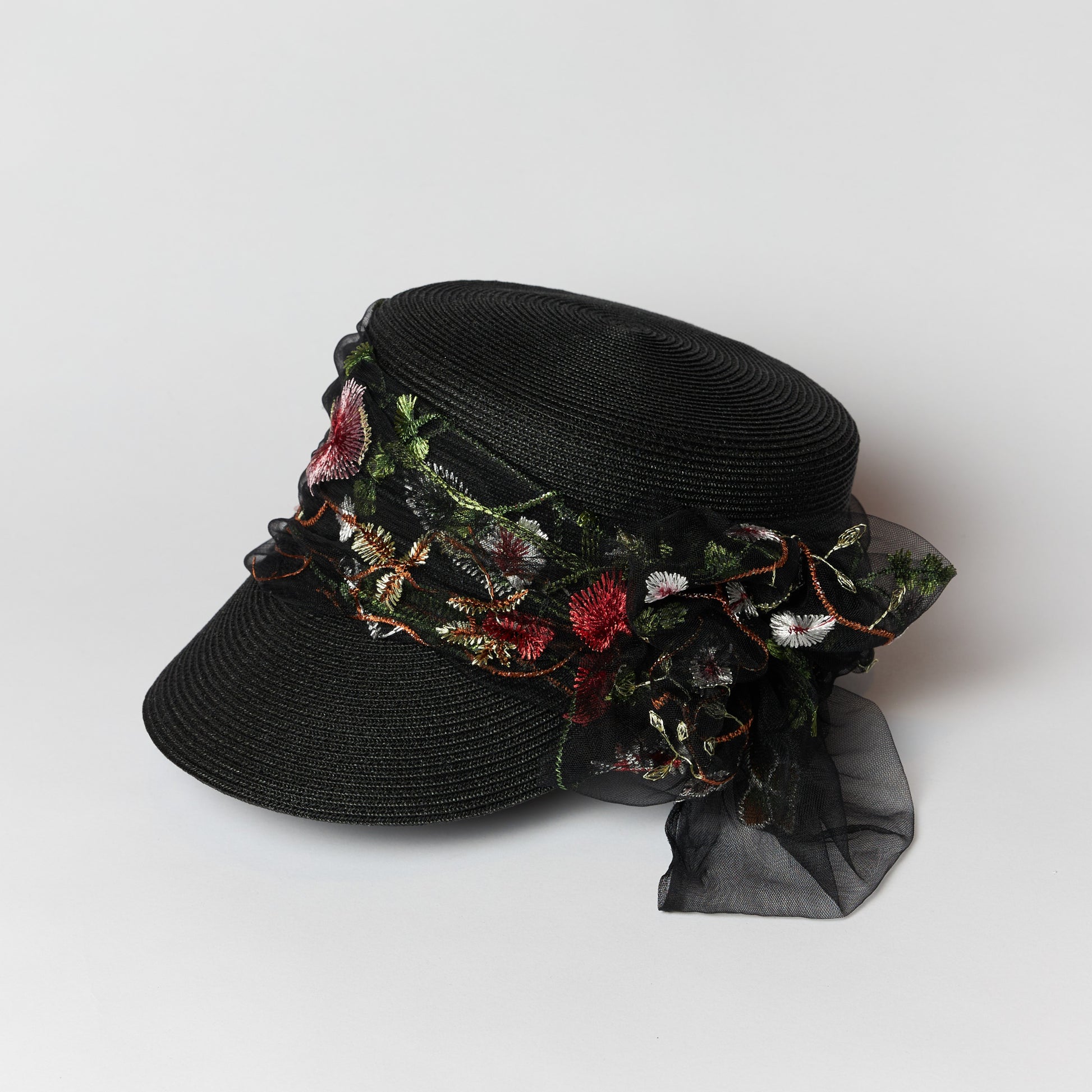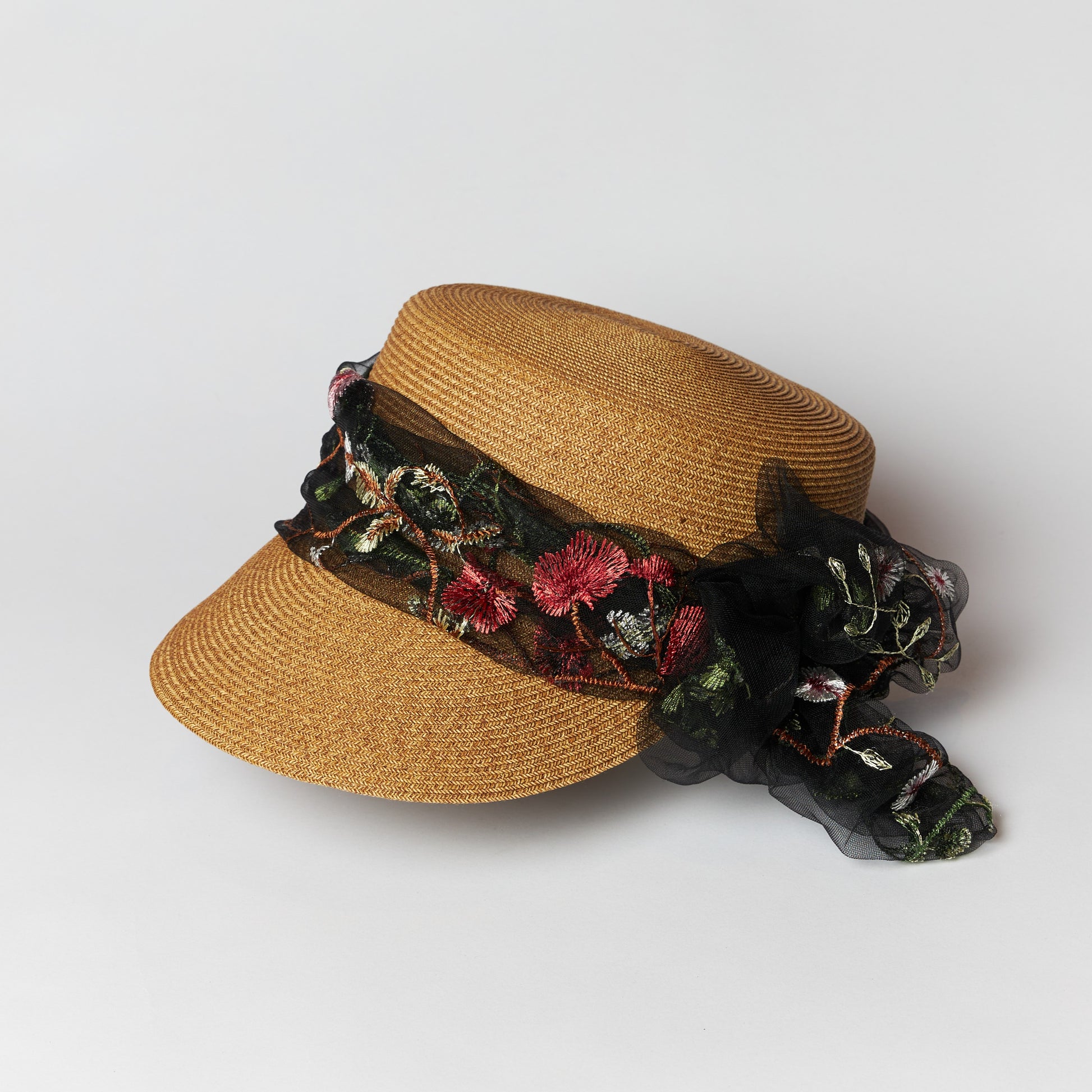 ペーパーブレードキャップに花の刺繍が入ったチュールを巻いてファンシーに仕上げました。