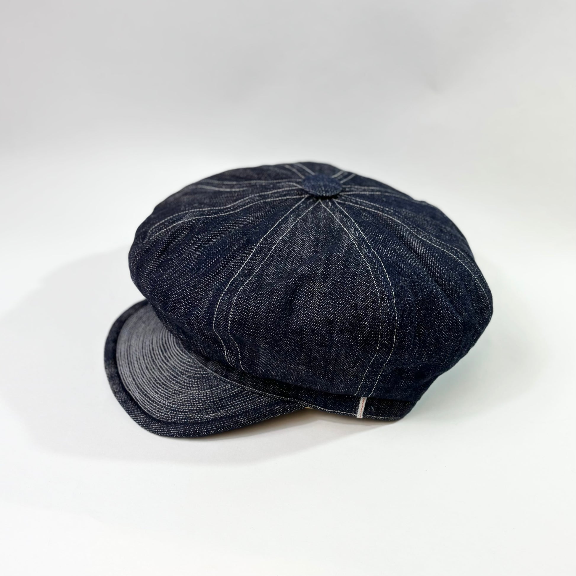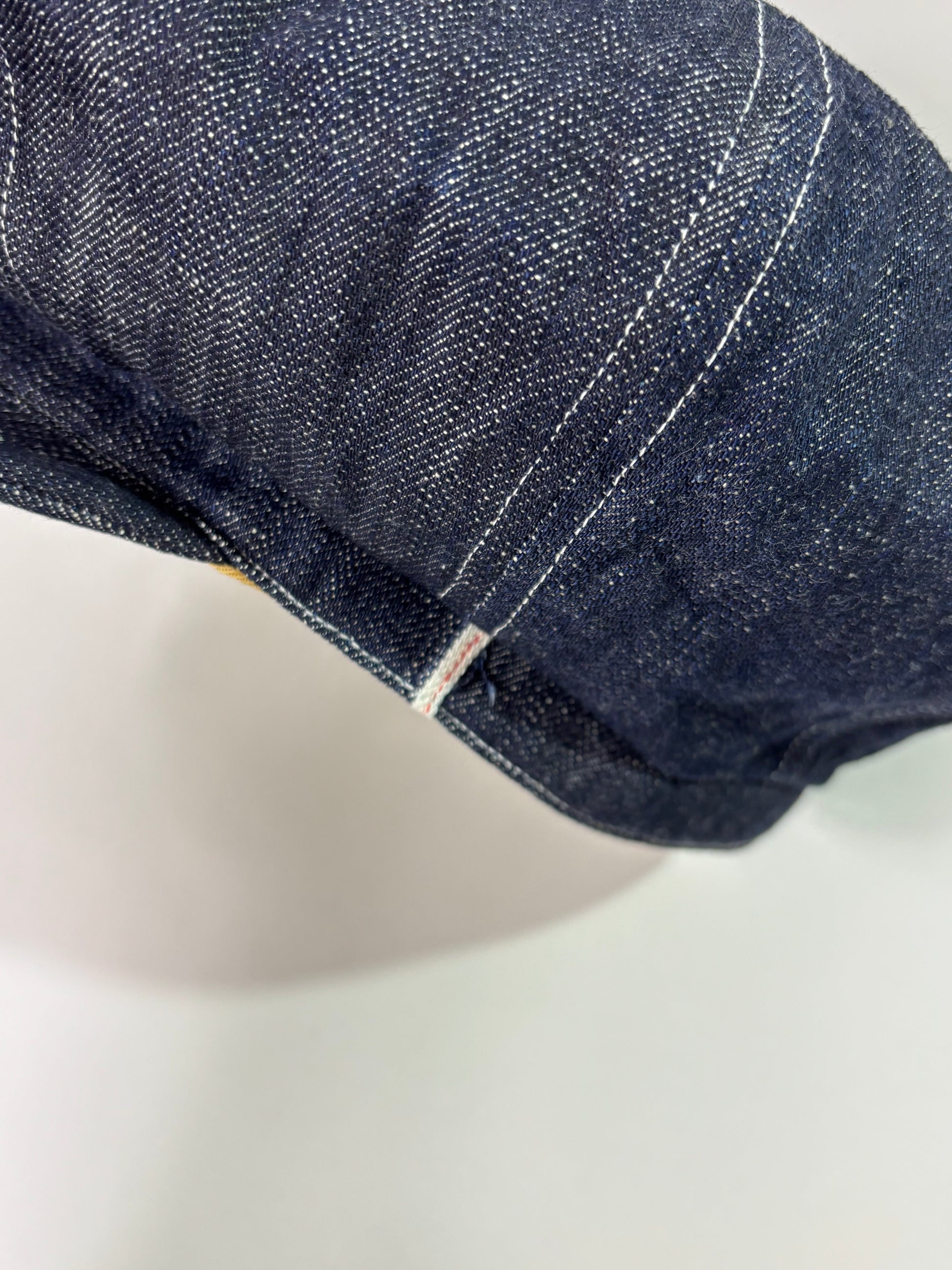 コーンデニム社 ホワイトオーク工場による2000年代製造の12.7オンス コーンデニム生地を使用したキャスケット。 8パネルのおおぶりなクラウンに直径30mmの大きな天ボタンを使用し、腰パーツのサイドにはセルビッチ(赤耳)を使用。 ブリムは職人技の細かいステッチ。ステッチ幅の細かさと運針の細かさは唯一無二です。 縫製は全て綿糸使用。 内装にも拘り伏せテープは綿綾テープ。 スベリはオリジナルiステッチスベリ使用。 クラウンのボリュームを後ろや横にしてキャスケットとして被ったり、ボリュームをフロント側にしてニュースペーパーボーイキャップとしても被れます。